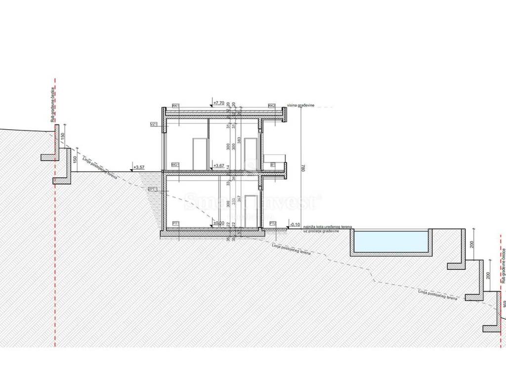 Projekt predviđa izgradnju moderne vile sveukupne površine 350 m2 s luksuznim sadržajima. U prizemlju je planiran prostrani dnevni boravak s kuhinjom i blagovaonicom, sauna, kupaonica, vešeraj i strojarnica, dok se na katu nalaze četiri spavaće sobe, svaka s vlastitom kupaonicom. Ispred vile je predviđena natkrivena terasa i bazen površine 50 m2, savršeni za opuštanje i uživanje u prekrasnom pogledu na Jadransko more.