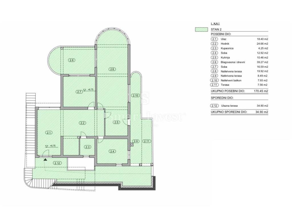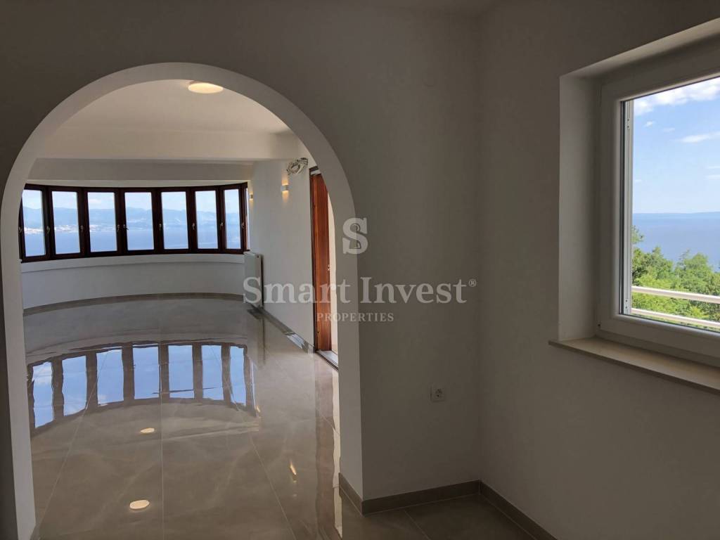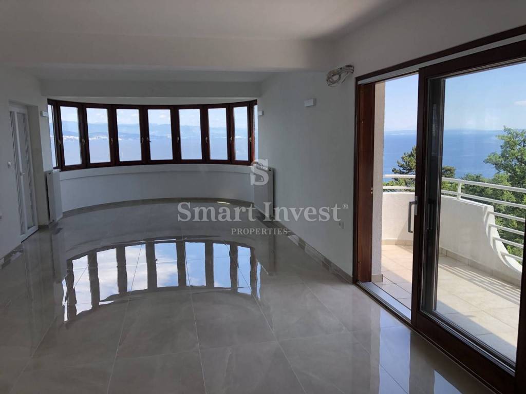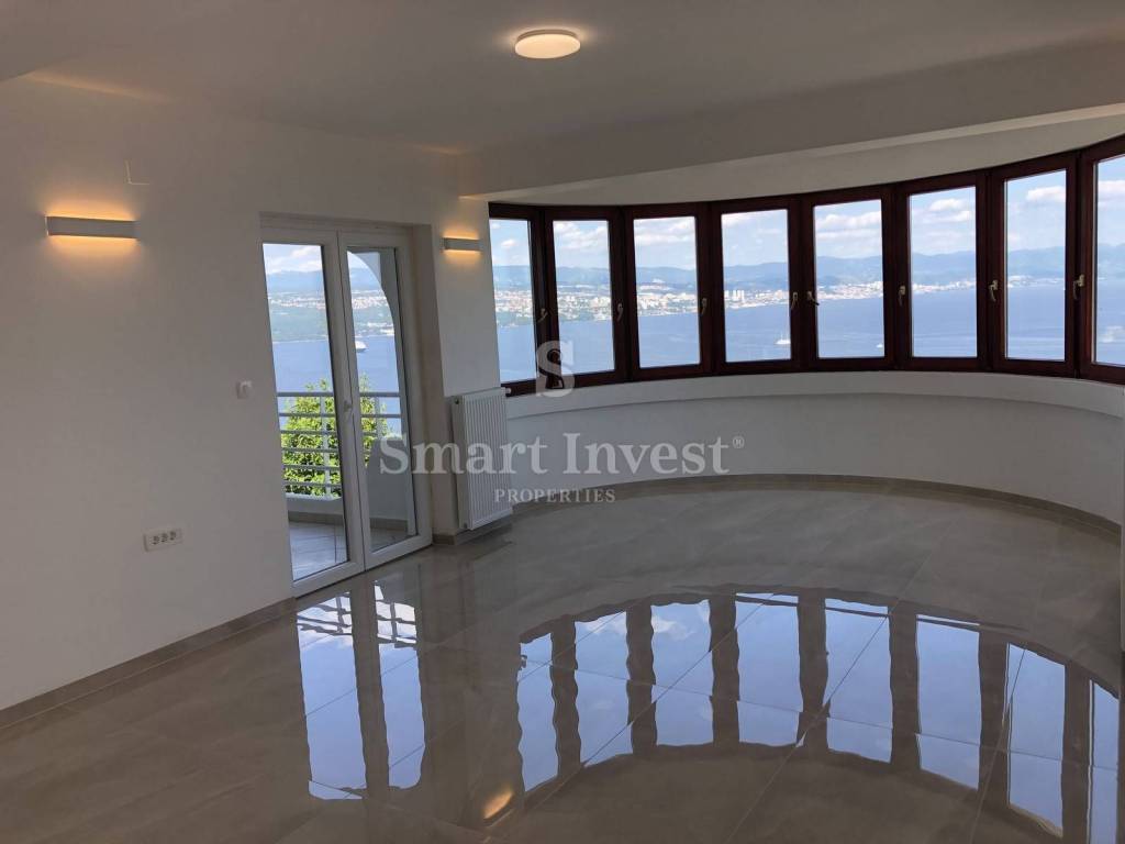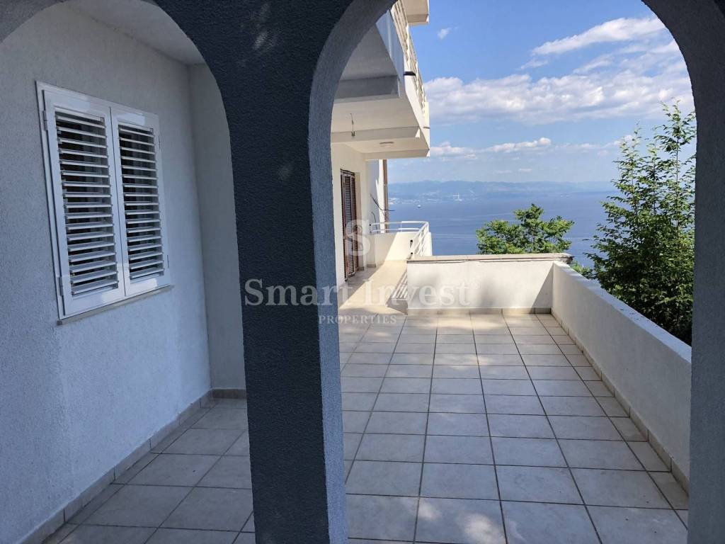 This spacious apartment is located on the first floor of a villa with three residential units. It consists of an entrance terrace, an entrance, a hallway, two bedrooms, a bathroom, a kitchen, a living room with a dining area, and several terraces with a fantastic panoramic view of the entire Kvarner Bay.