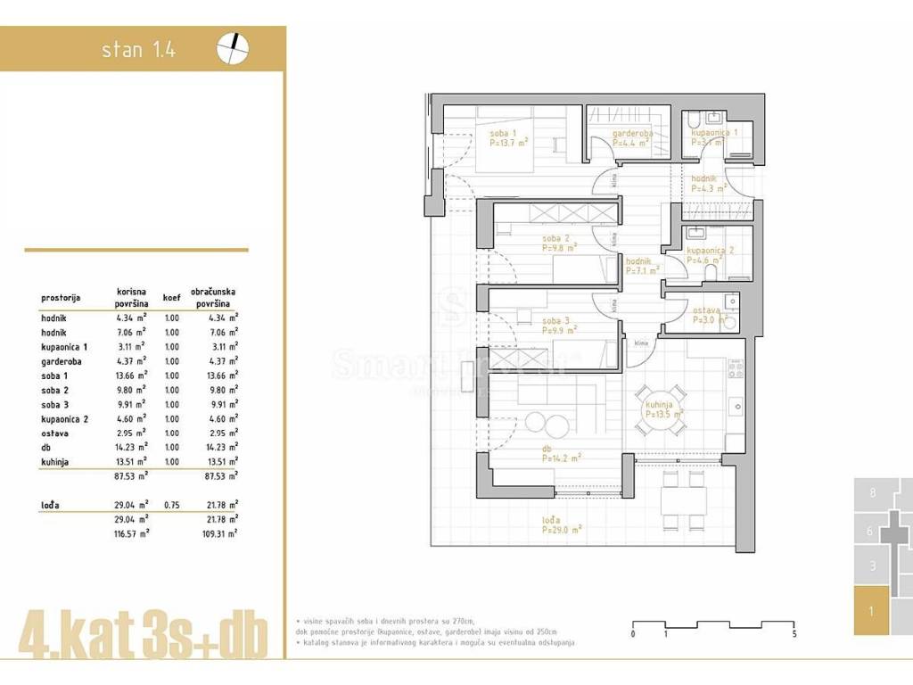 APARTMENT 1.4 - 4th floor, with a net area of 109.31 m2 consists of a corridor, living room with kitchen and dining area, 3 bedrooms, one of which has a walk-in dressing room, 2 bathrooms, storage room (total interior area 87.53 m2 ) and loggia of 29.04 m2. The apartment also has a separate storage room SP28 of 2.21 m2.