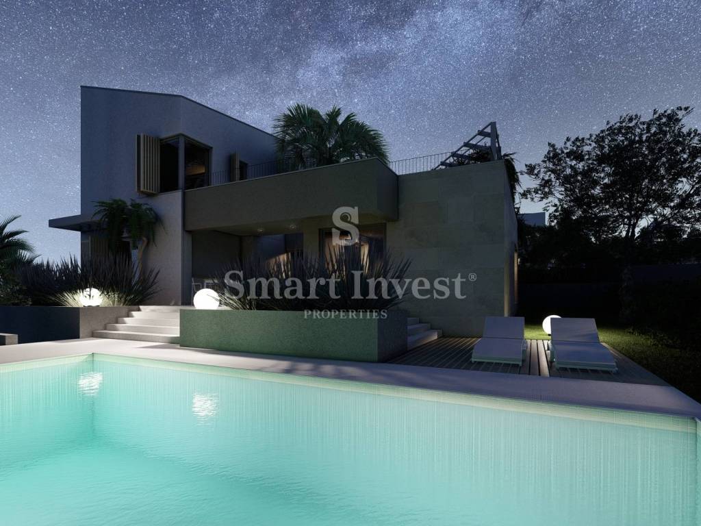 The exterior of the villa is just as spectacular as the interior. The landscaped grounds include a 32 m swimming pool, a sunbathing area and a spacious terrace with a summer kitchen, ideal for socializing and spending time outdoors during warm days.