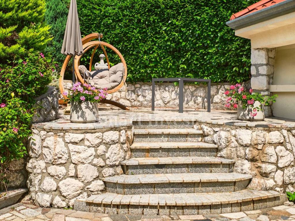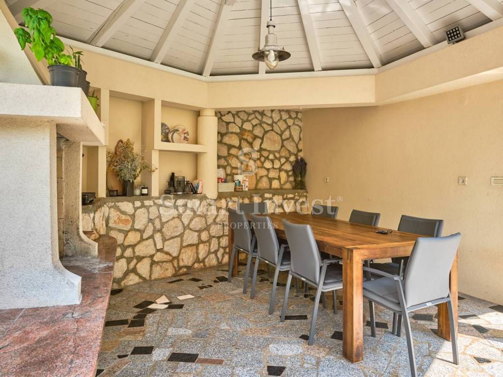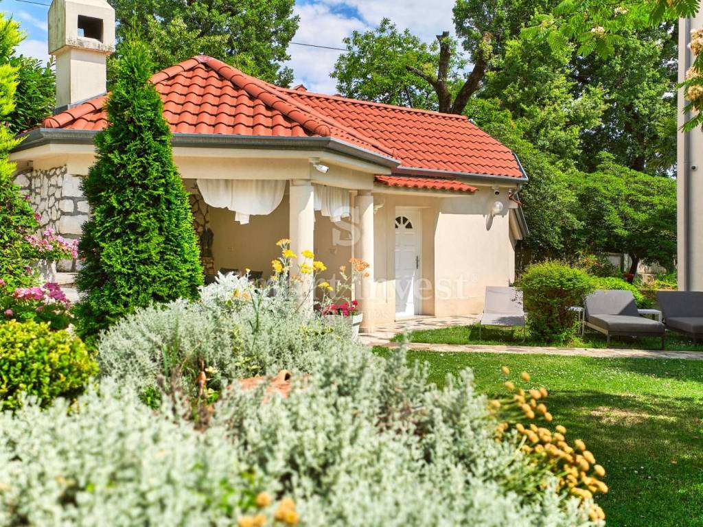 In a beautiful yard full of greenery, there is a double garage and additional parking spaces, large garden, children's playground and pavilion with a summer kitchen and barbecue, a kitchen and a toilet.