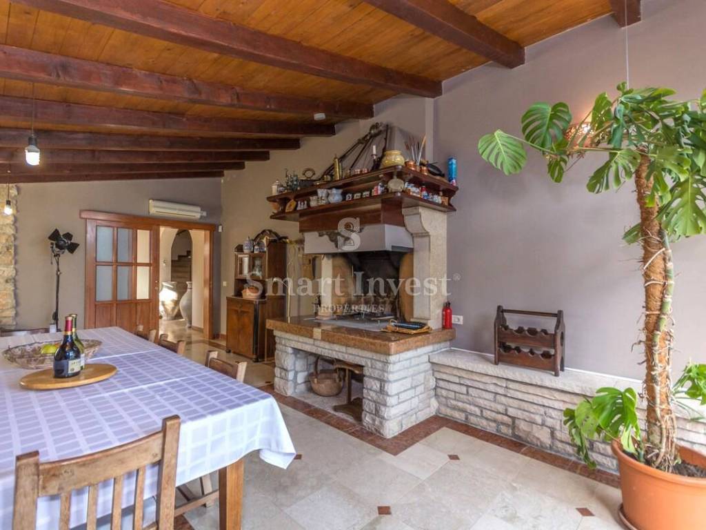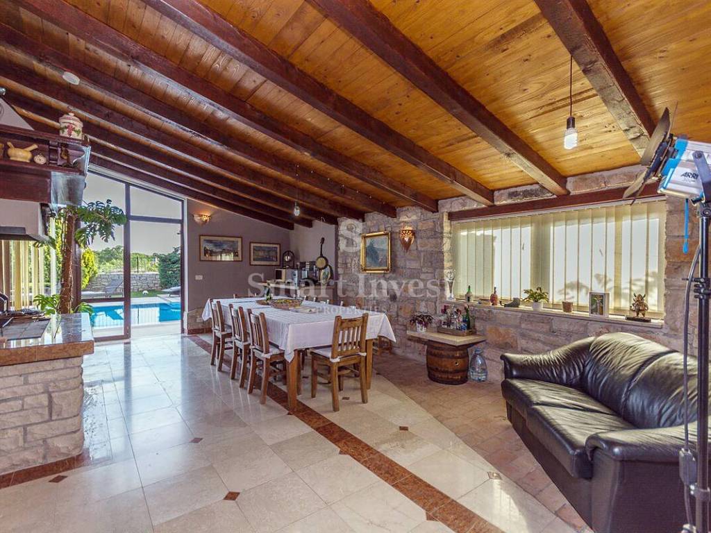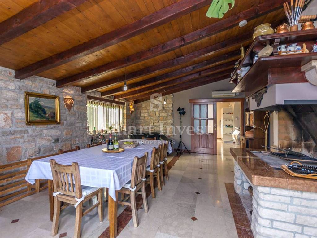It consists a spacious living room with a beautiful fireplace and large glass walls that provide a beautiful view, kitchen and large dining room, 4 bedrooms, 3 bathrooms, toilet, spacious study (which can be converted into another bedroom), storage room. On the ground floor there is also a beautifully decorated tavern with an open fireplace for socializing.