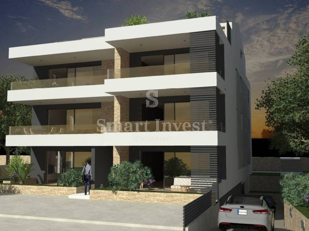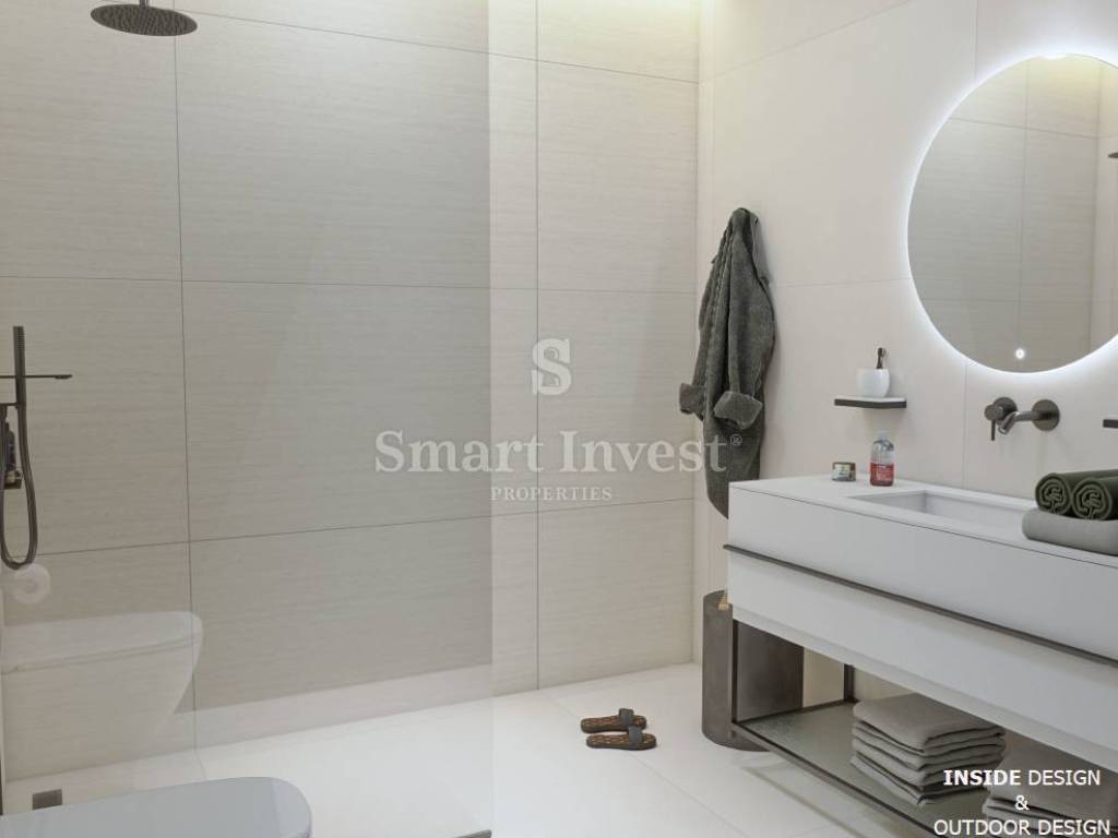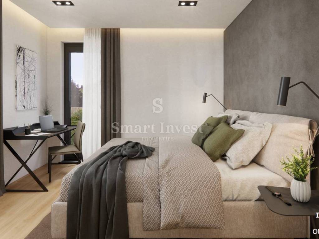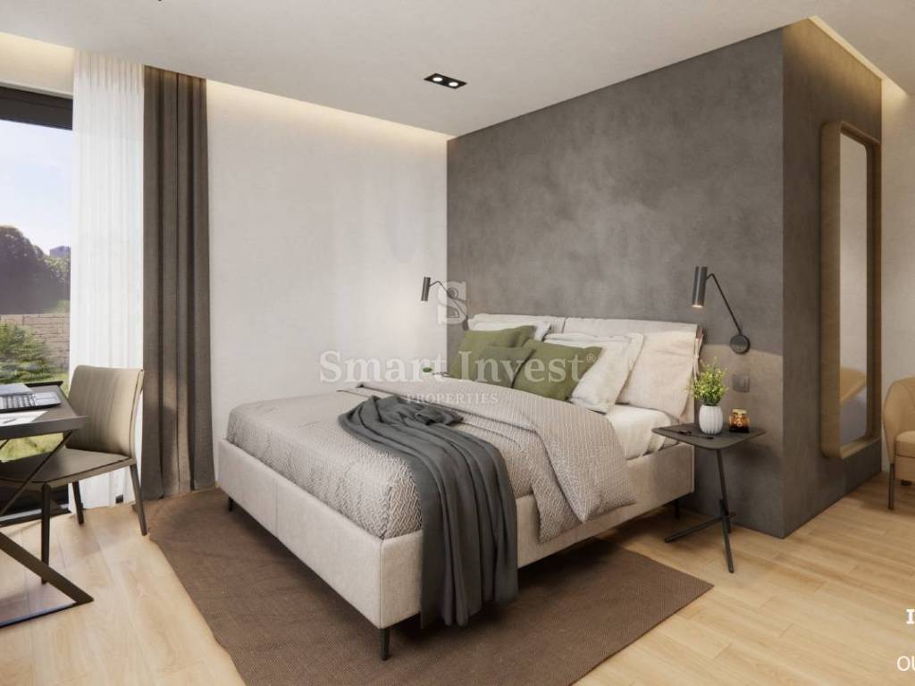 The apartment consists of an entrance corridor, spacious living room with kitchen and dining area and with access to a covered terrace of 19.56 sqm, 2 comfortable bedrooms each with its own bathroom, guest toilet, storage (internal area 102.27 sqm + covered terrace 19.56 sqm). The apartment owns a garden of 40 sqm, garage of 13 sqm and a separated storage of 6.20 sqm at the basement of the building.