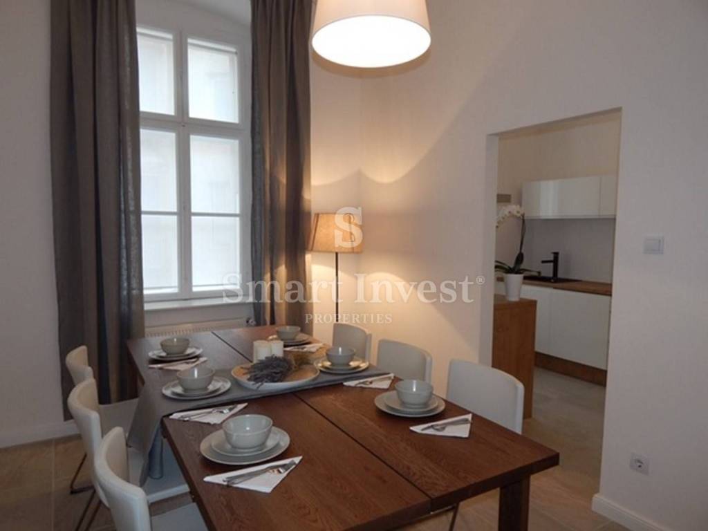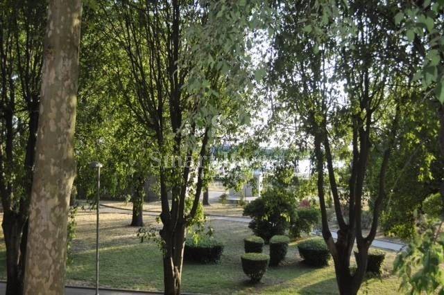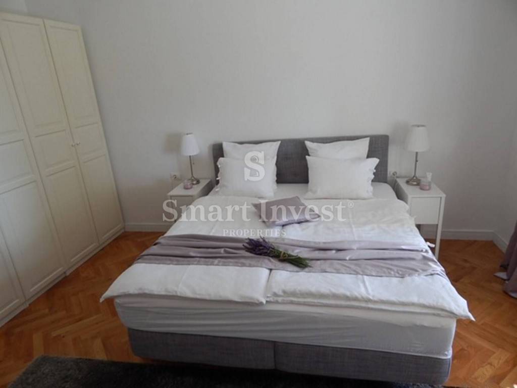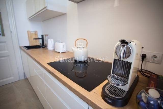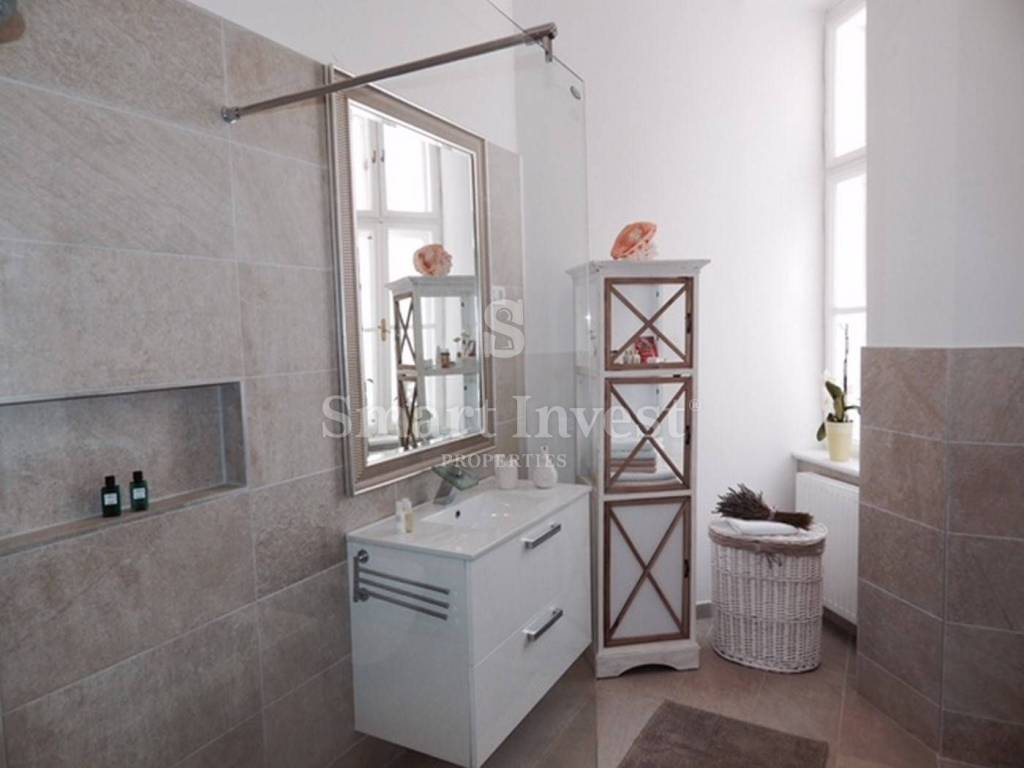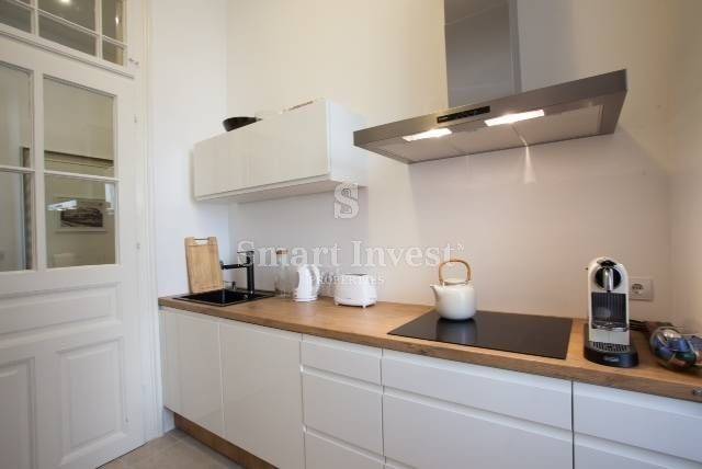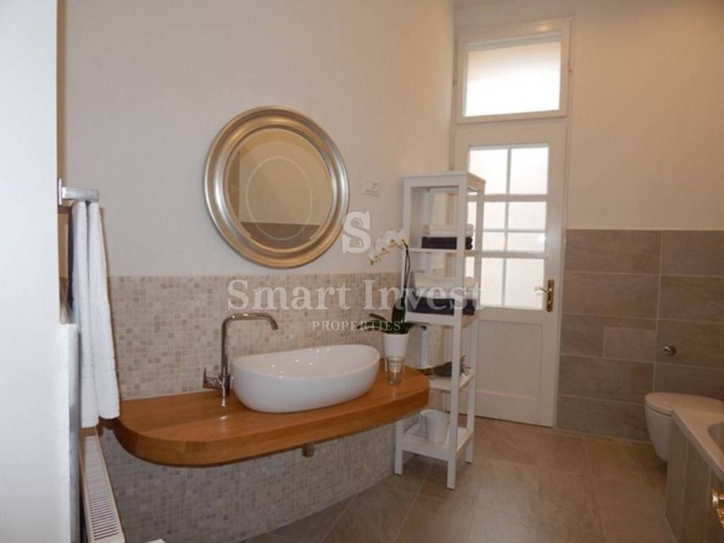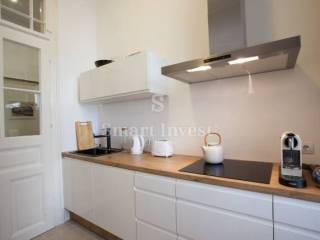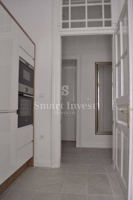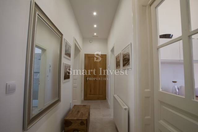 Beautiful parquet and stone tiles, large double doors and windows give the apartment a luxurious look.