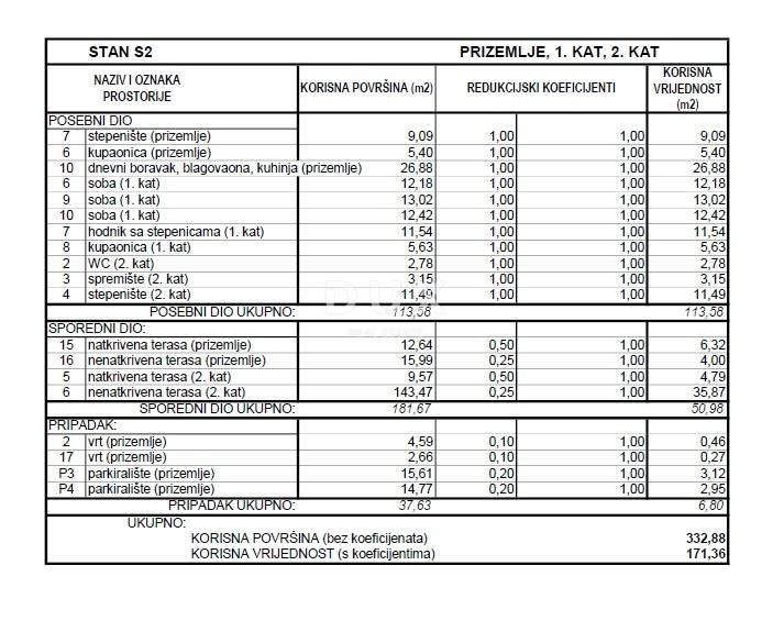 The apartment is spread over three floors ground floor, first floor and roof terrace with a total net usable area of 171.36 m, while the total area with associated amenities is an impressive 332.88 m.