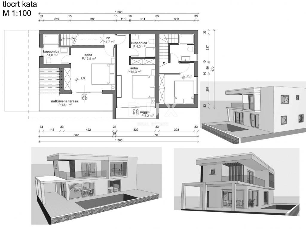The yard is decorated in a Mediterranean style, with a 9 x 4 meter turquoise-blue swimming pool and a sunbathing area for complete enjoyment. The second part of the villa has a separate entrance and consists of a living room with a kitchen and a bedroom with a bathroom on the first floor (38 m in total). The villa has two parking spaces and a 10 m engine room that can be used as an additional storage room.