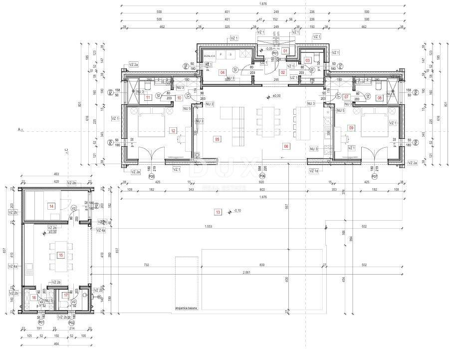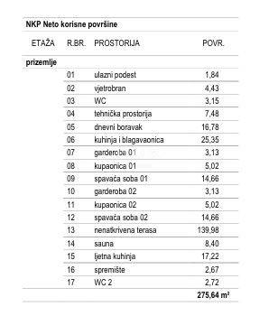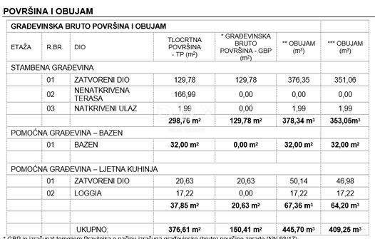 Za građevinsku parcelu ishođena je pravomoćna građevinska dozvola te postoji gotov projekt za montažnu kuću modernog dizajna, s pomoćnim objektom (ljetna kuhinja, sauna) i vanjskim bazenom. Neto korisna površina objekata iznosi 275,64 m.