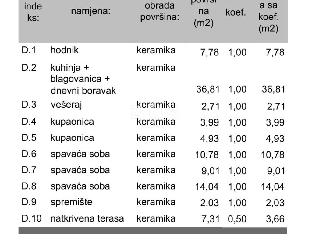 LOCATION DESCRIPTION: Veli Vrh is one of the most desirable neighborhoods in the city of Pula. Given that this neighborhood is home to some of the best schools and kindergartens, and given the excellent connections to the city center and the beautiful beaches in nearby Štinjan and Fažana, this is exactly what makes Veli Vrh a location of interest. Right on Veli Vrh, slightly set back from the main road, is this beautiful modern building. PROPERTY DESCRIPTION: A new, modern building with its own underground garage and elevator is starting construction and is looking for its new tenants and owners. The building consists of 4 residential units, each of which is equipped with underfloor heating with a heat pump, inverter air conditioners in each room of the apartment, a combination of ceramics and parquet as floor coverings, electric shutters and mosquito nets on all windows, and an excellent layout of the rooms and the floor plan itself that provides comfort and a pleasant stay. APARTMENT DESCRIPTION: Building B, apartment D! Penthouse! The apartment consists of an entrance hall, living room with kitchen and dining room, three bedrooms, two bathrooms, laundry room, storage room and covered terrace with a total living area of 95.74m2. The apartment also includes a storage room and parking spaces in the underground garage (no. 3 and 4). With all other accessories that we calculate according to the given coefficients, we arrive at a total area of 113.66m2. For all additional information about the property and arrangements for viewing it, call your agent!