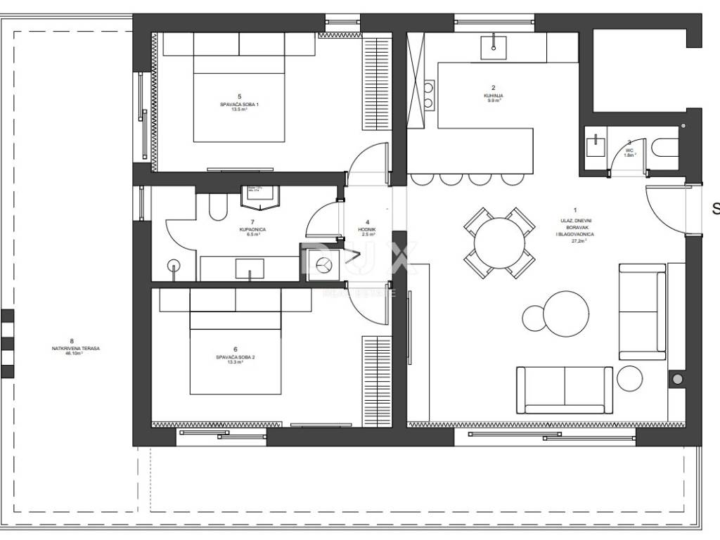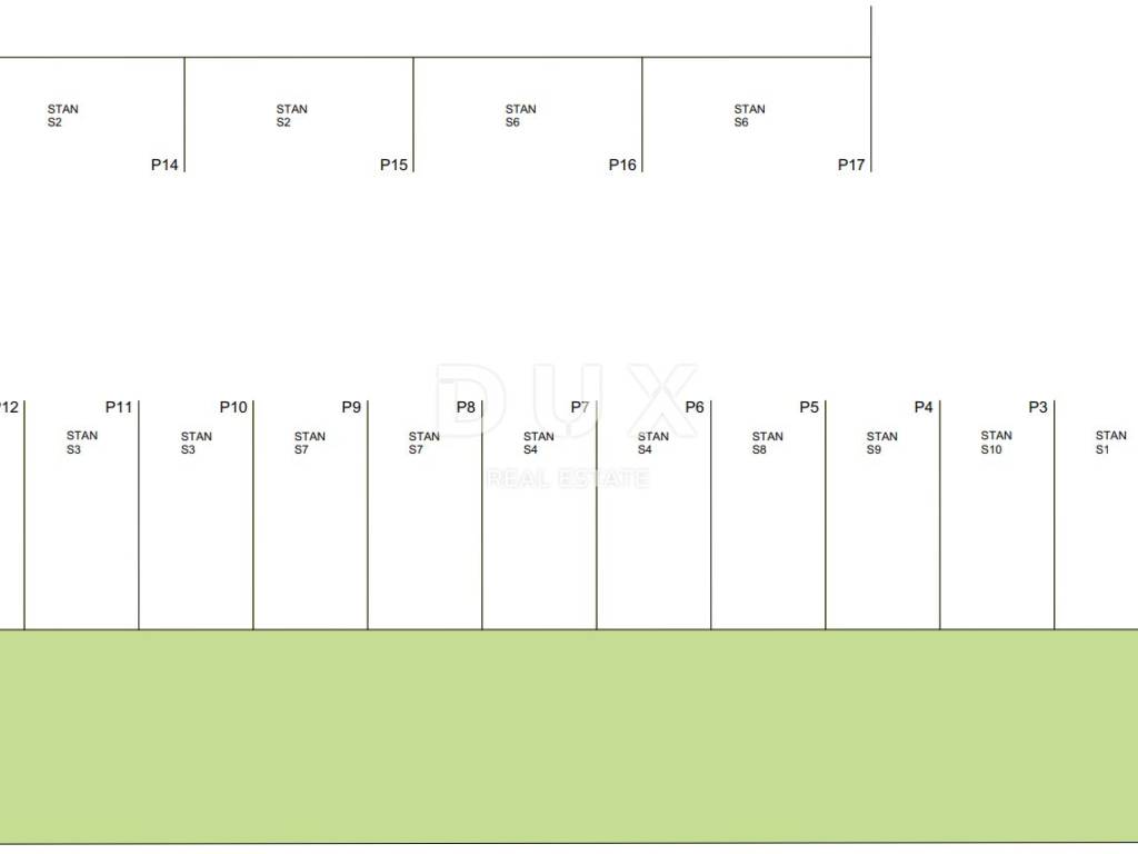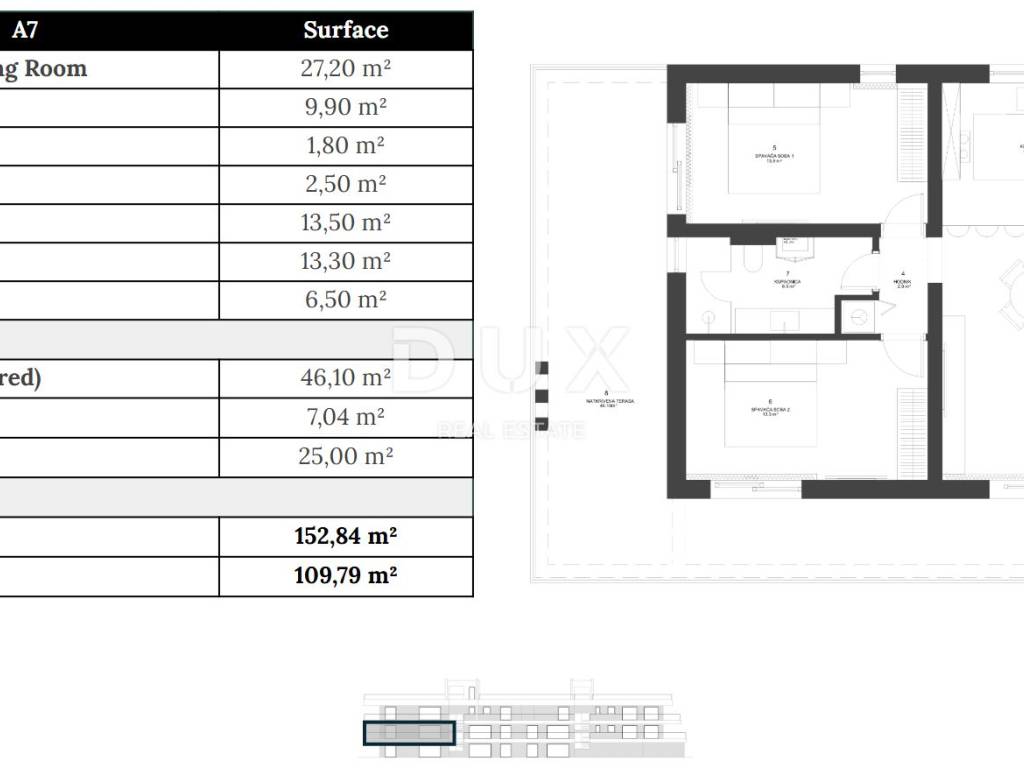 In the quiet and charming town of Zaton, just 45 meters from the beach, there is a new modern building with two entrances and two elevators that hides ten exclusive apartments. Each one has been carefully designed to provide maximum comfort and enjoyment - the ground floor apartments are enriched with private gardens, the apartments on the middle floors have spacious terraces, while the penthouses offer rooftop oases with installations for summer kitchens and jacuzzis, ideal for relaxed evening gatherings at sunset. All apartments are equipped with air conditioning in every room, while the penthouses additionally have underfloor heating throughout the interior. Apartment A7 on the first floor with a net area of 109.79 m2 combines functionality and elegance. The layout includes two bedrooms, a bathroom, an additional toilet, a kitchen and a bright living room. What sets it apart is the spacious covered terrace that perfectly connects the indoor and outdoor spaces. The apartment also comes with two parking spaces and a storage room, and the equipment includes electric shutters, security doors and a video intercom. Buyers also have the option of taking over the fully furnished interior, which allows them to move in without additional worries. A special benefit the buyer is exempt from paying real estate tax because the seller is a legal entity. Zaton is known for its long pebble beaches, crystal clear sea and peaceful atmosphere that combines the traditional Dalmatian atmosphere with modern amenities. In the immediate vicinity there is a resort with numerous amenities restaurants, cafes, sports fields and wellness programs, which makes this place ideal for both vacation and life throughout the year. Just a ten-minute drive away is Zadar, a city rich in history and culture, world-famous for its Roman forums, Romanesque churches, the Sea Organ and the Greeting to the Sun. If you are looking for a combination of luxury, comfort and a Mediterranean lifestyle, contact us for more information and to arrange a tour.