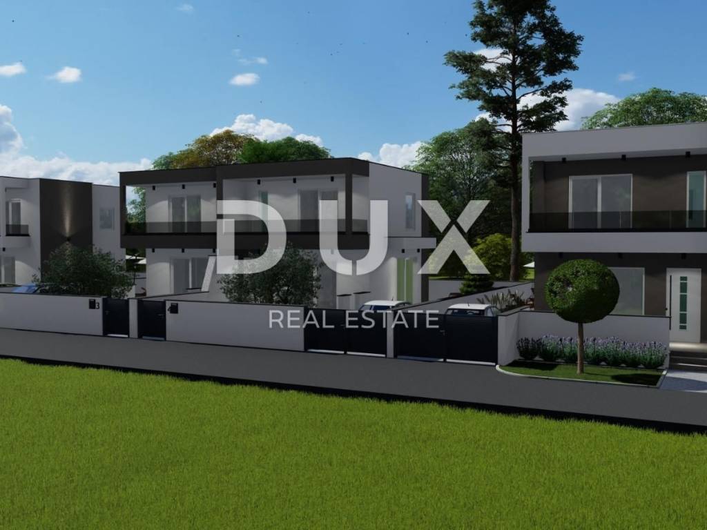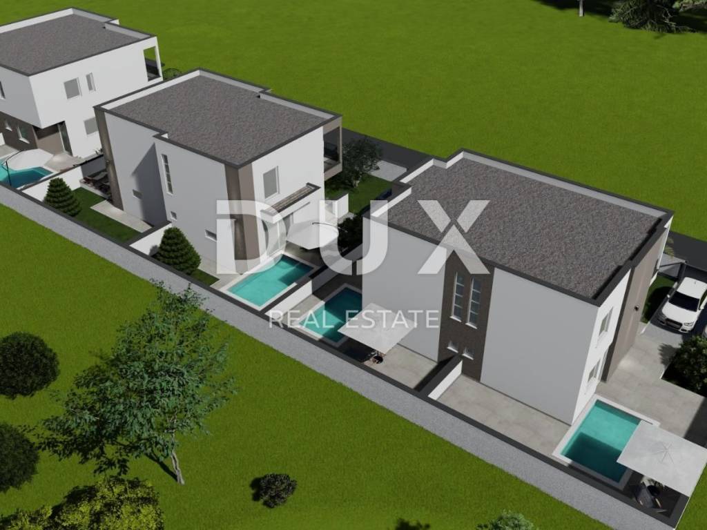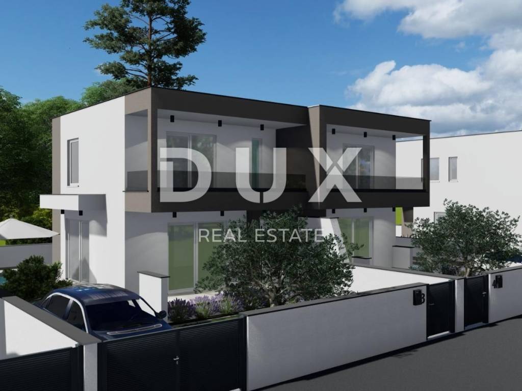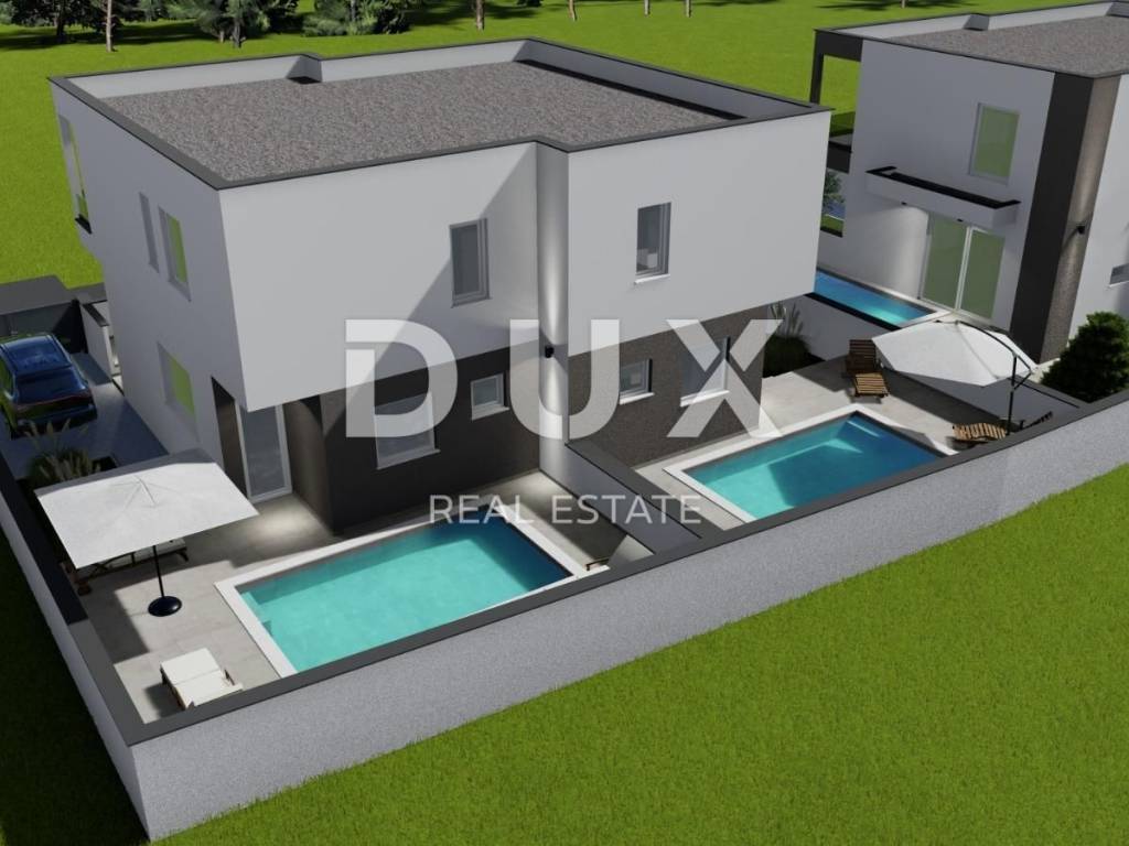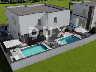 In the peaceful and family-friendly setting of Poličnik, just a ten-minute drive from Zadar, a modern semi-detached house with a swimming pool is being built - perfect for a pleasant and quality family life. On the ground floor there is a spacious living room with access to the terrace, a modern kitchen with a dining room, a pantry, a guest toilet and a beautifully landscaped garden, ideal for relaxation or children's play. On the first floor there are three comfortable bedrooms, the main one of which has its own dressing room and access to the terrace, as well as a modern bathroom. The project includes a total of three duplex villas, each with its own swimming pool and a fenced garden. The first villa is currently under construction, and the completion of the works is scheduled for spring 2026. Each house consists of a ground floor and an upper floor, connected by internal stairs, while the garden will be enriched with Mediterranean vegetation, with a secured parking space and a 15 m2 swimming pool. The construction is carried out according to high standards: walls made of thermo block bricks, facade insulated with 8 cm of polystyrene, PVC joinery with triple glazing, roller shutters and mosquito nets. Four air conditioners are provided for heating and cooling one in the living room and one in each bedroom. Underfloor heating is installed in the bathrooms, and in the early stages of construction there is a choice between tiles, parquet or laminate for floor coverings. Poličnik is a place that combines a peaceful, family atmosphere with the proximity of all important amenities schools, shops and transport connections. The city of Zadar, only a ten-minute drive away, offers all the advantages of an urban environment beautiful beaches, rich cultural heritage, restaurants, promenades and numerous amenities for all generations. If you are looking for a quality home in a peaceful environment, yet close to the city, this is an ideal opportunity. Contact us for additional information and a viewing!