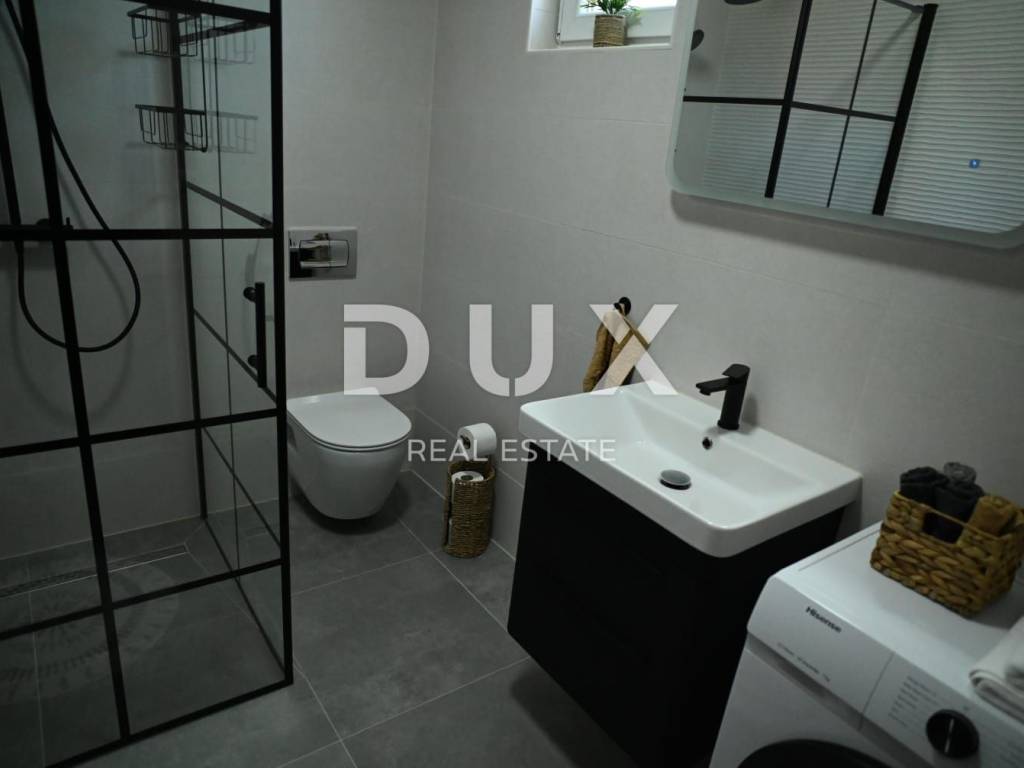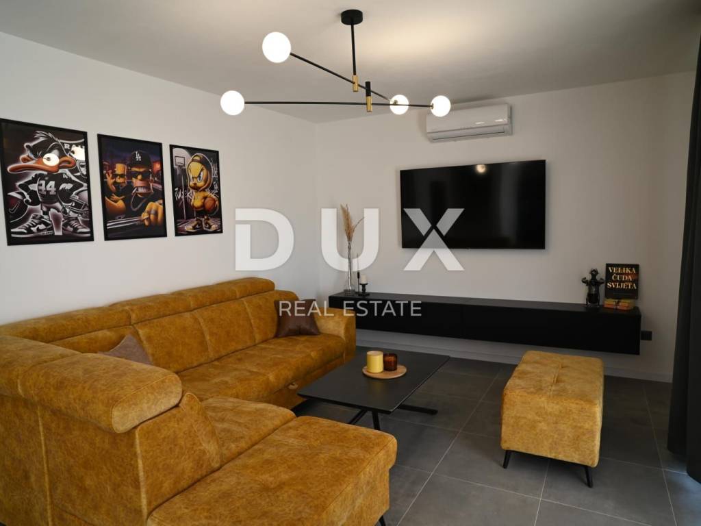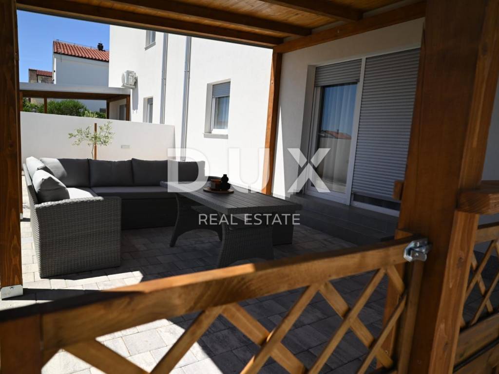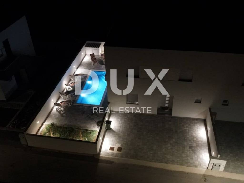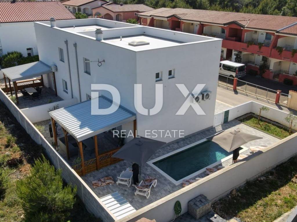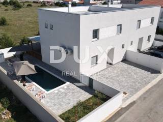 For sale is a modern semi-detached villa with a swimming pool located in a quiet location in Vir, in the only part of the island that has a connection to the sewage system and water supply. It is only a 6-minute walk from Straža beach and 10 minutes from the popular Miljkovica beach, ideal for enjoying summer fun without the need for a car. This spacious villa consists of a ground floor and an upper floor. The ground floor has a living room connected to the kitchen and dining room, a bedroom, a bathroom, a storage room and access to a large terrace that is partially covered with a pergola, a perfect place to relax in the shade. In the extension there is a beautifully landscaped courtyard with a private swimming pool that provides complete privacy and peace. Upstairs there are two additional spacious bedrooms, each with its own bathroom, as well as a large laundry room that can be easily converted into an additional children's room. The villa is equipped with underfloor heating and air conditioning in all rooms, which ensures comfort throughout the year. It has three parking spaces, is being sold fully and modernly furnished, ready to move in without additional investment. The ownership is neat 1/1, and the property also has a usage permit, which makes it ideal for both year-round living or summer vacations, as well as an extremely profitable tourist investment. Vir is an island connected to the mainland by a bridge, known for its numerous beaches, crystal clear sea and developed infrastructure. It offers the perfect combination of a peaceful family atmosphere and tourist potential - the perfect place for those looking for a home by the sea or who want to invest in the future. For more information and a viewing, feel free to contact us - this is an opportunity you don't want to miss.
