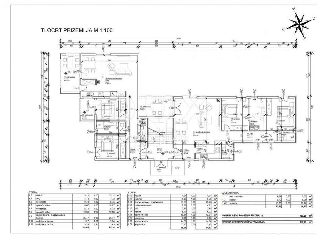 The city of Poreč, one of the most beautiful pearls of the Adriatic Sea, is located on the west coast of Istria. On the relatively small peninsula area where the city arose, traces of the meeting of the Slavic, Romanic and Germanic worlds are still clearly visible today, which at the same time bear witness to the multitude of changes - political, social and ethnic - that this Istrian town has experienced in history. The history of Poreč is a history of constant changes, movement and turmoil, the impermanence of the people, ups and downs, in which the history of new beginnings appears as a constant. This city constantly reveals traces of the life of many civilizations and cultures that built its urban and historical identity. Located in an excellent and quiet location in Poreč, this beautiful apartment offers an ideal combination of comfort and practicality. Only a few minutes away from the sea and the first beaches, and with quick access to the city center and all necessary amenities (restaurants, shops, school, kindergarten), this apartment is the perfect home for relaxing and enjoying the Mediterranean lifestyle. The apartment is located in a smaller residential building consisting of only five residential units, which provides additional privacy and a sense of exclusivity. Apartment B, located on the ground floor, covers a total area of 94.87 m2. It consists of a hallway, guest toilet, two spacious bedrooms, each with its own private bathroom, kitchen and living room with dining area. From the living room there is an exit to a covered terrace and a spacious garden of approx. 108 m2, ideal for relaxing moments outdoors. The apartment will have two parking spaces, and heating will be provided by electric underfloor heating. Air conditioners for heating and cooling will be installed in all rooms, while the installation for a fireplace will be prepared in the living room, providing the possibility of a third source of heating or creating a pleasant atmosphere. The floor coverings in the apartment will be defined according to the wishes of the future owner. The expected completion date of this beautiful project is autumn 2025, providing an opportunity for a perfect home in an ideal location in Poreč. Enjoy the comfort, peace and beauty of the Mediterranean atmosphere in this modernly designed apartment.