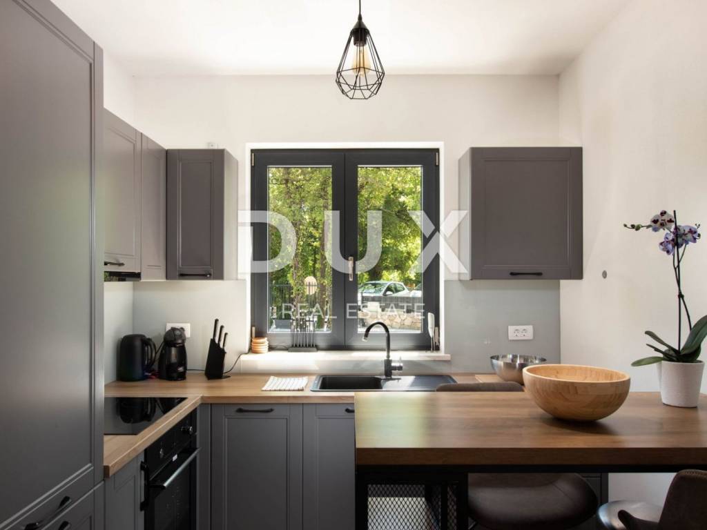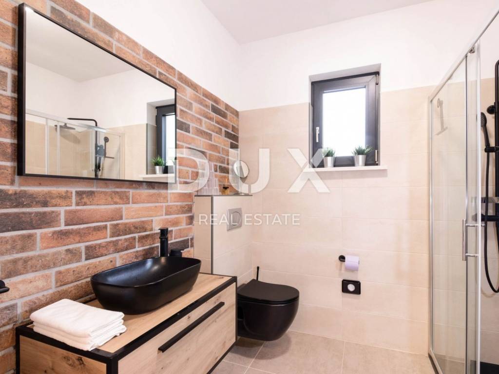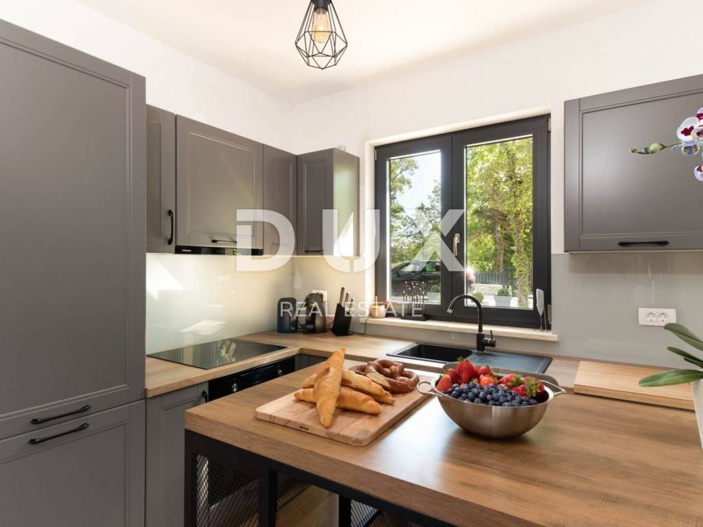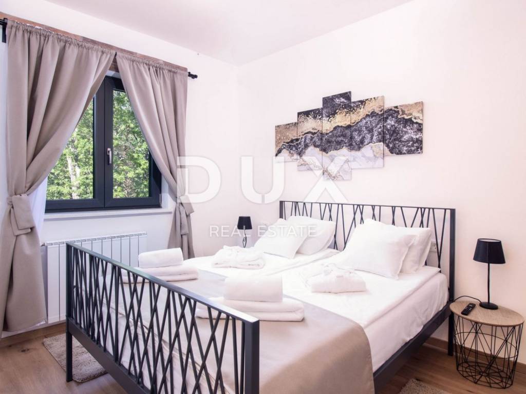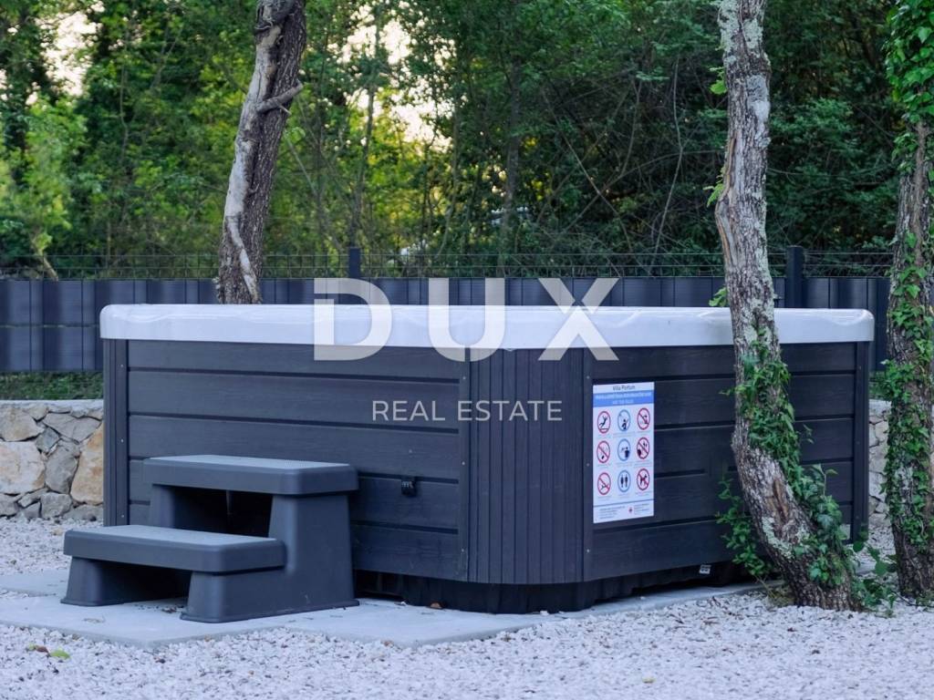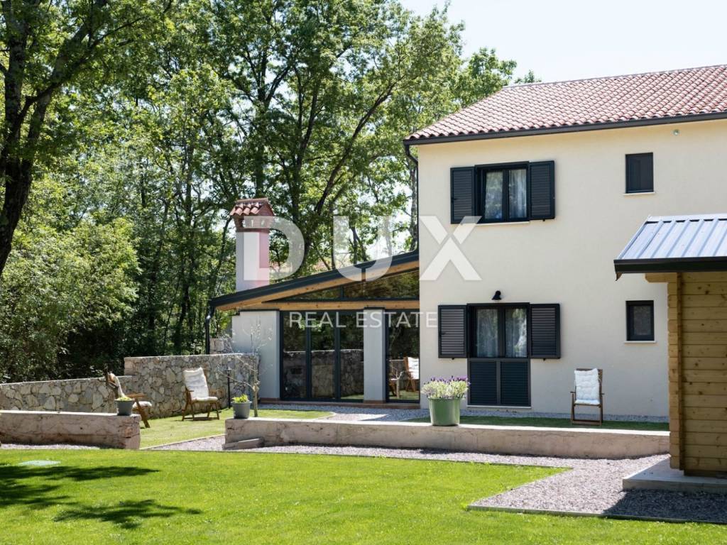On the southeastern coast of Istria, where green hills meet the sea, where nature and heritage unite, there are two towns of similar size with different but complementary characters - Labin and Rabac. The picturesque town of Labin rises on a 320-meter-high hill just four kilometers from the white pebble beaches of Rabac. Interwoven with a rich history and mining that marked this area, Labin, which was briefly declared an independent republic, is today a fascinating city of contradictions; old and new, history and present, tourism and art. Surrounded by greenery in a peaceful village near Labin, an impeccable house with a swimming pool in a secluded location is for sale. In addition to the microlocation, the property is also characterized by the quality of construction, which guarantees long-term satisfaction and quality of living. The house of timeless design blends into the village and landscape in terms of form and color. It is designed as one residential unit that extends over two tastefully decorated and well-equipped floors that exude elegance. The main entrance to the house is located on the upper floor. The floor consists of an open-concept space that unites the kitchen, dining room and living room with access to a covered terrace. The floor plan is complemented by two bedrooms and a bathroom. The lower floor contains two bedrooms, a bathroom and a storage room. The floor plan is complemented by a tavern; a space for socializing with an open fireplace, kitchen and toilet. The yard is completely fenced and decorated in an ambient and horticultural way, and complete harmony and harmony are provided by a heated swimming pool with a sunbathing area, a hot tub, an outdoor sauna and a children's playground. The excellent location and spatial organization of the interior and exterior of this property provide an opportunity for a comfortable family life or an investment in a tourist rental business.
