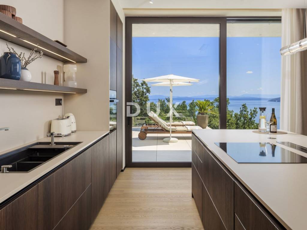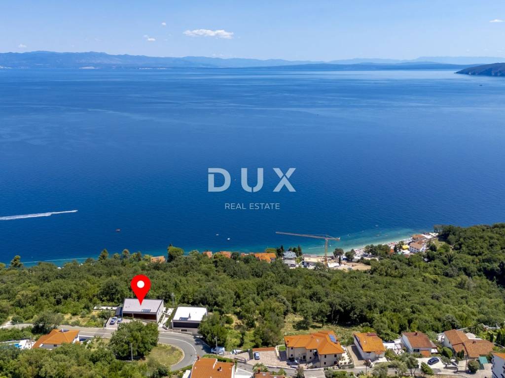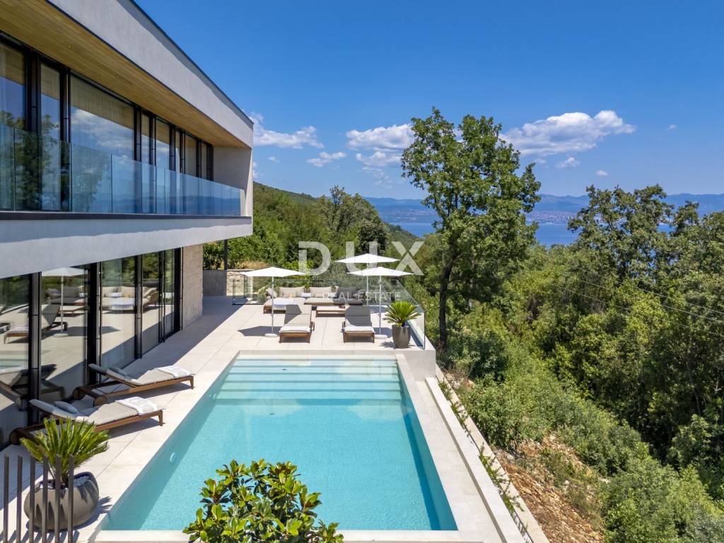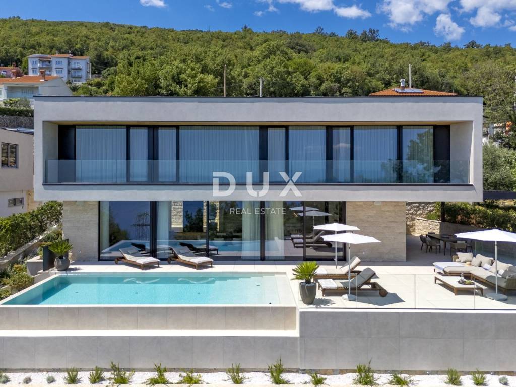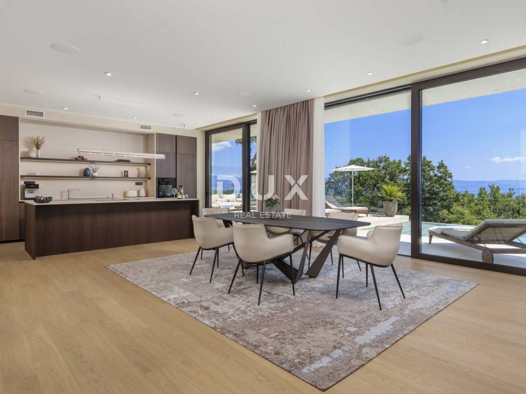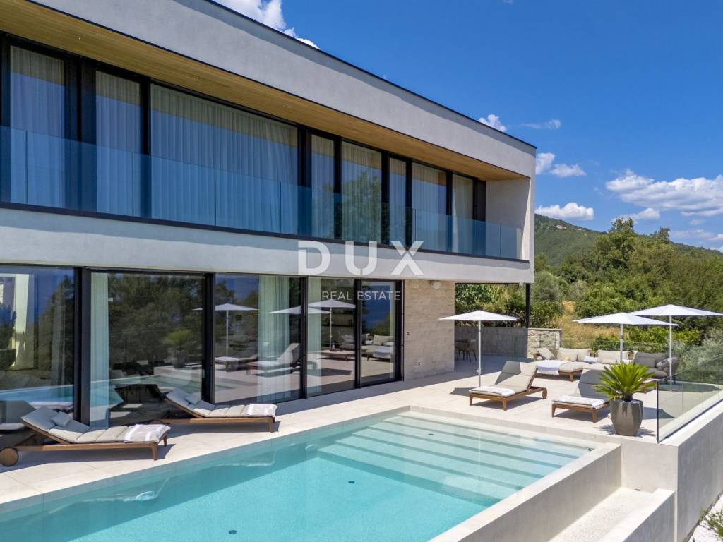 In the exclusive offer of DUX real estate, we highlight an exceptional villa located in one of the most sought-after micro-locations of the Opatija Riviera - just two minutes from the coast and the crystal-clear beach of Mošćenička Draga. This architecturally thoughtful villa is located in a quiet green belt, discreetly tucked away below the road leading to the old town of Mošćenička Draga. Its position offers absolute privacy and silence, and thanks to the elevated terrain, every room offers an unobstructed, panoramic view of the sea, all the way to the horizon. The villa extends over two floors: the lower floor is designed as a large open-space area of over 100 m, where the living room, dining room and kitchen harmoniously merge into one elegant whole, perfect for living and socializing. The upper floor is reserved for a more intimate, sleeping area - each of the three bedrooms has a sea view, its own bathroom, dressing room and access to a covered terrace. This detail ensures a feeling of hotel privacy within your own home. The villa is not only beautiful it is technologically and materially superior, equipped with exceptional systems and brands: -Panasonic heating and cooling systems two separate heat pumps for the interior and the pool -Separate heating and cooling system for the pool -RÖFIX facade -WICONA aluminum three-layer joinery with electric roller shutters and external venetian blinds -High-end Living ceramics, Villeroy & Boch sanitary ware and Zucchetti faucets -Filomuro interior doors invisible, frameless, completely flush with the wall -Custom-made furniture and designer aesthetics The interior is carefully decorated, combining Italian aesthetics and functionality: -Cucine Veneta kitchen with Bosch appliances -Catalan dining set -SGM built-in wardrobes -Dittre Italia beds, Desire sofas The entire villa is managed via the KNX smart system, which allows full control of lighting, heating, roller shutters and security via a smartphone or a single touch on the wall. The garden is carefully landscaped with a combination of exotic plants and Mediterranean textures, while the facade and surrounding walls are clad in authentic stone of impressive thickness not only aesthetically, but also as a symbol of durability. There are three covered parking spaces in front of the villa. Move-in is possible as early as autumn 2025, and a tour of the villa can be organized now. To arrange a visit to the property, call the agent with confidence - consultation in German is possible.