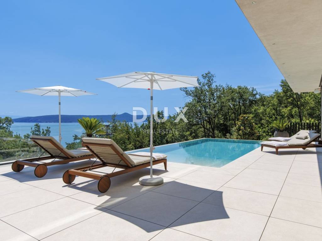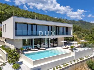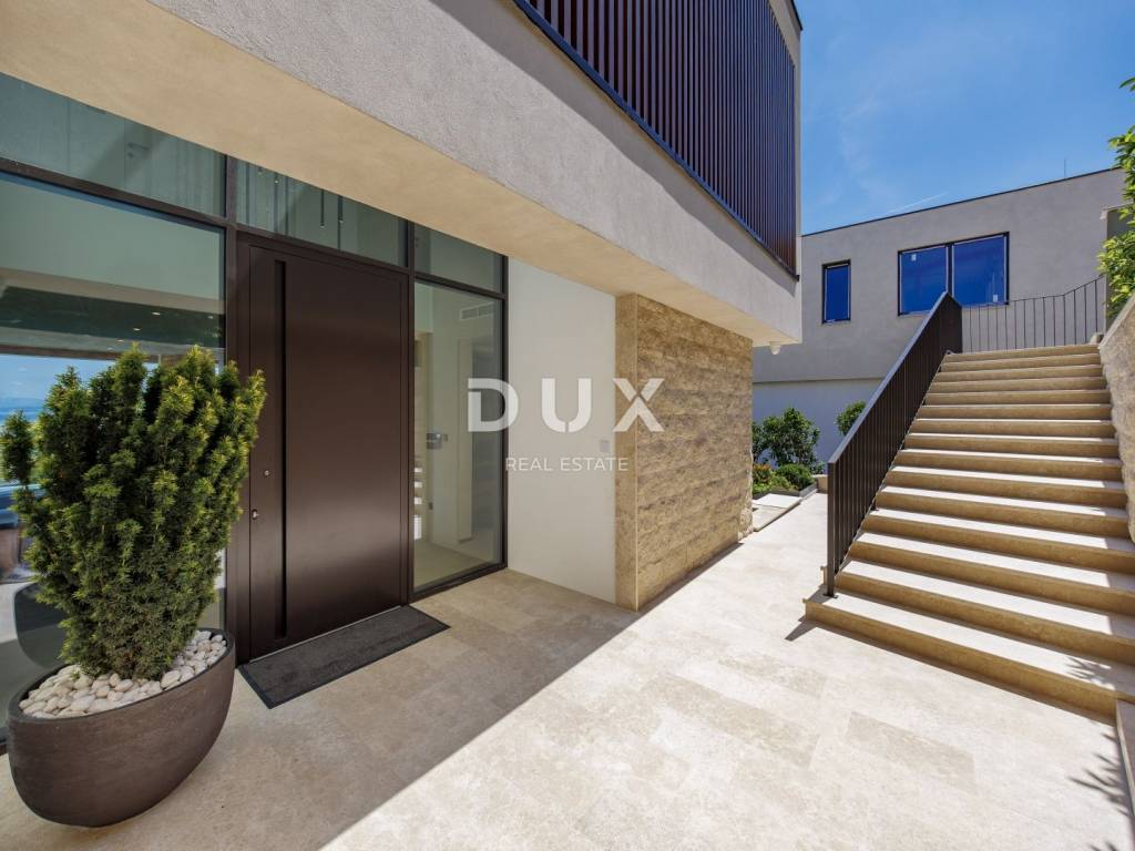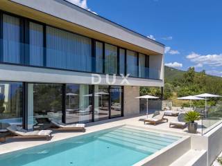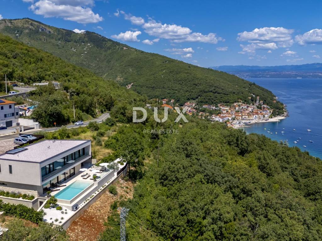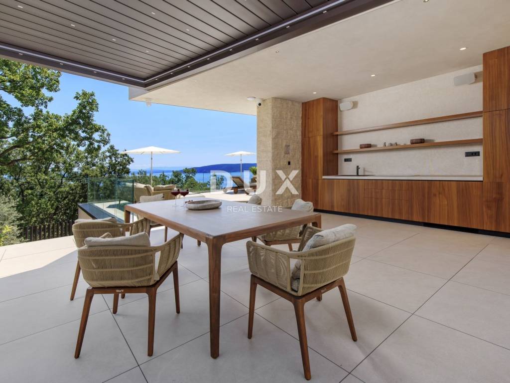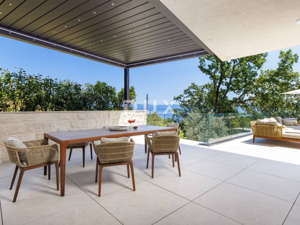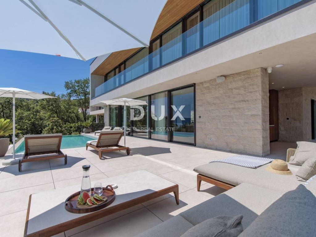 In the exclusive offer of DUX real estate, we highlight an exceptional villa located in one of the most sought-after micro-locations of the Opatija Riviera - just two minutes from the coast and the crystal-clear beach of Mošćenička Draga. This architecturally thoughtful villa is located in a quiet green belt, discreetly tucked away below the road leading to the old town of Mošćenička Draga. Its position offers absolute privacy and silence, and thanks to the elevated terrain, every room offers an unobstructed, panoramic view of the sea, all the way to the horizon. The villa extends over two floors: the lower floor is designed as a large open-space area of over 100 m, where the living room, dining room and kitchen harmoniously merge into one elegant whole, perfect for living and socializing. The upper floor is reserved for a more intimate, sleeping area - each of the three bedrooms has a sea view, its own bathroom, dressing room and access to a covered terrace. This detail ensures a feeling of hotel privacy within your own home. The villa is not only beautiful it is technologically and materially superior, equipped with exceptional systems and brands: -Panasonic heating and cooling systems two separate heat pumps for the interior and the pool -Separate heating and cooling system for the pool -RÖFIX facade -WICONA aluminum three-layer joinery with electric roller shutters and external venetian blinds -High-end Living ceramics, Villeroy & Boch sanitary ware and Zucchetti faucets -Filomuro interior doors invisible, frameless, completely flush with the wall -Custom-made furniture and designer aesthetics The interior is carefully decorated, combining Italian aesthetics and functionality: -Cucine Veneta kitchen with Bosch appliances -Catalan dining set -SGM built-in wardrobes -Dittre Italia beds, Desire sofas The entire villa is managed via the KNX smart system, which allows full control of lighting, heating, roller shutters and security via a smartphone or a single touch on the wall. The garden is carefully landscaped with a combination of exotic plants and Mediterranean textures, while the facade and surrounding walls are clad in authentic stone of impressive thickness not only aesthetically, but also as a symbol of durability. There are three covered parking spaces in front of the villa. Move-in is possible as early as autumn 2025, and a tour of the villa can be organized now. To arrange a visit to the property, call the agent with confidence - consultation in German is possible.