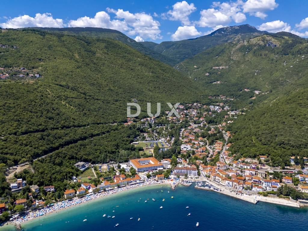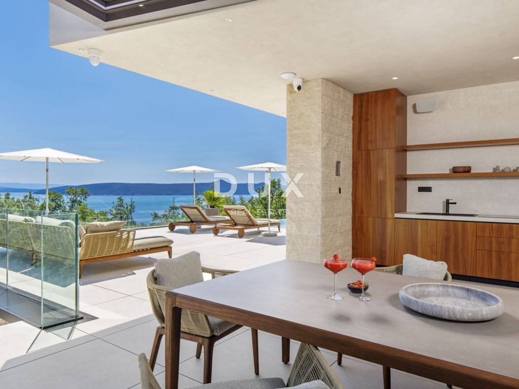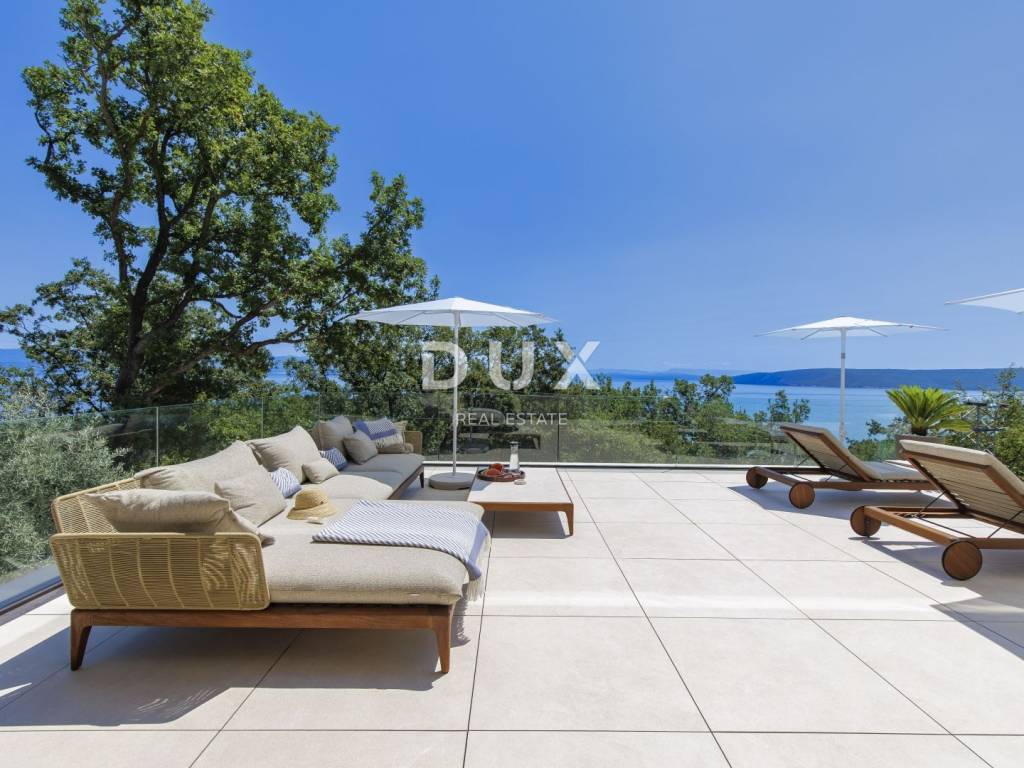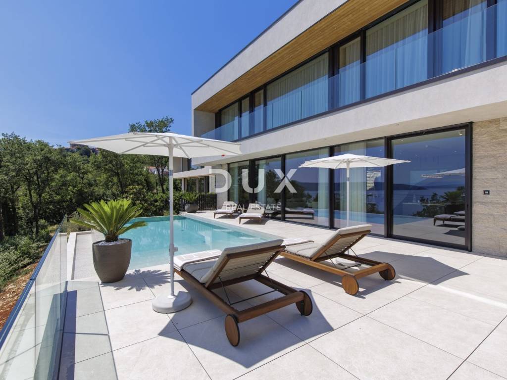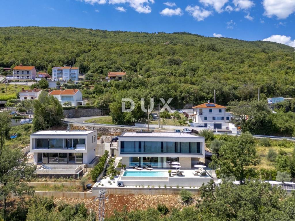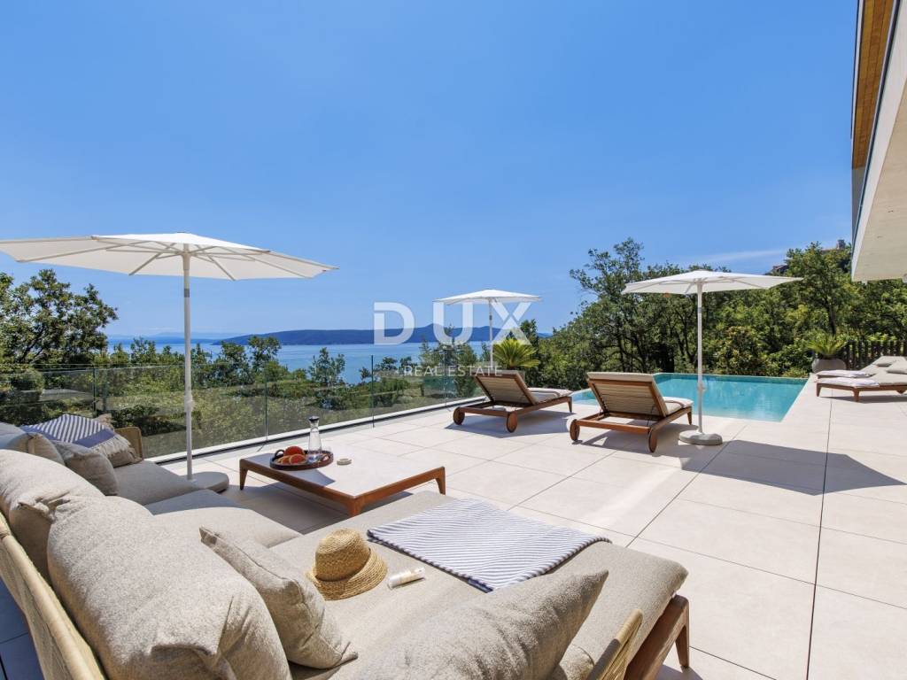 In the exclusive offer of DUX real estate, we highlight an exceptional villa located in one of the most sought-after micro-locations of the Opatija Riviera - just two minutes from the coast and the crystal-clear beach of Mošćenička Draga. This architecturally thoughtful villa is located in a quiet green belt, discreetly tucked away below the road leading to the old town of Mošćenička Draga. Its position offers absolute privacy and silence, and thanks to the elevated terrain, every room offers an unobstructed, panoramic view of the sea, all the way to the horizon. The villa extends over two floors: the lower floor is designed as a large open-space area of over 100 m, where the living room, dining room and kitchen harmoniously merge into one elegant whole, perfect for living and socializing. The upper floor is reserved for a more intimate, sleeping area - each of the three bedrooms has a sea view, its own bathroom, dressing room and access to a covered terrace. This detail ensures a feeling of hotel privacy within your own home. The villa is not only beautiful it is technologically and materially superior, equipped with exceptional systems and brands: -Panasonic heating and cooling systems two separate heat pumps for the interior and the pool -Separate heating and cooling system for the pool -RÖFIX facade -WICONA aluminum three-layer joinery with electric roller shutters and external venetian blinds -High-end Living ceramics, Villeroy & Boch sanitary ware and Zucchetti faucets -Filomuro interior doors invisible, frameless, completely flush with the wall -Custom-made furniture and designer aesthetics The interior is carefully decorated, combining Italian aesthetics and functionality: -Cucine Veneta kitchen with Bosch appliances -Catalan dining set -SGM built-in wardrobes -Dittre Italia beds, Desire sofas The entire villa is managed via the KNX smart system, which allows full control of lighting, heating, roller shutters and security via a smartphone or a single touch on the wall. The garden is carefully landscaped with a combination of exotic plants and Mediterranean textures, while the facade and surrounding walls are clad in authentic stone of impressive thickness not only aesthetically, but also as a symbol of durability. There are three covered parking spaces in front of the villa. Move-in is possible as early as autumn 2025, and a tour of the villa can be organized now. To arrange a visit to the property, call the agent with confidence - consultation in German is possible.