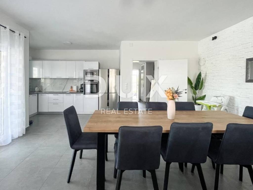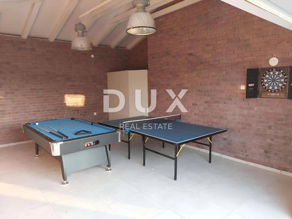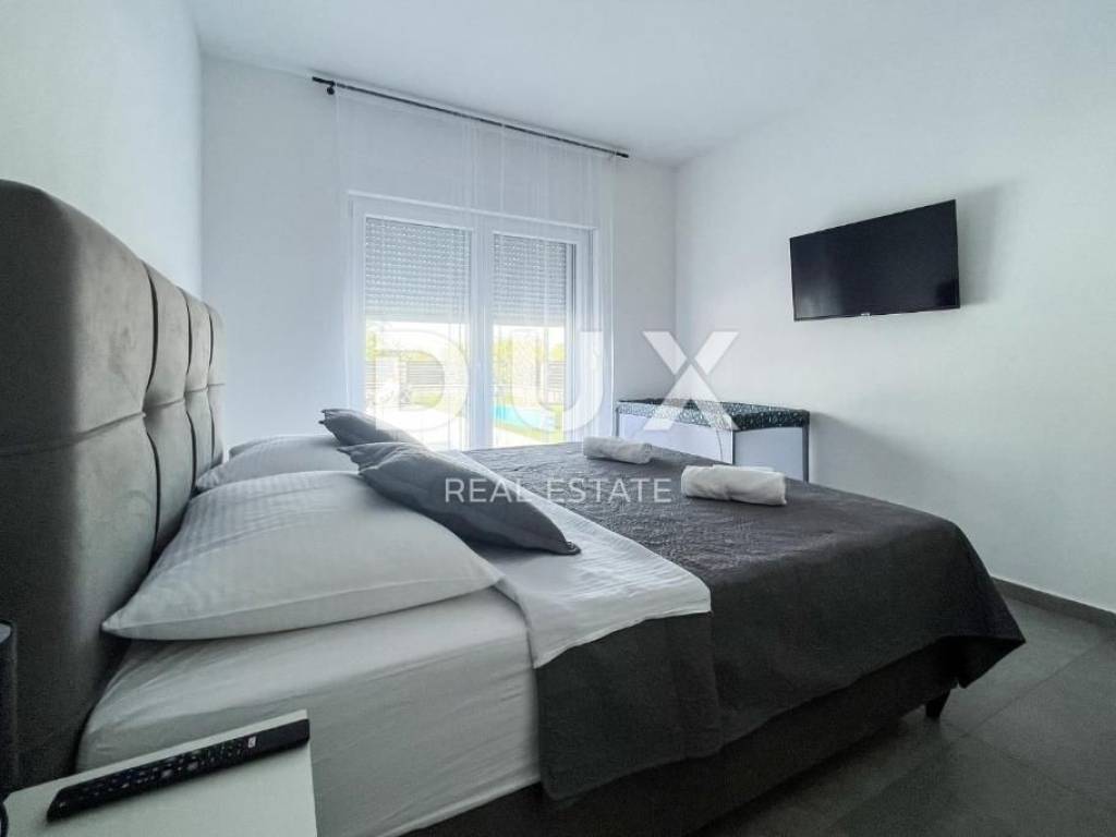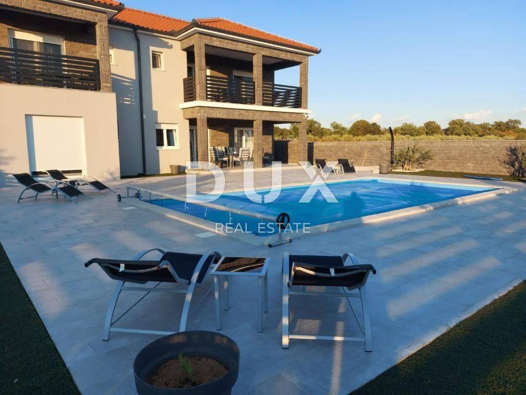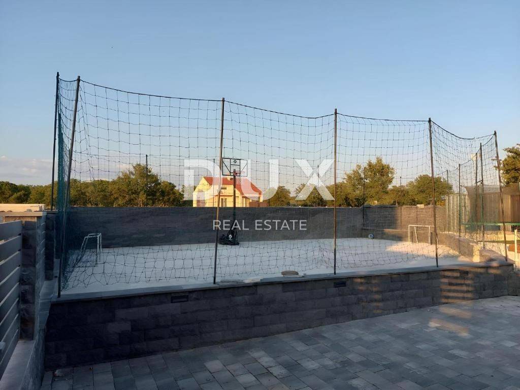 For sale is a beautiful, fully furnished villa with a swimming pool and a large landscaped garden, located in Murvica, a quiet village near Zadar. This modernly decorated family house covers 235.17 m of living space and is located on a plot of land with a total area of 1114 m. It was built in 2022 and offers everything you need for a comfortable life, rest and recreation, and due to its content and location it also represents an excellent investment opportunity for tourist rental. On the ground floor there is an entrance hall, a spacious kitchen with a dining room and living room, one bedroom, a laundry room, a bathroom, an additional toilet and a covered terrace ideal for outdoor living. An internal staircase leads to the first floor where there are three comfortable bedrooms, each with its own bathroom, and two covered terraces. One of the rooms has its own private terrace, while the other two share a common exit. The ground floor also includes a large garage that has been converted into an entertainment and recreation area, with billiards, darts and table tennis. In the spacious courtyard there is a 46 m heated swimming pool and outdoor shower, as well as a covered brick barbecue, a children's playground, a basketball court and small football goals. There is parking space for at least four cars on the plot. The house is well-equipped and fully furnished, and everything is included in the price. The facade thermal insulation is made of 10 cm thick polystyrene, the floors are covered with ceramic tiles, and the joinery is PVC. There are two air conditioners in the living room, while there is one in each bedroom. In addition, an 18 kW heat pump has been installed for year-round heating, and a 10 kWh solar system is planned to be installed. Murvica is located just a few minutes' drive from Zadar and is increasingly popular for a quiet family life, as well as for vacations. The place has all the necessary facilities for everyday life, and the proximity of the city ensures the availability of additional services and amenities.