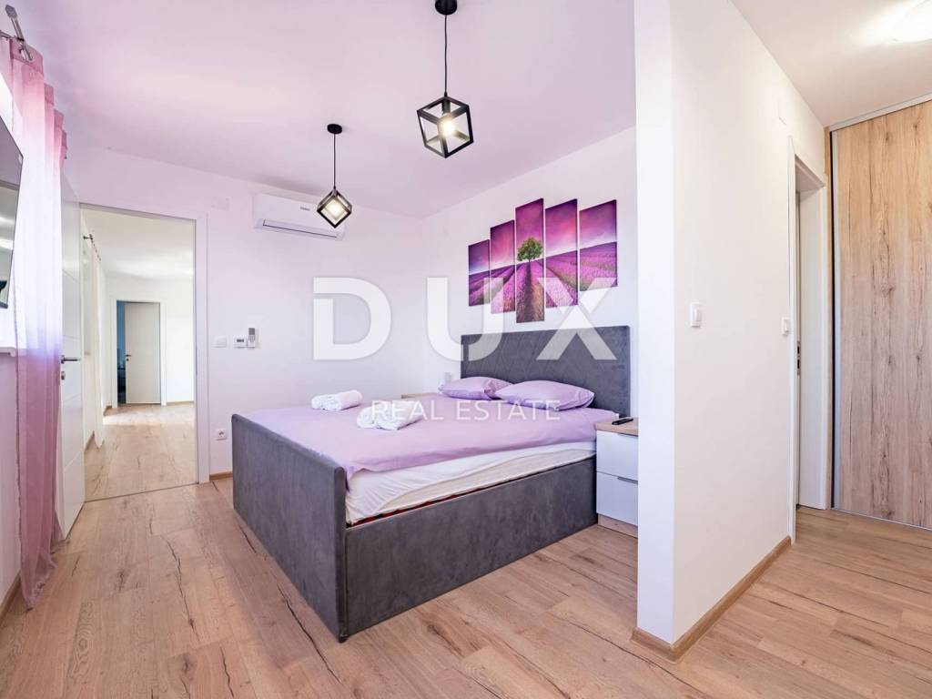 This luxury villa is located in a small quiet place in the vicinity of Dobrinje, about 5 km from the sea. It has three floors and about 320 m2. In the basement there is a playroom, while on the ground floor there is a laundry room, a toilet, a room with its own bathroom, a bedroom, a living room, and a kitchen with a dining room, from which there is a covered terrace with a large garden where there is a swimming pool with a sunbathing area and a summer kitchen. . Upstairs there are four bedrooms with private bathrooms, a study and a covered balcony. There is a parking lot for several vehicles in the garden. Top quality materials and equipment are installed in the facility. The building has a heat pump for preparing hot water and underfloor heating, as well as for heating the water in the pool, the villa is fully air-conditioned, with a built-in alarm and video surveillance. The property is under construction, and the completion of the works is expected by the beginning of summer 2023. VAT is included in the price, the buyer does not pay real estate sales tax.