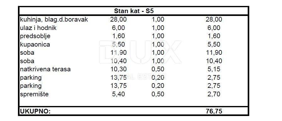 A modern apartment with a garden under construction in the Skročini/Melada area in Zadar is for sale. The apartment with a living area of 63.4 m2 is located on the ground floor of a smaller residential building with eight units. It consists of two bedrooms, living room, kitchen and dining room, hallway and bathroom. The apartment has a covered terrace, a storage room in the basement, and two outdoor parking spaces. The total useful value of the area of the apartment together with all accessories is 76.75 m2. The apartment is air-conditioned, and high-quality materials were used in the construction, such as thermal insulation on the facade, 10 cm styrofoam. Parquet and ceramic tiles were used for the floor coverings, and the joinery is PVC. The planned construction completion date is mid-2025. All necessary facilities for everyday life are nearby, such as shops, schools, kindergartens or shopping centers. The city center is a 30-minute walk away, and the nearest and oldest city beach, Marex, is a 20-minute walk away. Zadar is the urban center of Northern Dalmatia, which, due to its favorable position in the central part of the Adriatic coast, is becoming the most visited tourist destination in Dalmatia. In addition to numerous attractions and rich content, Zadar is located near various National Parks such as Kornati and picturesque towns on the Adriatic coast such as Nin, Biograd na Moru and others.