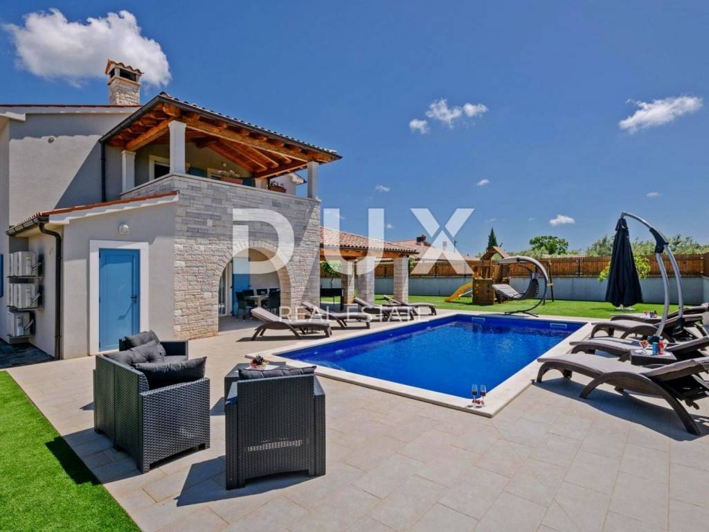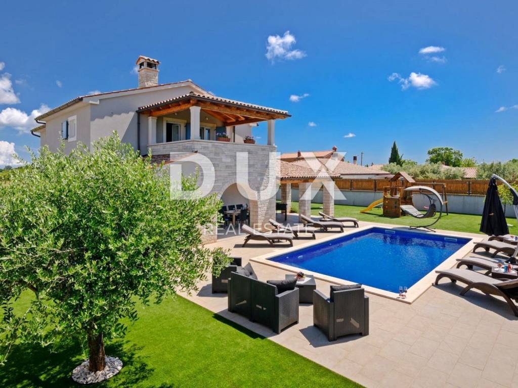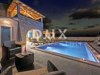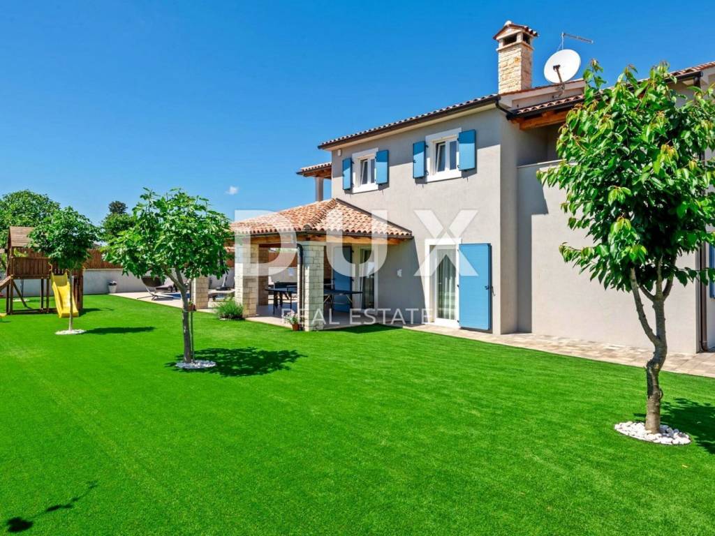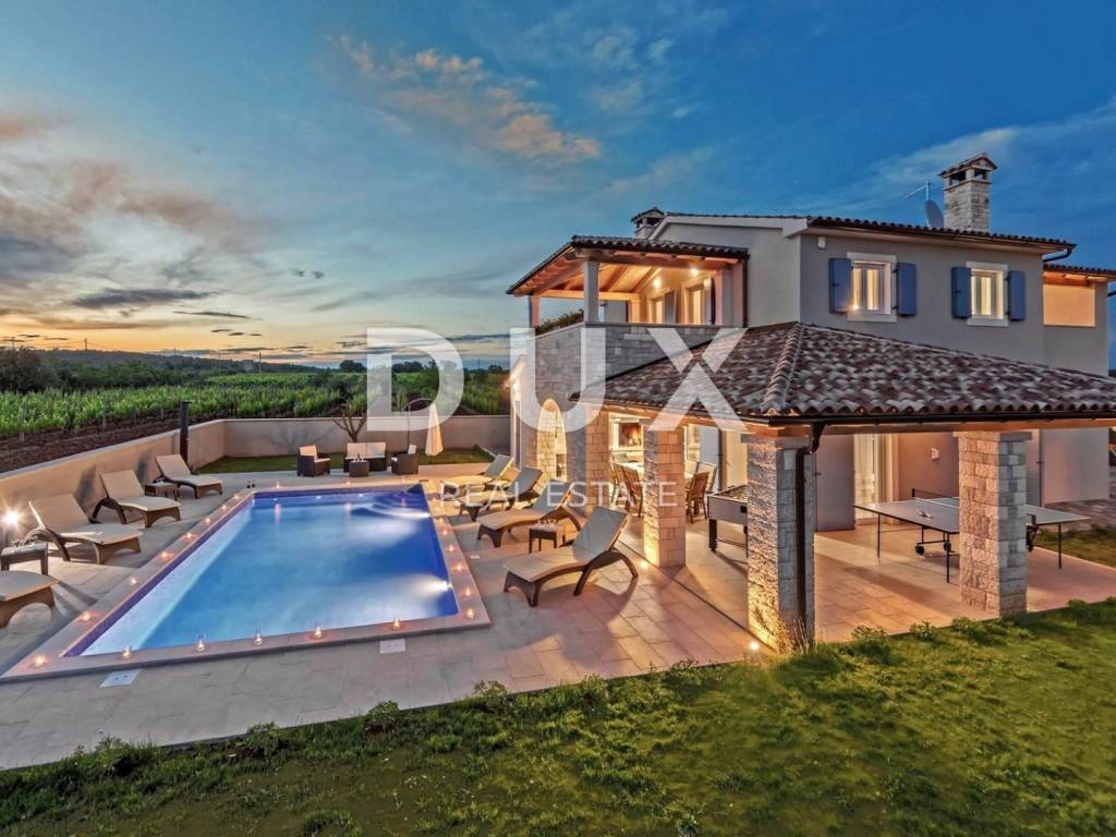 Marčana is a municipality in the southeast of the Istrian peninsula. It is located about 12 km northeast of Pula, the largest city in Istria. It is known as a destination for the sea, holidays, wine and olive oil. It is a culturally rich settlement with crystal clear sea and an almost unreal landscape consisting of gorgeous bays and green peninsulas. Its 36 kilometers of coastline is the least urbanized coastal zone in Istria. Marčana and its fertile green fields, with gentle hills that descend to hidden rocky coves and secluded villages and towns are an undiscovered treasure of the eastern coast of Istria. In one of the settlements of the Municipality of Marčana, offering a perfect balance of rural surroundings and proximity to urban facilities, a comfortable house with a swimming pool and wellness is for sale. In addition to the microlocation, the property is characterized by the quality of the construction, which guarantees long-term satisfaction and quality of housing. The house of timeless architecture, partially covered with stone with rustic blue shutters, fits in shape and color with the village and the landscape. It was conceived as one residential unit that extends over two tastefully decorated and quality equipped floors that exude elegance. On the ground floor there is a kitchen, a dining room and a living room with access to a covered terrace that contains a summer kitchen, a bedroom with its own bathroom, a guest toilet and a technical room. The floor consists of three bedrooms, three bathrooms and two terraces. The fenced yard is full of greenery and Mediterranean plants, and the perfect harmony is rounded off by a 32 m swimming pool with a sun deck and a 32 m auxiliary facility in the function of wellness with a sauna, hot tub, shower and fitness equipment. The excellent location and spatial organization of the interior and exterior of this impeccable property provides an opportunity for a comfortable family life or an investment investment in a tourism rental business.