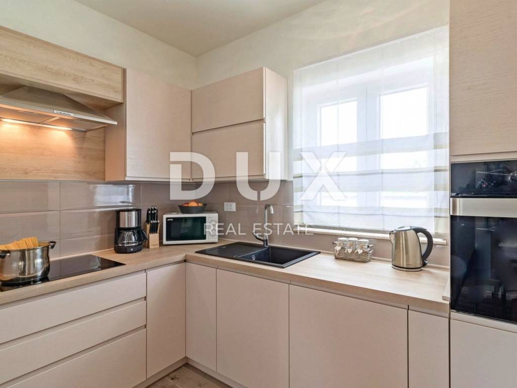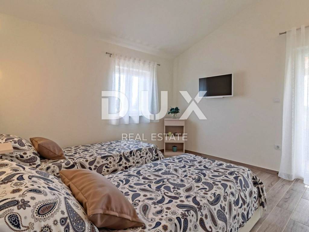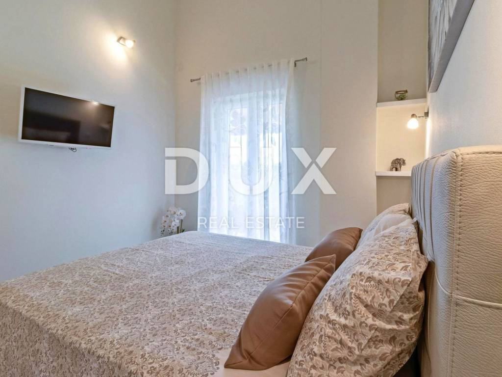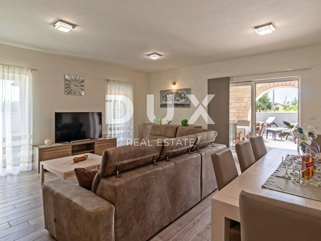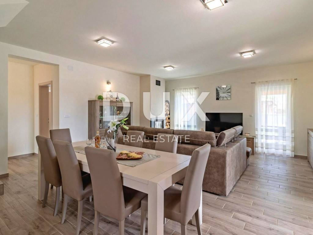 Marčana is a municipality in the southeast of the Istrian peninsula. It is located about 12 km northeast of Pula, the largest city in Istria. It is known as a destination for the sea, holidays, wine and olive oil. It is a culturally rich settlement with crystal clear sea and an almost unreal landscape consisting of gorgeous bays and green peninsulas. Its 36 kilometers of coastline is the least urbanized coastal zone in Istria. Marčana and its fertile green fields, with gentle hills that descend to hidden rocky coves and secluded villages and towns are an undiscovered treasure of the eastern coast of Istria. In one of the settlements of the Municipality of Marčana, offering a perfect balance of rural surroundings and proximity to urban facilities, a comfortable house with a swimming pool and wellness is for sale. In addition to the microlocation, the property is characterized by the quality of the construction, which guarantees long-term satisfaction and quality of housing. The house of timeless architecture, partially covered with stone with rustic blue shutters, fits in shape and color with the village and the landscape. It was conceived as one residential unit that extends over two tastefully decorated and quality equipped floors that exude elegance. On the ground floor there is a kitchen, a dining room and a living room with access to a covered terrace that contains a summer kitchen, a bedroom with its own bathroom, a guest toilet and a technical room. The floor consists of three bedrooms, three bathrooms and two terraces. The fenced yard is full of greenery and Mediterranean plants, and the perfect harmony is rounded off by a 32 m swimming pool with a sun deck and a 32 m auxiliary facility in the function of wellness with a sauna, hot tub, shower and fitness equipment. The excellent location and spatial organization of the interior and exterior of this impeccable property provides an opportunity for a comfortable family life or an investment investment in a tourism rental business.