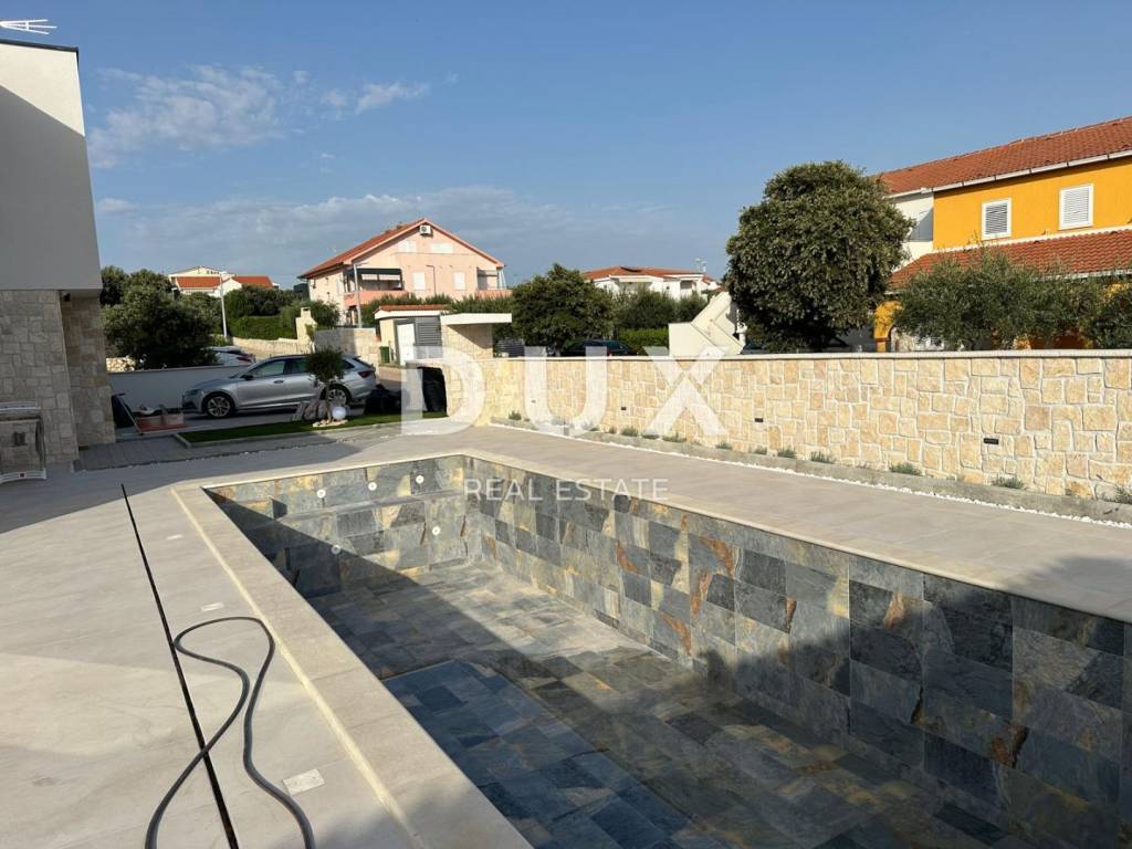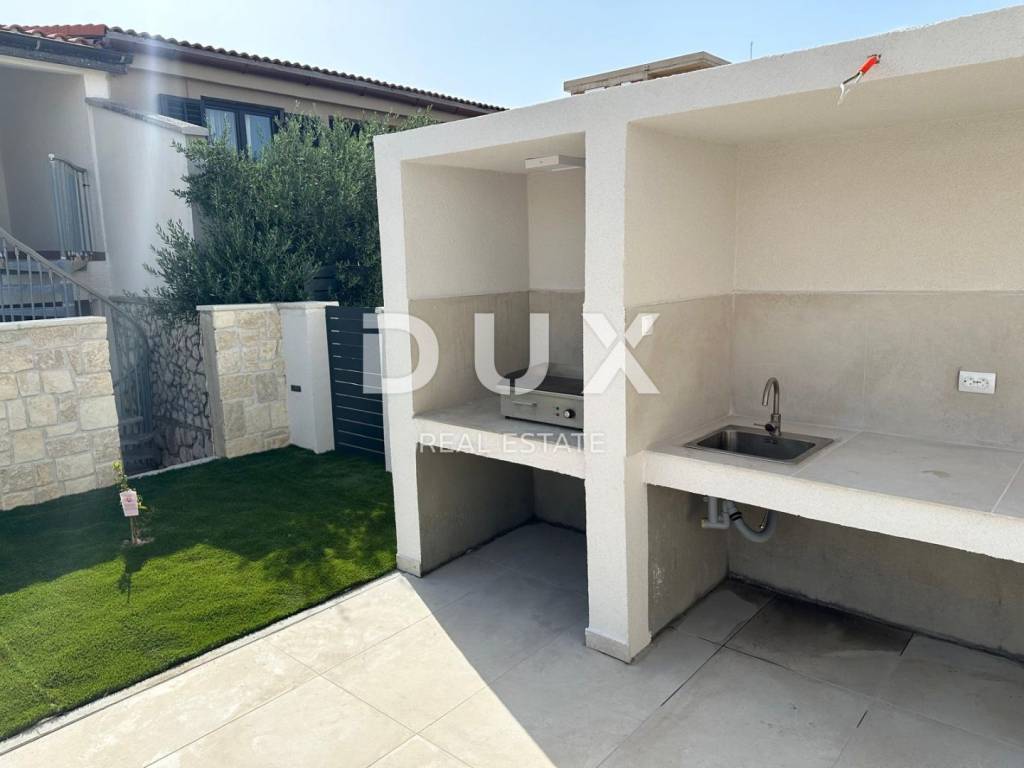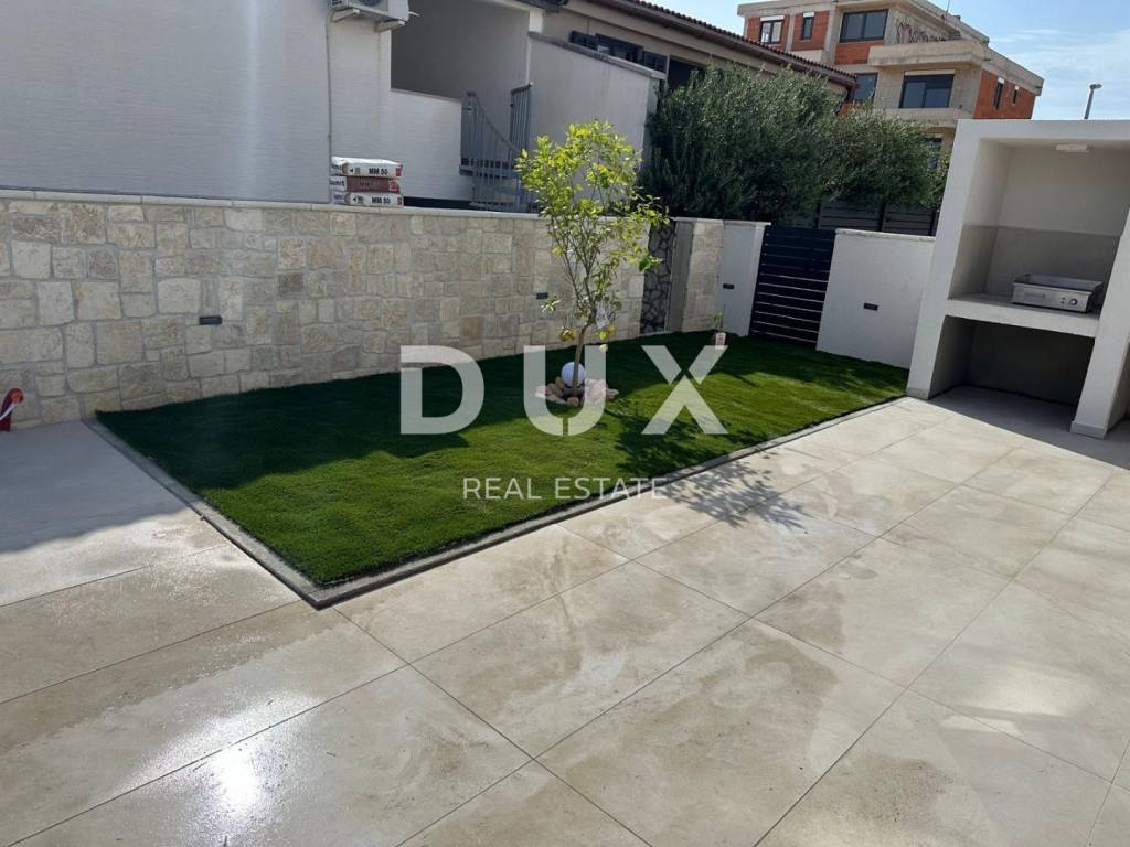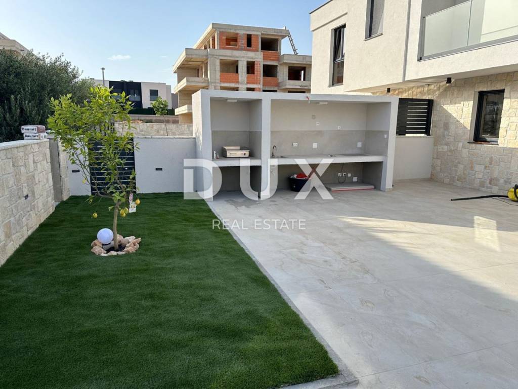 We are selling this excellent semi-detached house number 1 in an excellent location 300 meters from the sea. This exclusive house, which is in the final stage of construction, was conceived as a semi-detached house divided into two floors, each of which has its own entrance, yard and garden with a swimming pool. House No. 1 consists of a ground floor and a first floor, where on the ground floor there is an entrance hall, a storage room, a guest toilet, a utility room, one bedroom with its own bathroom, an open space, a large living room with a kitchen and a dining room with access to the garden with a swimming pool. On the first floor of the house, we have three more bedrooms, each with its own bathroom, of which the master bedroom has access to the terrace, with a total living area of 230m2. The house is currently in the stage of being completely decorated with furniture and is being sold as such. Each house has two parking spaces in the garden. This wonderful project of modern architecture, in which only the best materials currently on the market were used, give this property uniqueness and luxury. Characteristics and equipment of the house, Rehau three-layer carpentry with built-in mosquito nets, glass with a coating to reflect the sun's rays as additional insulation from the summer heat. First-class ceramics from the renowned Marazzi manufacturers of large formats. Concealed mixers and showers, built-in sinks with designer bathroom furniture. Complete underfloor heating with Daikin heat pumps and all rooms air-conditioned. Smart home system, turning on air conditioning and heating electronically via the application. Video surveillance, 24-hour monitoring of the entire facility. The house is surrounded by a wall 1.50 meters high, which provides comfort and privacy. Heated infinity pool 8 X 3.5 meters with built-in waterfall and complete equipment. Sauna and jacuzzi for four people. The possibility of buying both objects in agreement with the investor. A property worthy of attention both for living and vacationing, and certainly a profitable investment for renting during the season.