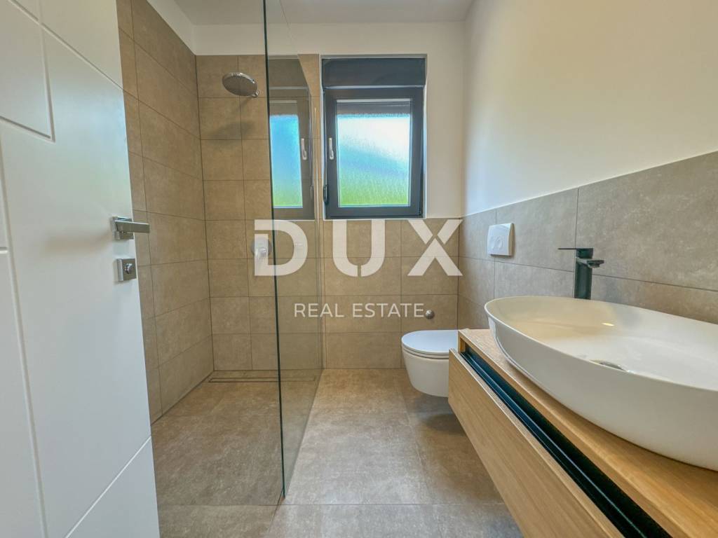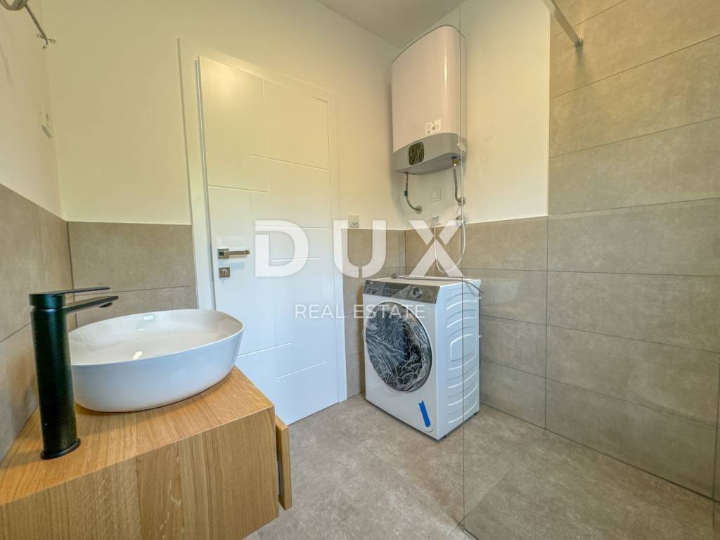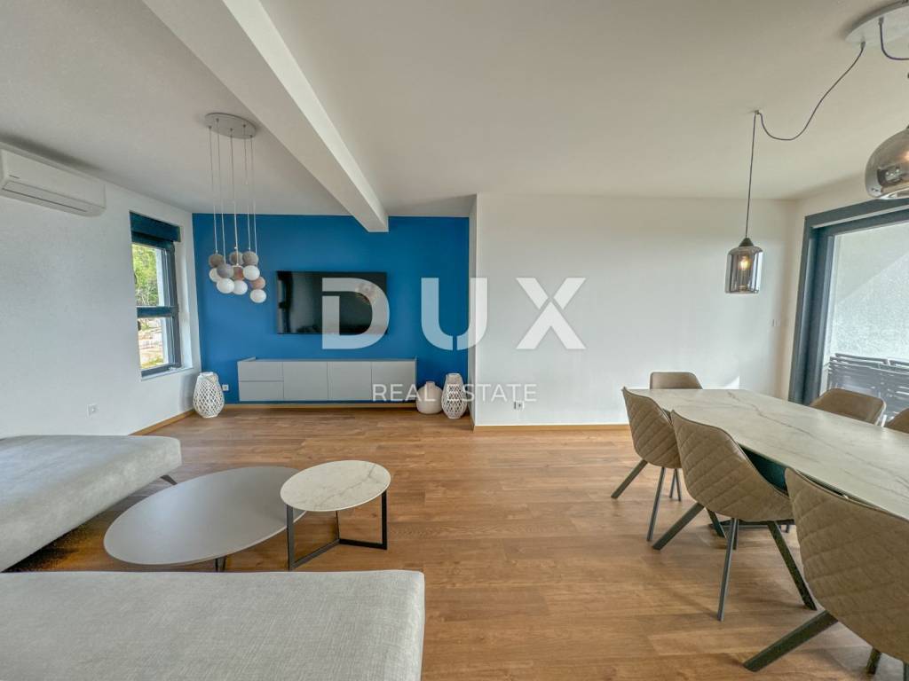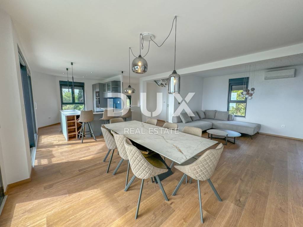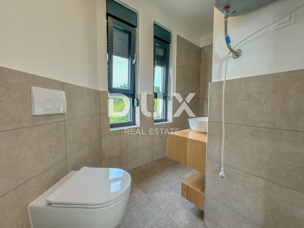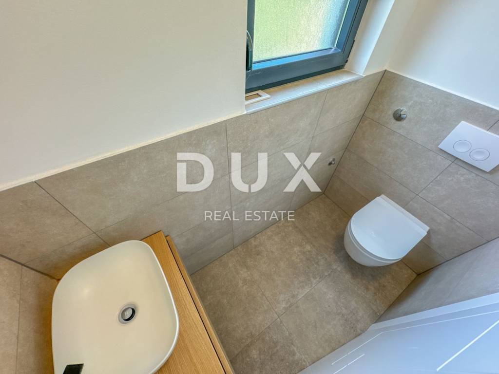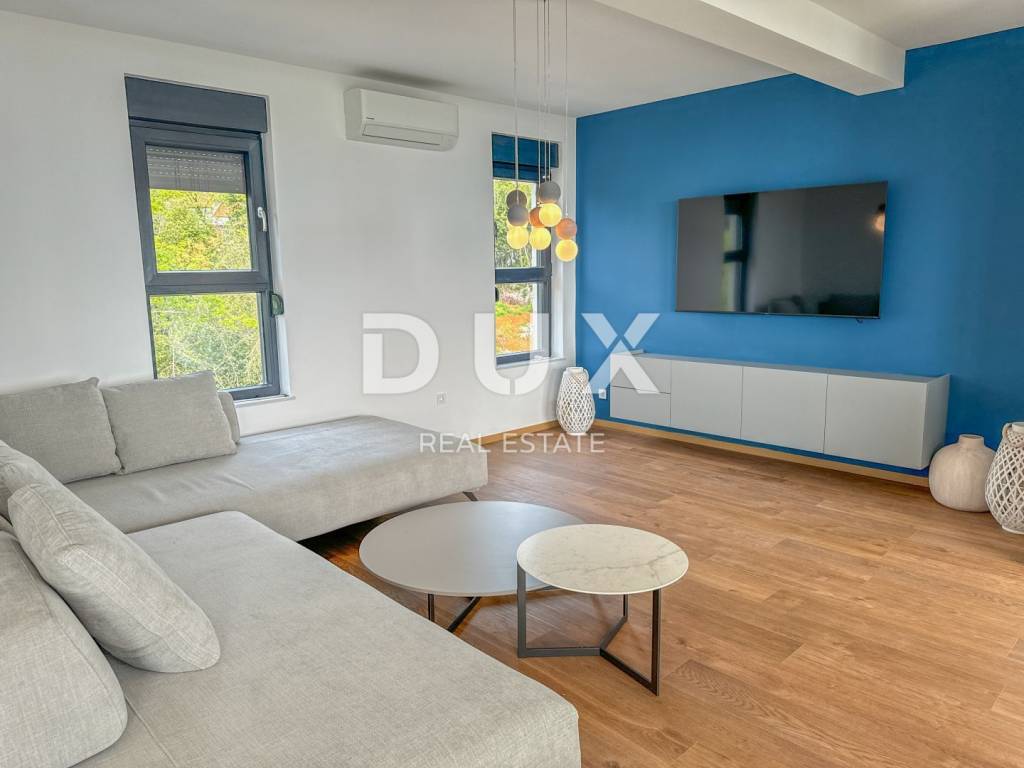 In the exclusive offer for rent of DUX real estate there is a luxurious apartment in a new building, located in Ika in a beautiful designer villa. It is a modern two-story apartment of 135 m2 with a roof terrace of 76.77 m2. This beautiful apartment in a new building consists of a large spacious hallway, two bedrooms fully equipped with king size beds, two bathrooms and a toilet. The large open space living room is connected to the kitchen and dining room in warm wooden and beige tones, and the entire open space is 54 m2. Above all, the bright and spacious mentioned open space has access to a large terrace of 15 m2 with a beautiful panoramic view of the Kvarner Bay. Each room of this modern and luxurious apartment is furnished with designer furniture in warm and neutral beige, wooden and blue tones, and the bathrooms are dominated by Italian tiles in beige tones. The roof terrace of 80 m2 is completely private, with a glass fence and insulated and paved with beautiful honey-colored tiles. The apartment has energy class A+ and underfloor heating, which provides a pleasant temperature throughout the year. The building consists of a total of 4 apartments, and this apartment has 3 private parking spaces and is located in a quiet, side street above Ika beach, surrounded by a green belt. The location of the property is ideal, the air line from the sea is 300m, and the drive to the sea takes two minutes. Dear clients, the agency commission is charged in accordance with the General Business Conditions: www.dux-nekretnine.hr/opci-uvjeti-poslovanja