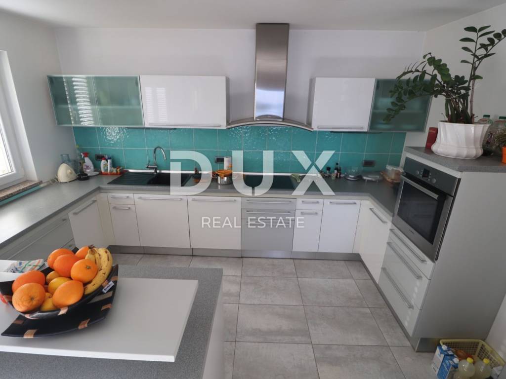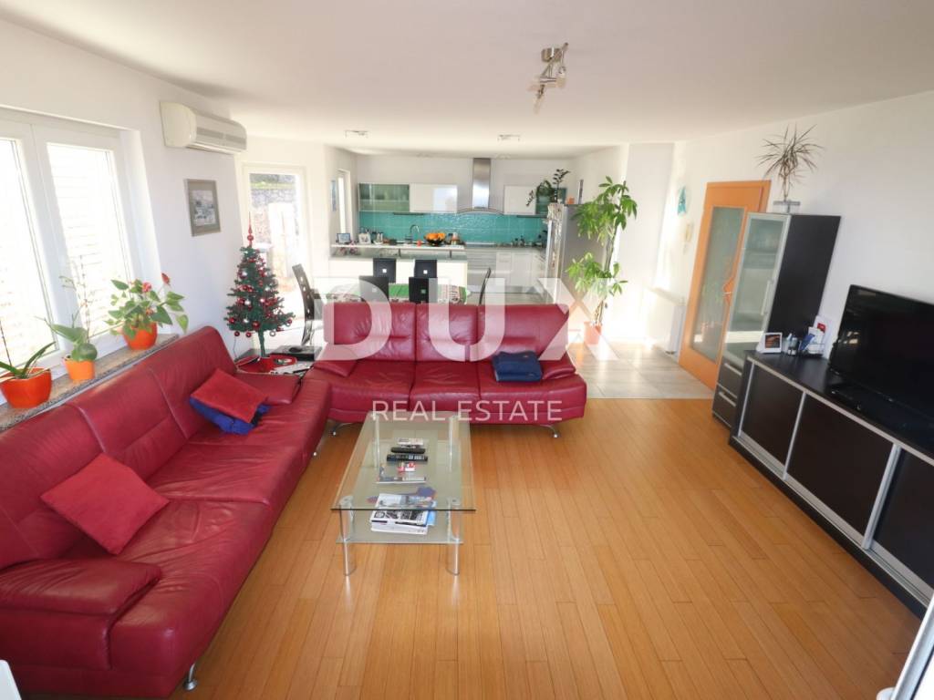 We are selling an apartment / floor in a newer building, excellent layout with panoramic sea views. The apartment consists of two bedrooms, bathroom, large living room, kitchen and dining room and hallway. It has a whole floor of 102 m2 on the ground floor of a building with three floors. Additionally in the title deed It has a tavern / storage under the apartment of 14m2, and a terrace with a barbecue of 25 m2, a balcony of 12 m2 and two parking spaces. The apartment is located in a quiet location with a beautiful panoramic view of Kvarner. The apartment is for sale furnished. The equipment includes gas central heating, air conditioning, PVC windows and aluminum shutters, floor coverings in the apartment are bamboo flooring and Italian ceramics, and the kitchen is Dankuchen with Bosch appliances. The property is definitely worth a look.