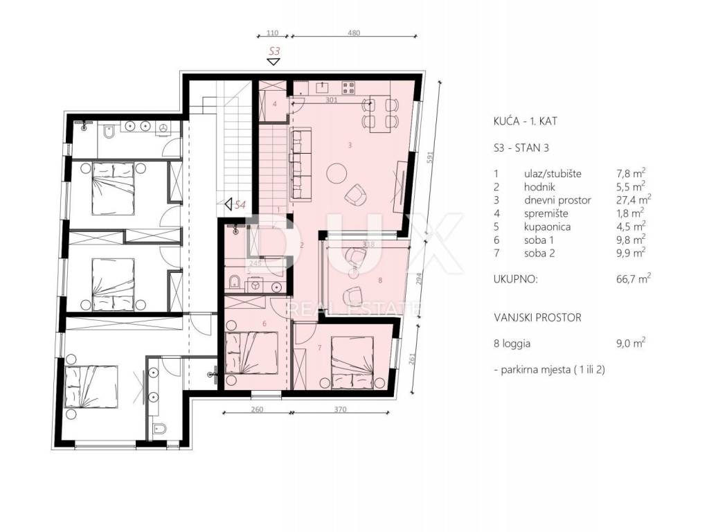 We are selling this beautiful 2 bedroom apartment S-3 on the first floor of a modern and quality residential building with only four apartments. It consists of an open space living area with a kitchen and dining room, two bedrooms, a bathroom and a storage room. This modern project is in the process of issuing a building permit to start construction. In this early stage of waiting for the building permit, there is still the possibility of repurposing the interior space according to the buyer's wishes in agreement with the seller. In the construction itself, only the best materials and equipment that are currently on the market will be used. There is underfloor heating plus air conditioning in all rooms. The apartment has two owned parking spaces. An excellent price-quality ratio gives this property its uniqueness. Dear clients, the agency commission is charged in accordance with the General Business Conditions www.dux-nekretnine.hr/opci-uvjeti-poslovanja