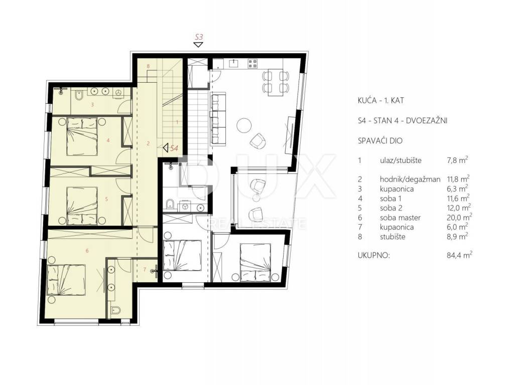 We are selling this exceptional 3 bedroom + bathroom penthouse S-4 in a modern and quality residential building with only four apartments. The penthouse is well designed as a two-story, where on the lower floor we find an entrance hall, a bathroom, three bedrooms, of which the master bedroom has its own bathroom. Through the internal staircase in the high attic, we have an open space living area with a kitchen and dining room, a guest toilet and a storage room. From the living room we go out to a spacious terrace where we have a swimming pool, a sunbathing area and a designated area for barbecuing and pleasant summer gatherings. The terrace offers an open view of the sea and the surrounding area. This modern project is in the process of issuing a building permit to start construction. In this early stage of waiting for the building permit, there is still the possibility of repurposing the interior space according to the buyer's wishes in agreement with the seller. In the construction itself, only the best materials and equipment that are currently on the market will be used. There is underfloor heating plus air conditioning in all rooms. The apartment has two owned parking spaces. An excellent price-quality ratio gives this property its uniqueness. Dear clients, the agency commission is charged in accordance with the General Business Conditions www.dux-nekretnine.hr/opci-uvjeti-poslovanja