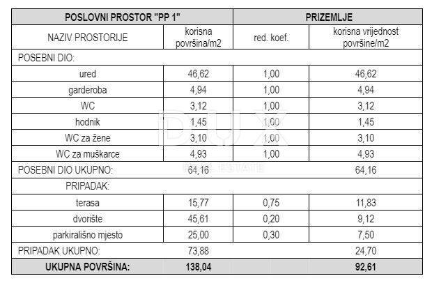 Prodaje se poslovni prostor u Srimi u Vodicama pokraj Šibenika. Poslovni prostor ukupne površine 64,16 m2 nalazi se u prizemlju manje poslovno-stambene zgrade u novogradnji smještene na vrhunskoj lokaciji 1. red do mora. Prostor je klimatiziran i osvijetljen, ima tri sanitarna čvora, a pripada mu terasa od 15,77 m2, dvorište od 45,61 m2 i dva parkirna mjesta od 25 m2. Sveukupna korisna vrijednost površina iznosi 92,61 m2.
