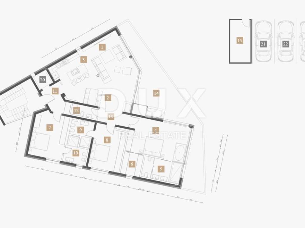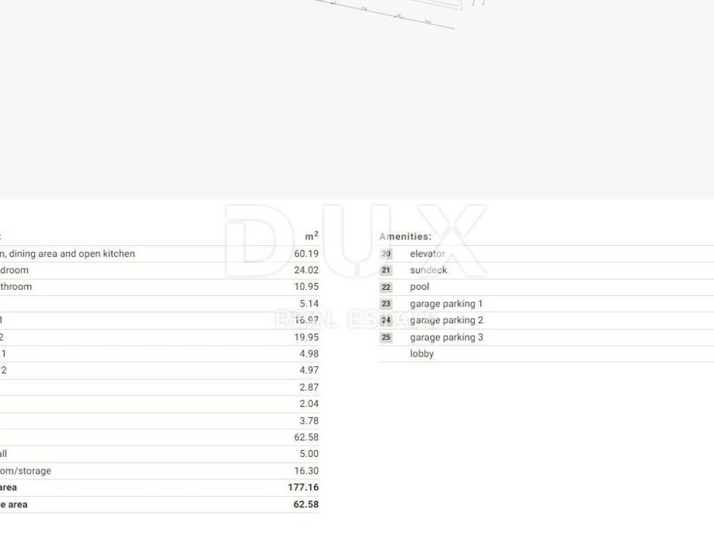 We offer an opportunity to make dreams come true. The effort and knowledge of top local architects once again showed a quality result. A special building with a total of 5 luxury apartments is located slightly uphill, 400 meters as the crow flies from the center of Opatija. This architectural masterpiece is located on a plot of 1000m2 in a quiet residential area surrounded by the greenery of Opatija and exclusive new buildings. The penthouse on the third floor of the building is spread over the entire floor of 177 m2 and consists of a hallway, three large bedrooms, three bathrooms, a toilet, a laundry room, a living room with a kitchen + a dining room of 60 m2 and a private terrace of 63 m2. The ground floor of the building has an exotic swimming pool and its sunbathing area. The apartment is sold complete, turnkey, including a bathroom with sanitary facilities - ready to put furniture. Some of the important characteristics of this building are: - high-quality, open carpentry, glass walls that guarantee an open view of the sea and the roofs of Opatija's historic villas - underfloor heating + heat pump - branded materials and sanitary ware in the bathrooms - outdoor heated pool - underground garage and 2 garages places - elevator - integrated cooling - energy-efficient construction, sustainability A truly fantastic investment opportunity in Opatija - a combination of timeless architecture, modern luxury atmosphere and modern home technology. The air distance to the sea or the Lungomare promenade is 450 meters or 4 minutes on foot downhill. Driving by car or motorbike takes only one minute. The planned completion of the works, i.e. the occupancy of the building, is at the end of 2024. Contact an agent with confidence. Dear clients, the agency commission is charged in accordance with the General Terms and Conditions. www.dux-nekretnine.hr/opci-uvjeti-poslovanja