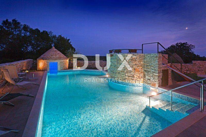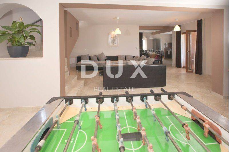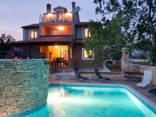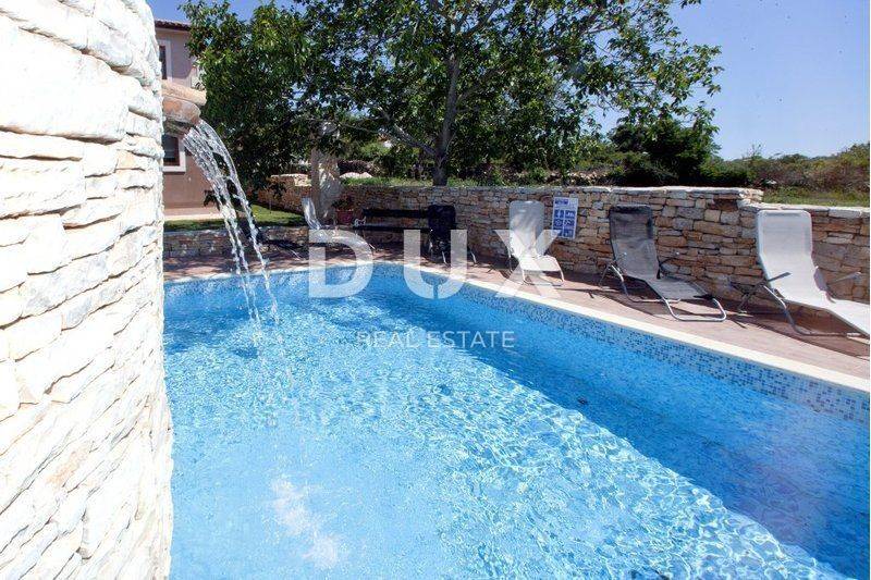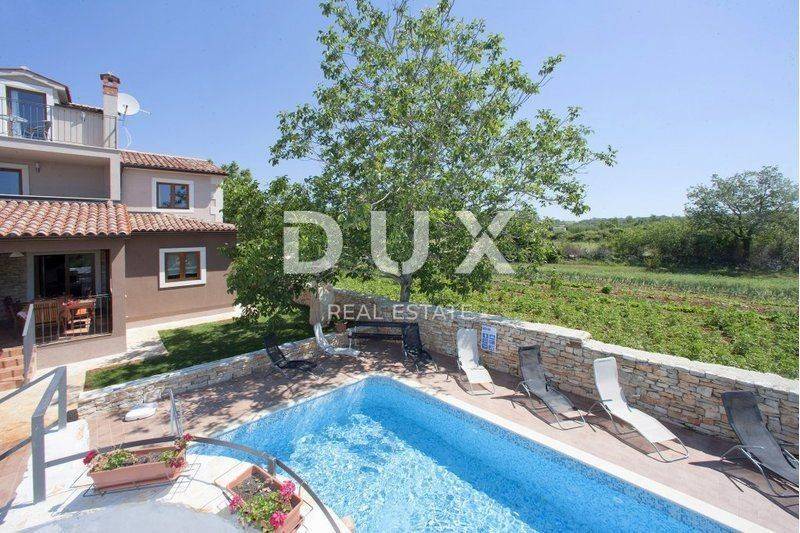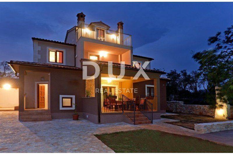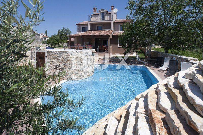 Just 15 minutes' drive from the sea and the first beaches in a wonderful location surrounded by untouched nature, on a 600m garden, this beautiful house with a total area of 240 m2 was built. On the ground floor there is a kitchen with a dining room and a living room and one bedroom with a bathroom and a separate toilet. In the living room there is a large balcony door with a view and access to the pool and a covered terrace with a barbecue. On the first floor, there are three bedrooms, each with its own bathroom. One of the bedrooms has a terrace with a view of green spaces. On the mansard there is another bedroom with a bathroom, and a terrace with a beautiful view of the sea in the distance on clear days. Each room is air-conditioned. Underfloor central heating is installed in the living area, while radiators are installed in the rooms. You only need to buy a pellet stove. There is also a covered parking space for cars and a space for bicycles, which you can close. The pool area is 58 m2 with a specific shape and Istrian kažun, which makes it special. There is a sunbathing area around the pool. According to the project, the new owner has the option of building a 12m2 laundry room. The property is completely fenced and offers privacy. The property has all the necessary documentation. Ownership 1/1, no encumbrances. If you are looking for a house in a quiet location, this beauty is the right choice for you. At the same time, it is an excellent investment in tourism. Don't miss this opportunity!