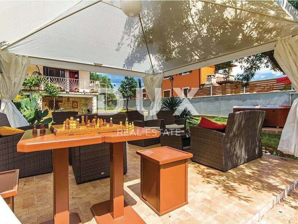 ISTRIA, BARBARIGA - Quality family apartment house located near beautiful rocky beaches. Barbariga is a tourist village in the Municipality of Vodnjan, Istria, Croatia, located along the coast of the Adriatic Sea. This attractive resort offers beautiful beaches, natural beauty, restaurants and a variety of activities such as diving, sailing and cycling. Various accommodation options and sports fields can also be found there. In addition, the surrounding area is full of nature reserves and historical sights. This high-quality apartment house is situated in a quiet street surrounded by family houses. It is only 1500 meters from the sea and beautiful rocky beaches. It consists of a total of 300m2 of living space divided into 4 residential units and a comfortable 1130m2 of land. ORGANIZATION OF SPACE; There are 2 apartments on the ground floor of the house, each with its own private and separate entrance. * Thus, the first studio apartment of 55 m2 of living space consists of 2 comfortable bedrooms, a bathroom, and in one open space, a kitchen with a dining room and a living room. * The second apartment of its 25 m2 of living space consists of one bedroom, kitchen and toilet, which is currently undergoing renovation. And a special part of this apartment that belongs to it is also part of the garden of 350 m2 with a barbecue and a small outdoor terrace. There is one main apartment on the first floor; * From its 120m2 of living space, which consists of an entrance hall that also serves as a closed terrace with movable walls, then access to a larger and spacious open space area in which there is a large living room, a large dining room and a kitchen. The entire space is illuminated by daylight, considering that the exit to the outdoor terrace with a partial view of the sea extends from it. Then in the private part of the apartment there is a bathroom, toilet and two bedrooms. The largest residential unit is located on the second and last floor of the house; From its 145m2 of living space, which is divided so that the apartment is divided into a space for daily life and a private space of the apartment. Thus, in the open space area for daily life, there is a living room with a dining room and a kitchen, from which there is an exit to a larger outdoor terrace with a panoramic view of the sea and the Brijuni Islands. Then there are 5 spacious bedrooms and 2 bathrooms in the private part of the apartment. The 1300m2 yard is completely fenced and private. In addition to parking for more than 6 cars, there is also a number of other interesting facilities, such as a covered terrace with billiards, darts, a Jacuzzi, a smaller covered terrace ideal for summer evenings, a kažun that is used as a summer kitchen. In addition, there are two prefab buildings on the garden that are used as small storage facilities for bicycles and garden maintenance equipment. Of course, a children's park with swings, a trampoline and a slide for the youngest. ADDITIONAL INFORMATION: The property is fully air-conditioned. There is a possibility of building a swimming pool in the yard. The house is used as a rental, which means that the purchase takes over an already established business. A special detail of the house is antique furniture from all over the world, but mostly from Africa, and it is wooden handwork exclusively for the owner. Which means that it is unique considering how special and private designs were drawn for them. Feel free to contact us for any additional questions and/or more information! Dear clients, the agency commission is charged in accordance with the General Business Conditions: www.dux-nekretnine.hr/opci-uvjeti-poslovanja