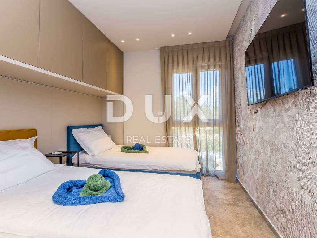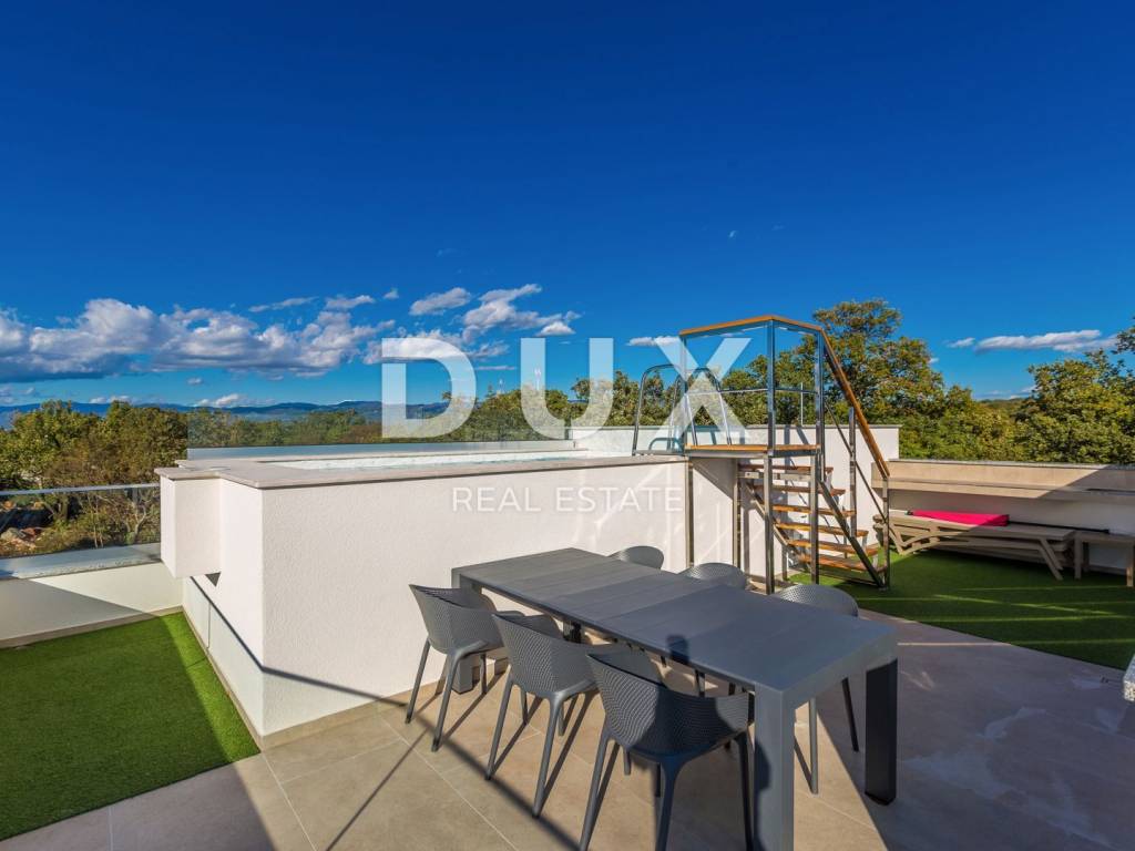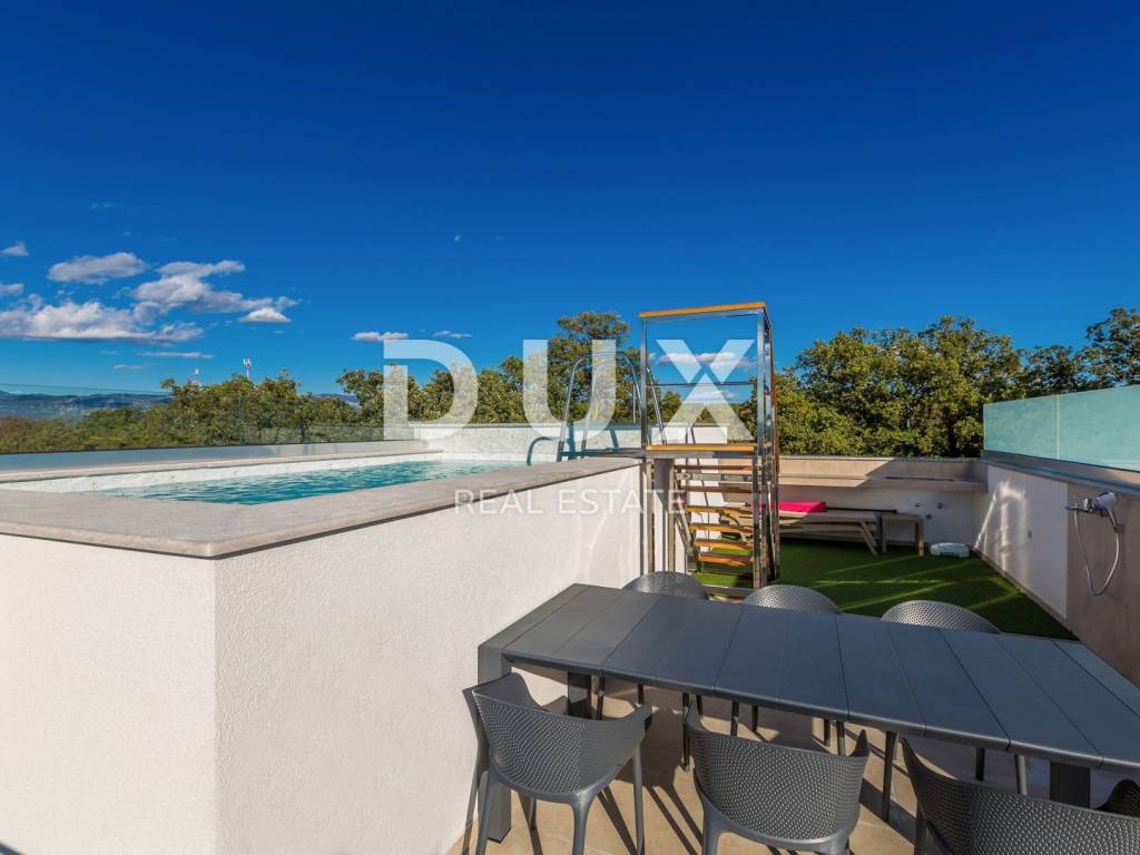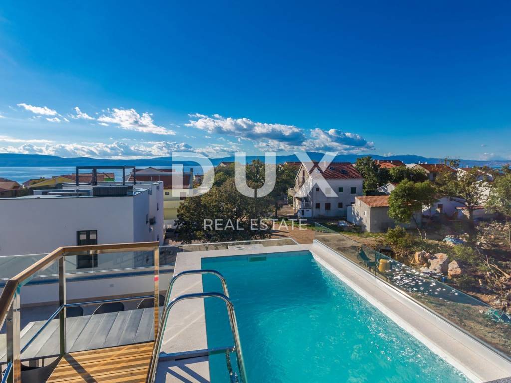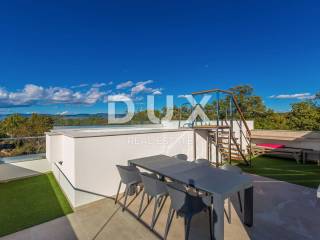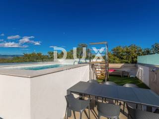 ISLAND OF KRK, NJIVICE - Luxury duplex apartment with rooftop pool and sea view. The entrance to the apartment is located on the ground floor where the entrance hall, pantry, one bedroom and bathroom. Internal stairs lead to the first floor, where there is a living room with kitchen and dining area, two bedrooms and a bathroom. On the roof terrace there is a swimming pool and sun deck. During the construction, the highest quality materials were used, energy certificate A class, underfloor heating in the bathroom, all rooms are air-conditioned.