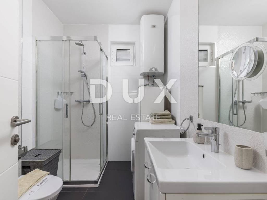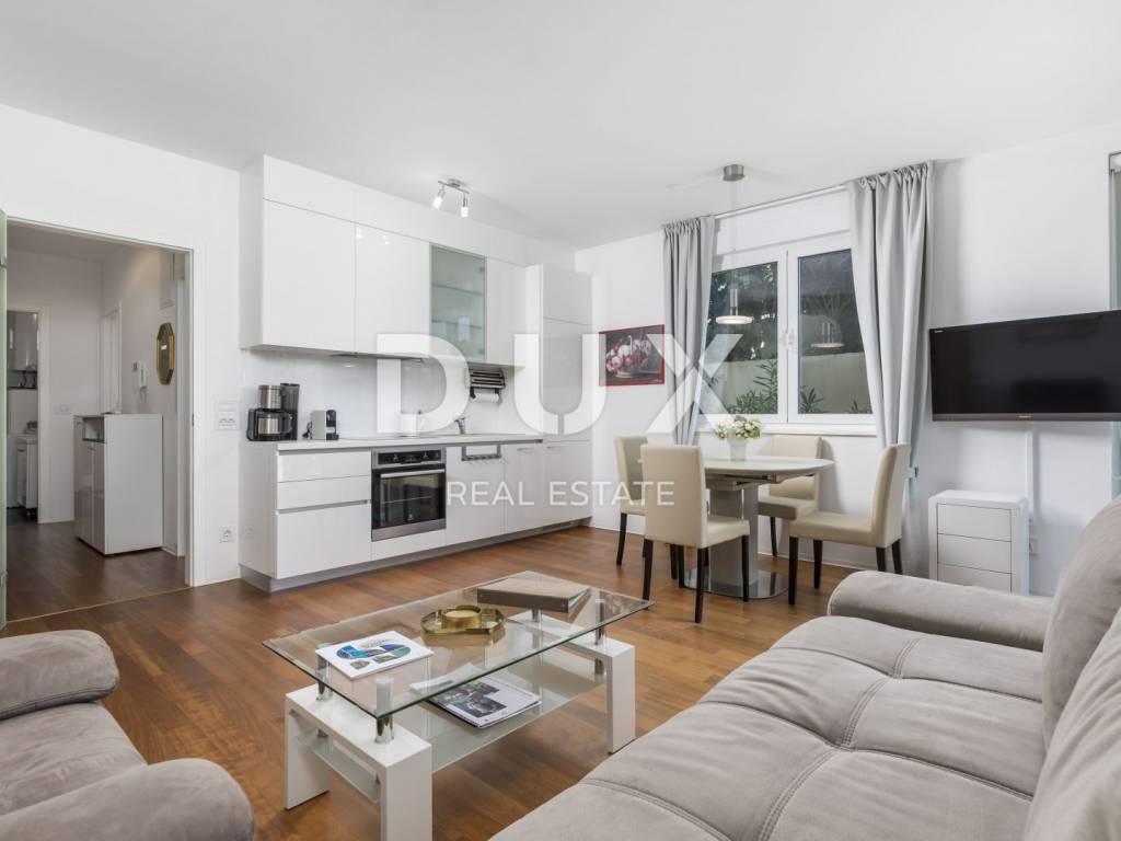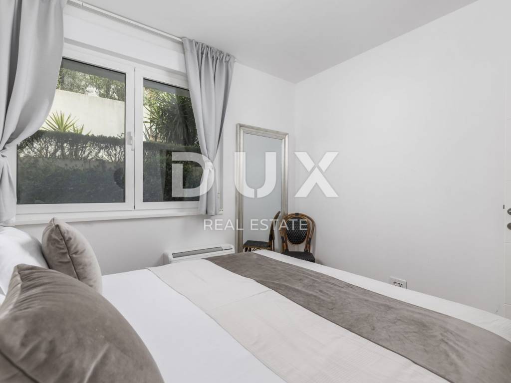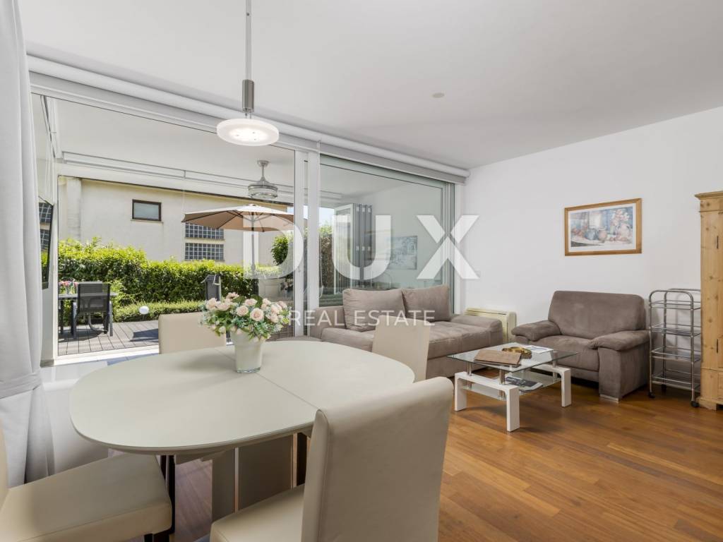 For seasonal rent we present an excellent apartment on the ground floor of a new building, size 65m2. The apartment has a wonderful layout - two bedrooms, one master and the other intended for one child, one bathroom with shower and a large living room with kitchen and dining room that opens onto a 25m2 glazed terrace. Even more important is access to your own garden of 120m2 with outdoor furniture and barbecue. There are 4 more apartments in the building and on the roof there is a common roof pool with a breathtaking panoramic view of the sea. Insulation, air conditioning in every room, parquet, custom-made kitchen, electric shutters, burglar-proof doors, 2 private parking spaces, rooftop swimming pool, fiber optic internet, quiet and private street, private garden, a significant amount of daylight, are just some of the advantages of this a wonderful and warm home. The building is located a two-minute drive from Ičići beach or a 10-minute walk downhill - in one of the most beautiful streets of Ičići. The price is 850 per month for the entire apartment + utilities, and it refers to the winter rental period from 01.10.-01.06. There is a possibility of long-term rental throughout the year at a higher price (due to the usual tourist rental).