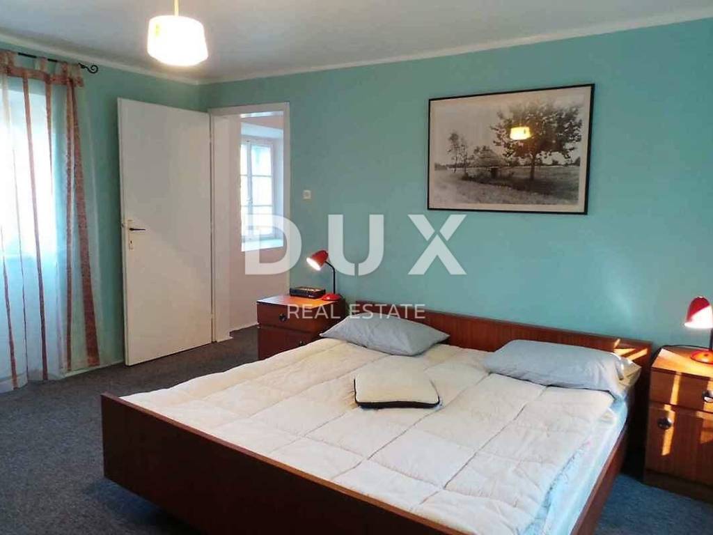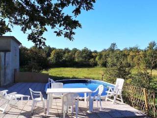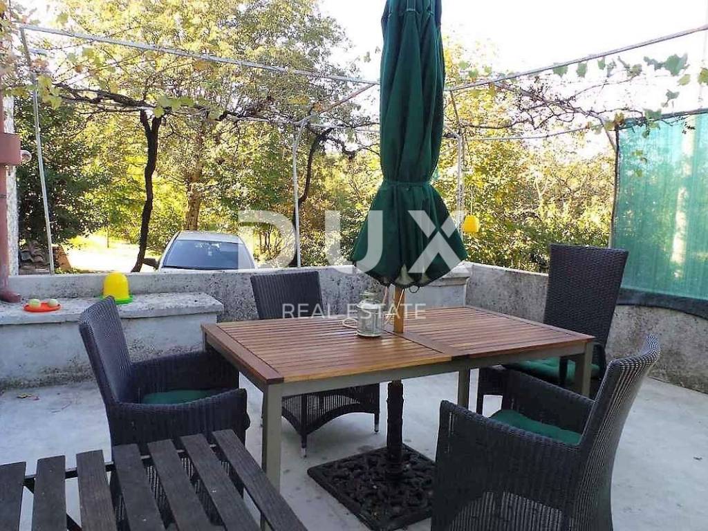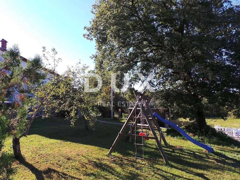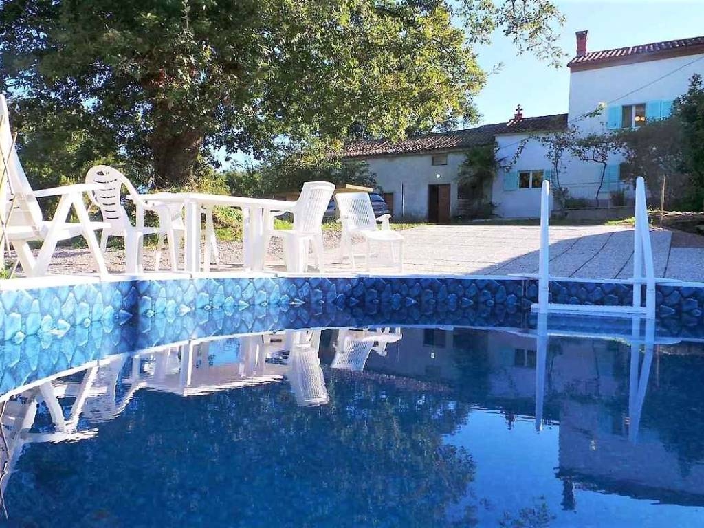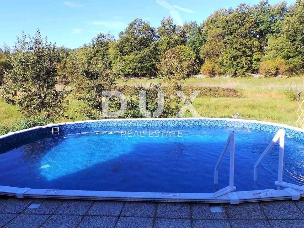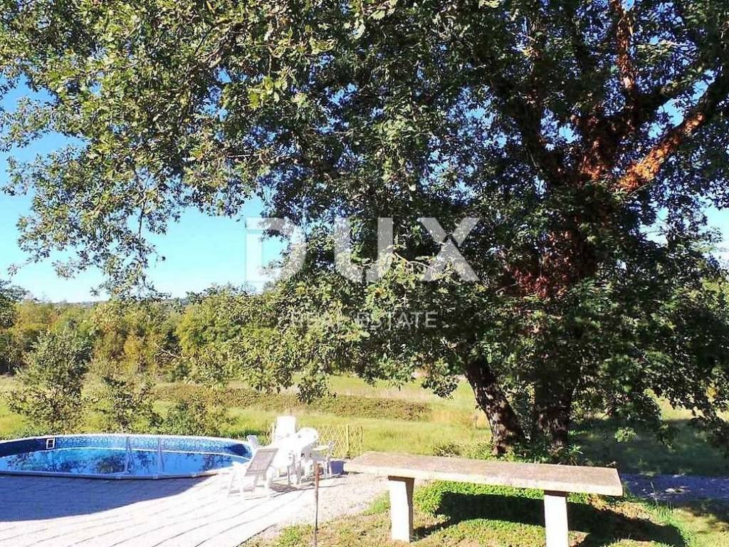 In the vicinity of the town of Labin, at the very end of the village, a house with a swimming pool and a spacious plot of land is for sale. The living space of the adapted house extends through the ground floor and first floor. On the ground floor there is a living room, a kitchen with a dining room, a bathroom and a hallway with access to a terrace with an old barn. There is also a tavern with an open fireplace on the ground floor. There are two bedrooms on the first floor. Next to the house there is a garage and in the yard an above-ground swimming pool with a sunbathing area, a covered barbecue and a children's playground. The house can be upgraded, and the rest of the spacious garden consists of a vineyard, orchard, pasture and forest. This secluded property surrounded by nature is an ideal opportunity for family life or as an investment for rental for tourist purposes.