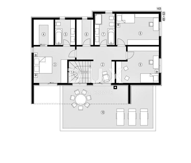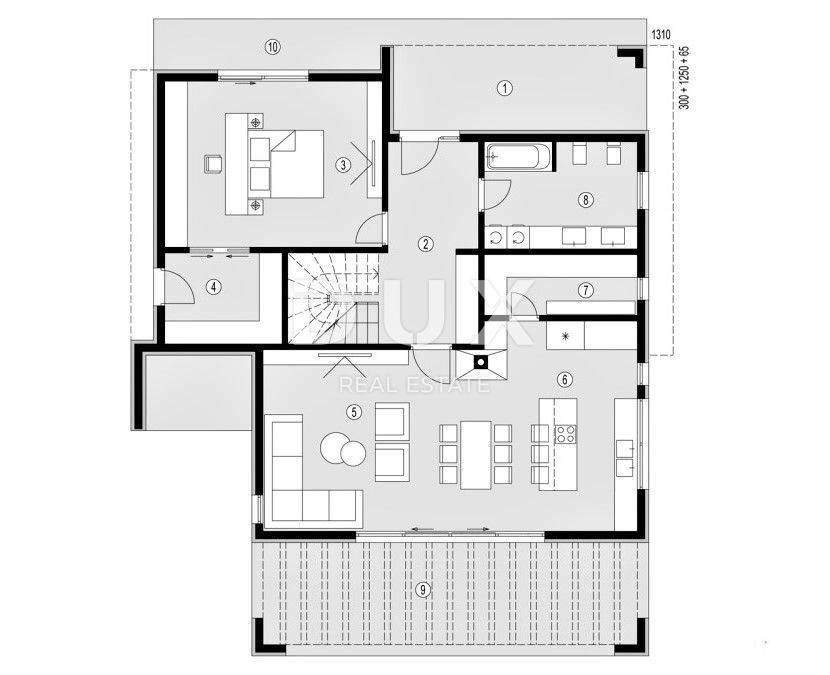 A modern villa with a living area of 330 m2 on a plot of 1200 m2 with a swimming pool of 50 m2 is for sale. It consists of ground and first floor. The living room and kitchen with dining room are designed according to the principle of open space with a view of the terrace. The covered terrace has a lounge corner and a dining room. In the yard there is also a swimming pool with a sunbathing area that serves as a perfect place to relax. The villa has 4 bedrooms, each with its own private bathroom. The parking lot has 2 parking spaces. The kitchen is a Veneta Cucine brand, made according to the standards of environmental protection and sustainability, with elements of 100% recycled wood composite and high-quality materials. The carpentry is of the best quality, aluminum anthracite with 3-layer glass and a closing system. The furniture is of the Enza home brand, which with its dynamism, quality and design gives a special touch to the interior of this villa. Ideal property for investment for the purpose of tourist rental or for a family home.