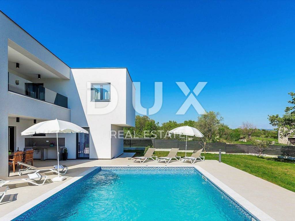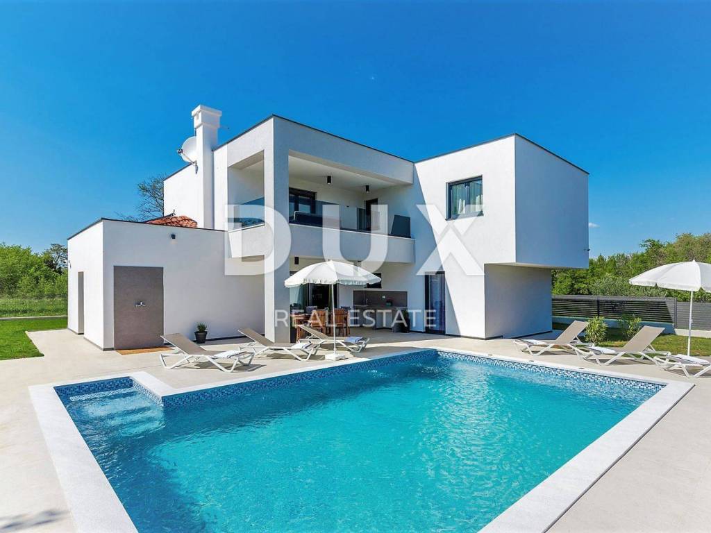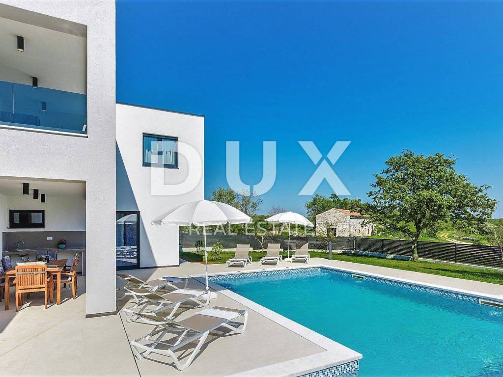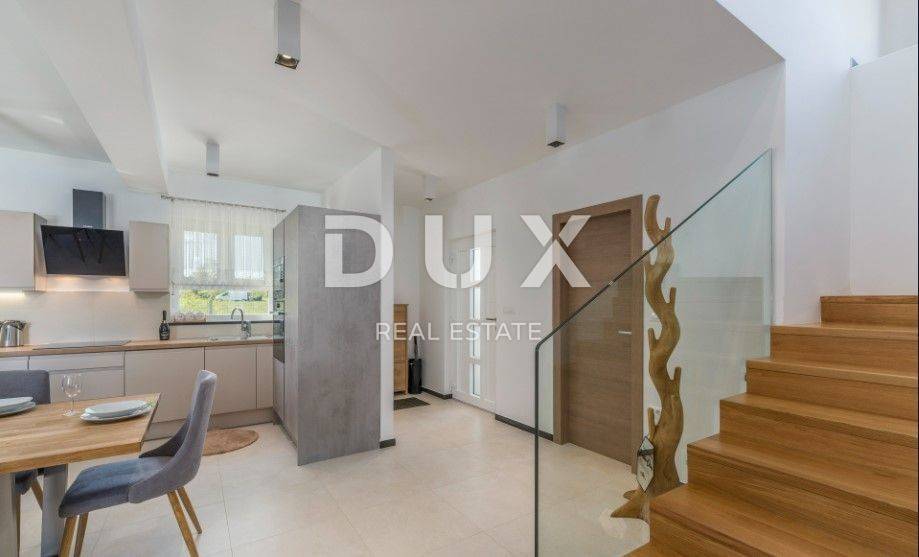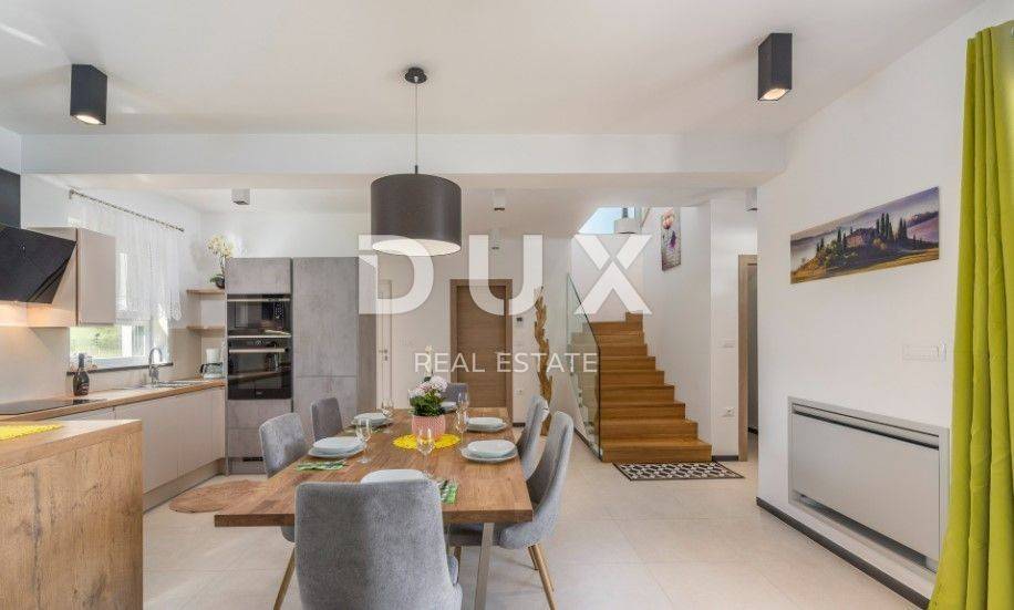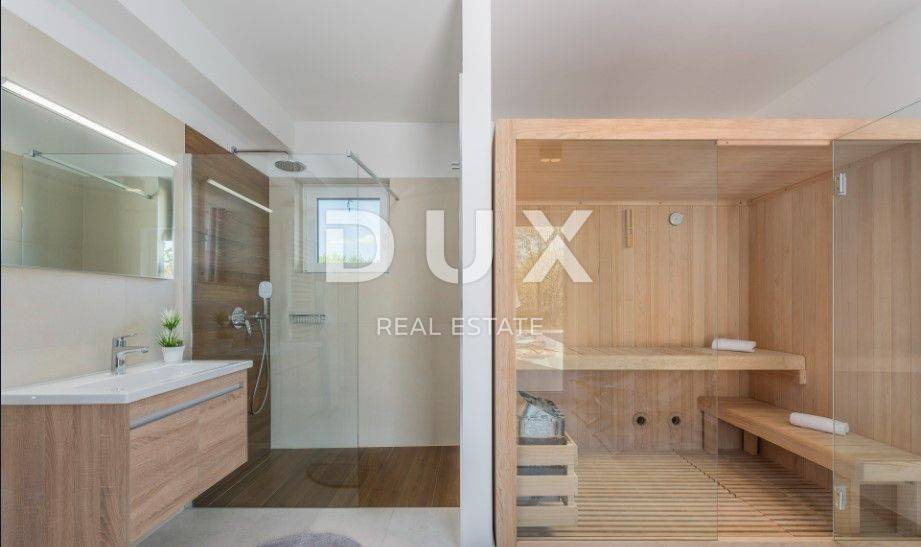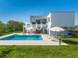 In a small town nearby This modern detached villa of 144m2 is located in Pula on a plot of 1001 m2 and a swimming pool of 40m2. It consists of ground and first floor. The ground floor has an open space with kitchen and dining area, living room and area with sauna. The living room opens onto a terrace with a swimming pool and a children's playground. Upstairs are 3 bedrooms each with its own private bathroom. In the hallway there is an exit to the common terrace which offers a view of the Istrian hills and the sea in the distance. The villa is fully air conditioned and has underfloor heating. The parking lot is fenced with 3 parking spaces. This property is a great opportunity for investment, as it is located in a well-established tourist rental or for a quiet family life close to all amenities and the sea.
