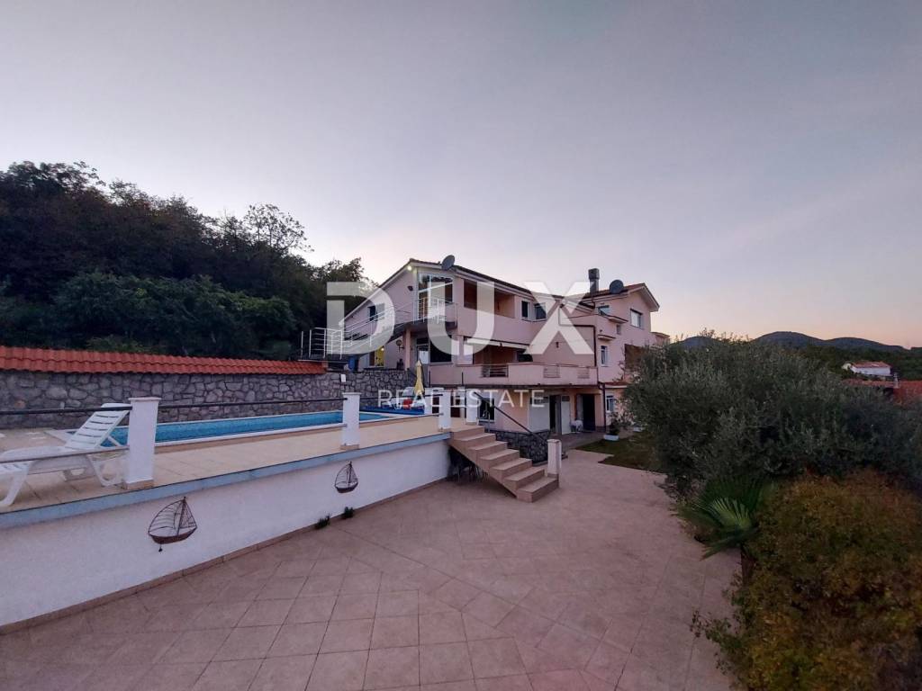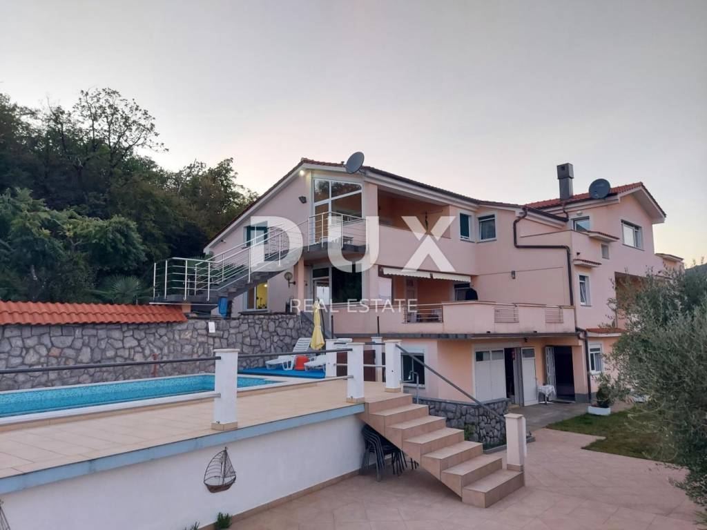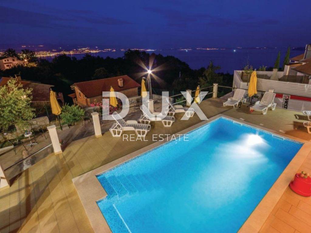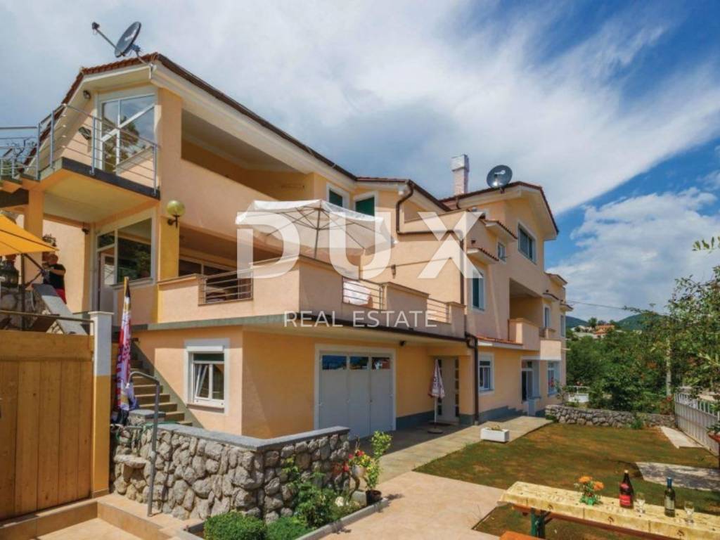 The house is south oriented with a beautiful panoramic view of the entire Kvarner Bay and islands! The villa consists of 2 parts. The first part where there are 4 apartments and a garage space and the part where there are 2 large apartments with a pool. In the first part are 2 larger apartments of approximately 100m2 (living room, kitchen, dining room, 2 bedrooms, tank and bathroom) and 2 smaller apartments of 50 m2 (living room, kitchen, 1 bedroom, wardrobe and bathroom). The garage on the ground floor is spacious, has space for at least 4 cars and several motorcycles and with a ceiling height above 3.5m2. The garage has a toilet and several rooms that can serve as storage for various things. In the second part of the villa there are 2 larger apartments and laundry rooms on the ground floor, total area of 100m2 which can also be converted into 1 larger or 2 smaller apartments or which can be used for gym, sauna, children's playroom and the like. Large apartment on the 1st floor consists of living room, dining room, kitchen, 2 storage rooms, 4 bedrooms and a bathroom. The apartment on the 2nd floor consists of a living room, dining room, kitchen, storage room, 2 bedrooms and a bathroom. Both apartments in this part have large covered terraces with beautiful sea and pool views. GARDEN: The garden is arranged and constantly maintained for many years. It contains a fireplace and an underground cistern called rainwater collection tanks with a volume of 30m3. In the garden there is a swimming pool with a beautiful view of the sea, the Kvarner Bay and the islands. Currently, the owners also have a garden where they grow a few types of vegetables, and several fruit trees grow in the yard. In front of the villa there are 6 marked parking spaces. Clean and tidy property. Profitable throughout the summer season. Certainly a beautiful property for a luxurious family life, but also suitable as an investment in the form of tourism. UNIQUE PROPERTY DEFINITELY WORTH ATTENTION IN A GREAT LOCATION !!!