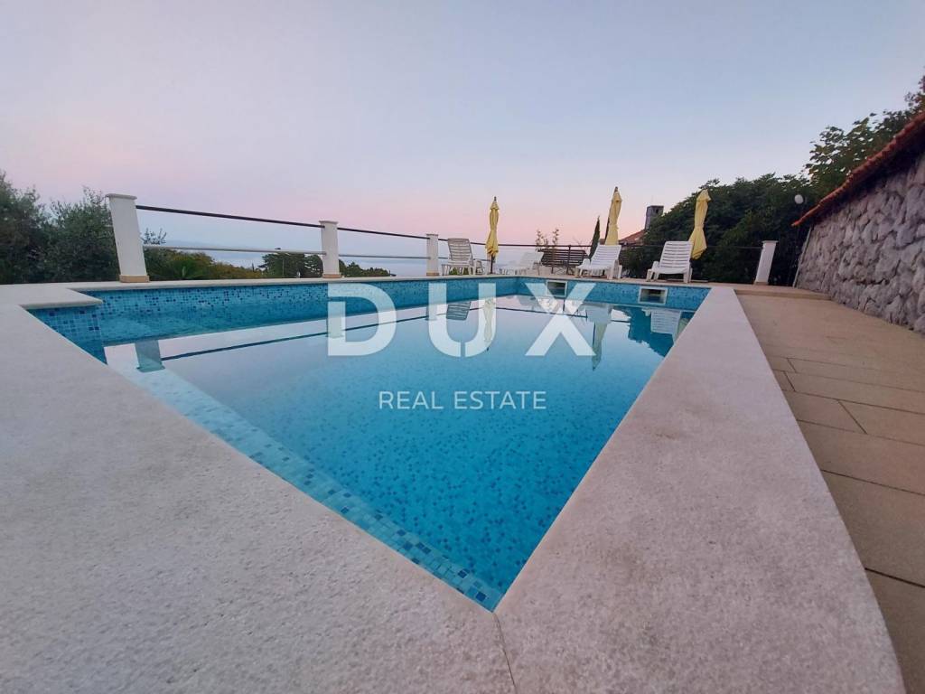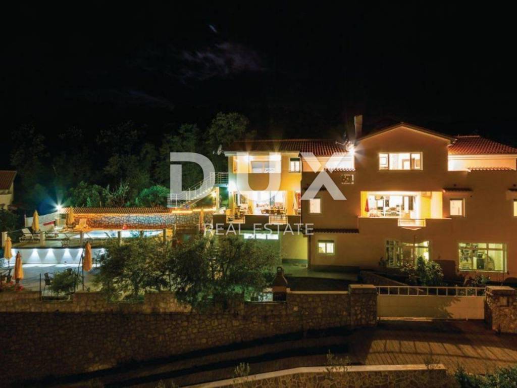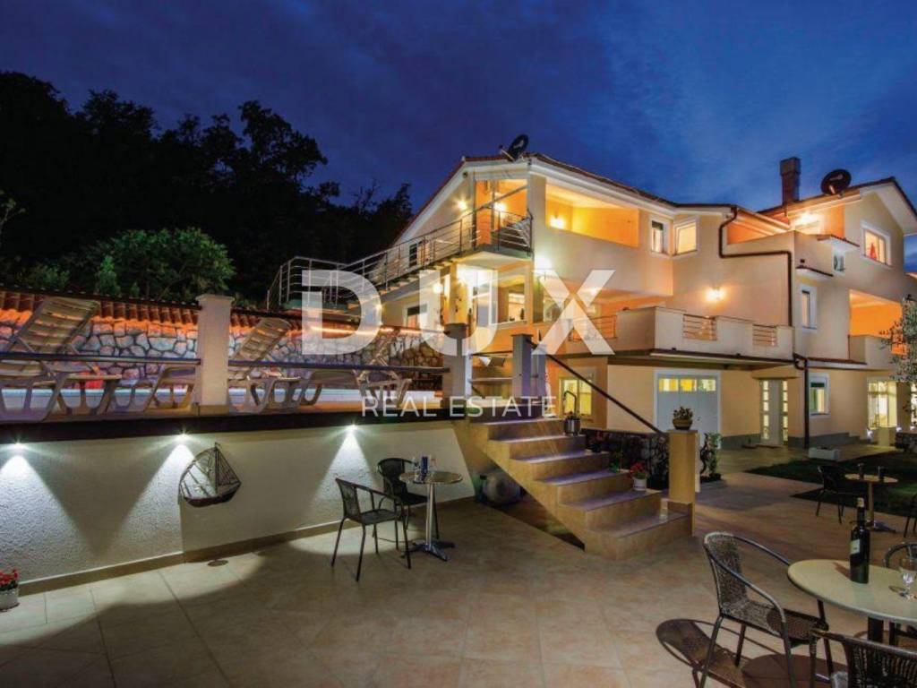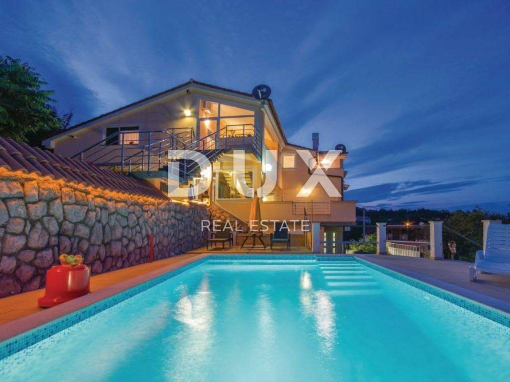 The house is south oriented with a beautiful panoramic view of the entire Kvarner Bay and islands! The villa consists of 2 parts. The first part where there are 4 apartments and a garage space and the part where there are 2 large apartments with a pool. In the first part are 2 larger apartments of approximately 100m2 (living room, kitchen, dining room, 2 bedrooms, tank and bathroom) and 2 smaller apartments of 50 m2 (living room, kitchen, 1 bedroom, wardrobe and bathroom). The garage on the ground floor is spacious, has space for at least 4 cars and several motorcycles and with a ceiling height above 3.5m2. The garage has a toilet and several rooms that can serve as storage for various things. In the second part of the villa there are 2 larger apartments and laundry rooms on the ground floor, total area of 100m2 which can also be converted into 1 larger or 2 smaller apartments or which can be used for gym, sauna, children's playroom and the like. Large apartment on the 1st floor consists of living room, dining room, kitchen, 2 storage rooms, 4 bedrooms and a bathroom. The apartment on the 2nd floor consists of a living room, dining room, kitchen, storage room, 2 bedrooms and a bathroom. Both apartments in this part have large covered terraces with beautiful sea and pool views. GARDEN: The garden is arranged and constantly maintained for many years. It contains a fireplace and an underground cistern called rainwater collection tanks with a volume of 30m3. In the garden there is a swimming pool with a beautiful view of the sea, the Kvarner Bay and the islands. Currently, the owners also have a garden where they grow a few types of vegetables, and several fruit trees grow in the yard. In front of the villa there are 6 marked parking spaces. Clean and tidy property. Profitable throughout the summer season. Certainly a beautiful property for a luxurious family life, but also suitable as an investment in the form of tourism. UNIQUE PROPERTY DEFINITELY WORTH ATTENTION IN A GREAT LOCATION !!!