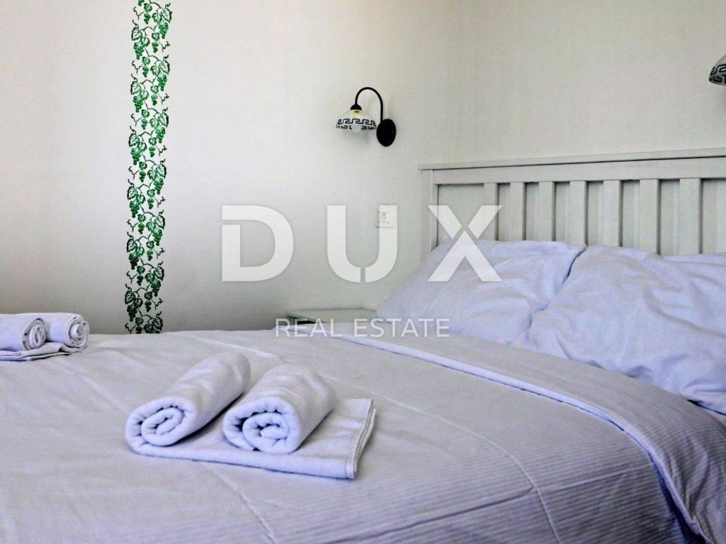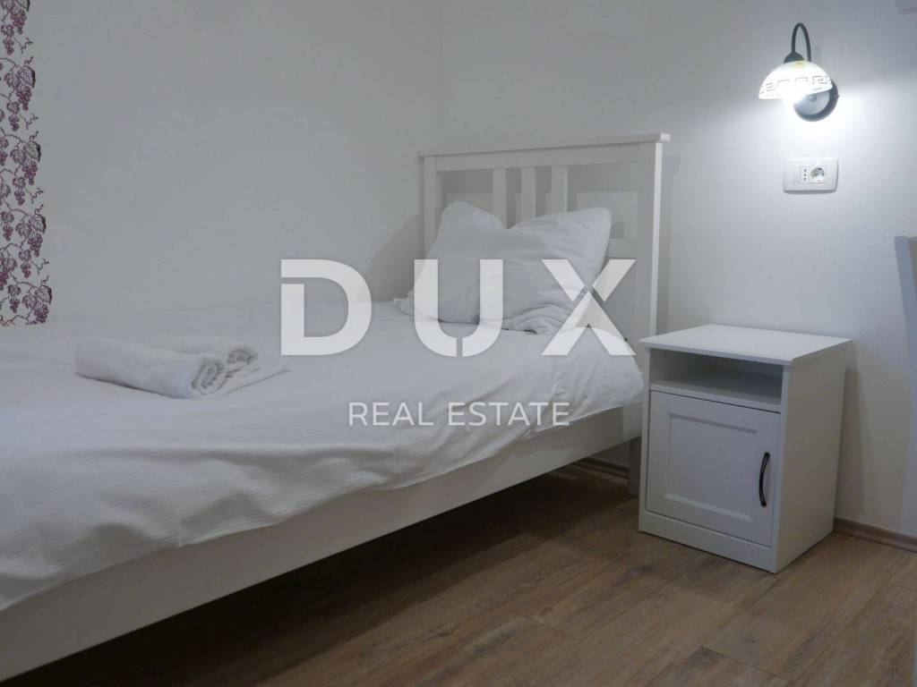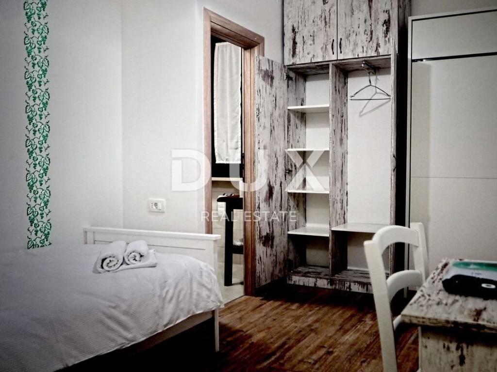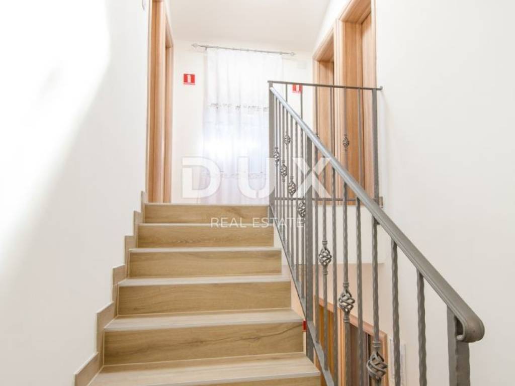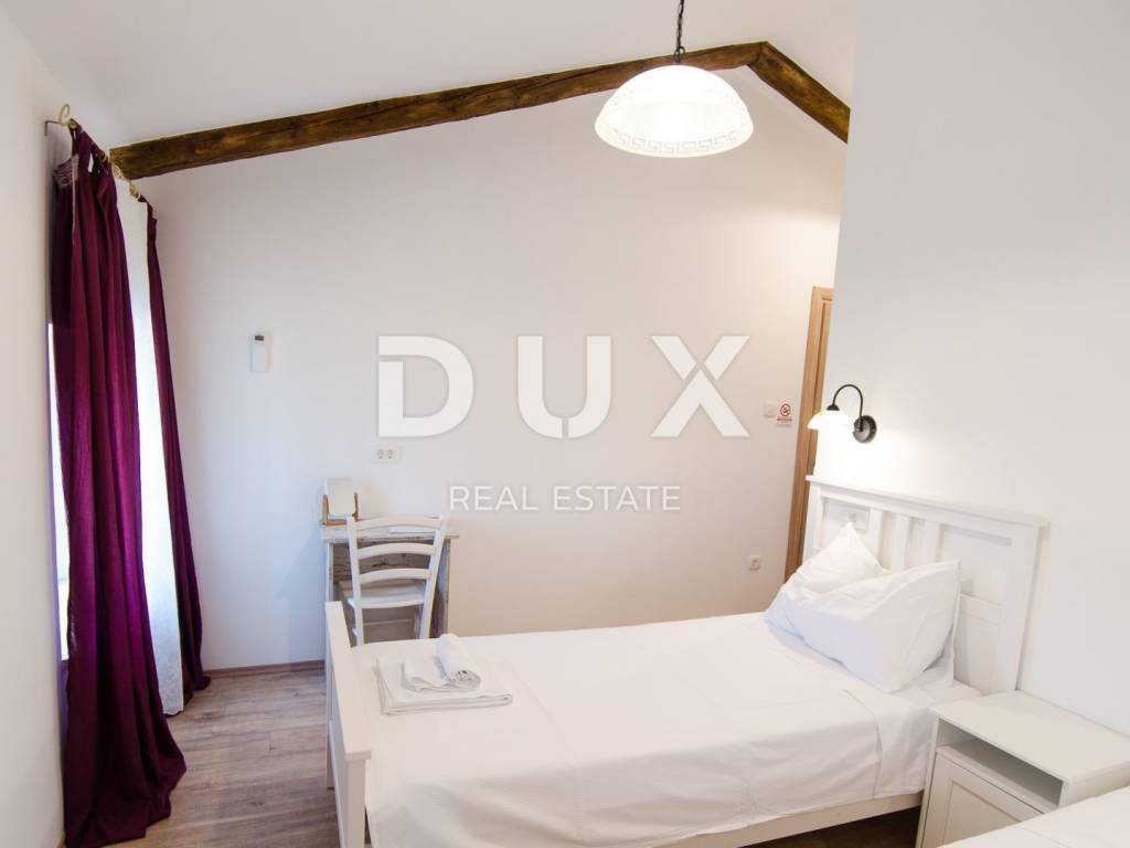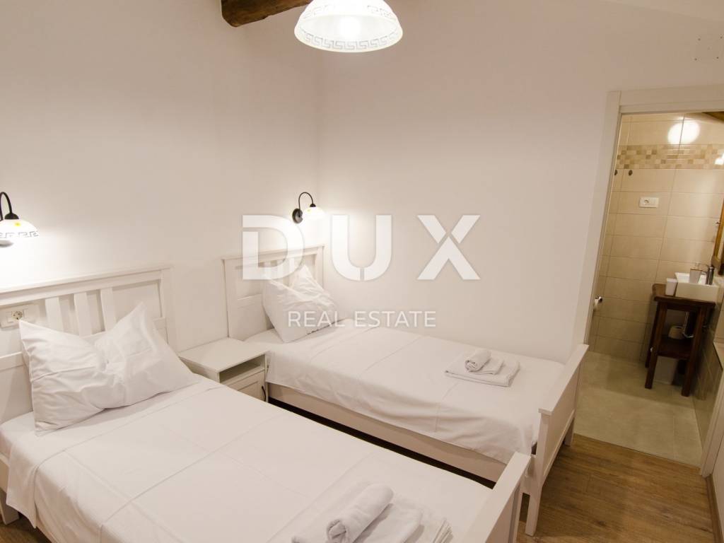 Not far from Motovun, there is an Istrian house built in 1910, which after renovation was converted into a tourist facility with a unique offer. The building consists of four floors, with a total area of 388 m2. On the ground floor there is a tavern with an outdoor terrace, kitchen, toilet for guests and staff, reception. In the inner part of the tavern, there is a fireplace which, in addition to creating an atmosphere, the ventilation system provides central heating. An internal staircase leads upstairs. The two floors are occupied by eight double rooms categorized with two stars. Each room has its own bathroom, air conditioning and TV and are attractively and thematically decorated, in accordance with the offer of the facility and in accordance with the view of the landscape made up of endless vineyards. The basement consists of a storage room and a wine cellar. The wine cellar is a special feature of this facility because, in addition to offering quality wines from local winemakers, it has a wine bank, the only one of its kind in Istria, which consists of 39 wine safes. The garden, with an area of 1500 m2, consists of a large parking lot and an orchard which is an after lunch lounge zone, where guests like to relax. The building was completely renovated in 2018, with new installations, new wall and floor coverings, exterior and interior carpentry, toilets, new roof, facade. Significant energy savings are enabled by solar heating of sanitary water. Internet and Wi-Fi are available on site. This facility, with its offer and interior, fits into the landscape and forms a complete oenological story, which promotes wine tourism and contributes to the recognizability of Motovun, its surroundings and the whole of Istria. Being located in a quiet location with a beautiful view of Motovun and the surrounding vineyards, this facility is an ideal place for vacation and an ideal opportunity to return the investment as it is a facility with a well-established business near the city that is active throughout the year. . There is a possibility of buying the surrounding construction land owned by the Republic of Croatia, which would allow future owners to expand the offer.