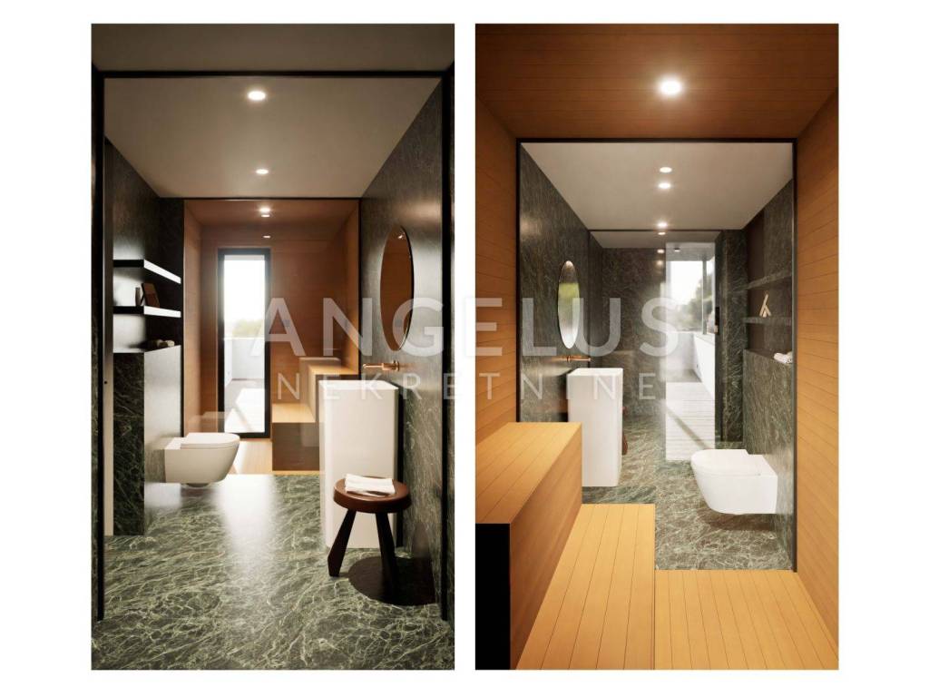 The luxurious apartment on sale is located in a contemporary urban villa with only three apartments; net usable area /NKP/ 130m2, 2 parking spaces in a garage of a surface area of 50m2, a covered terrace of 47,11m2 and a part of the garden of 95m2. The apartment consists of: an entryway with a wardrobe, a spacious living room, two bedrooms with bath of which one bedroom has direct access from the bathroom/sauna to a terrace with an ice bath. The large covered terrace offers a gorgeous view of the city and the cathedral and provides complete intimacy and privacy (50m2). At sublevel 1 there are two parking spaces belonging to the apartment and there is one outside parking space. The apartment can be accessed directly from the garage via an elevator that leads straight to the apartment.