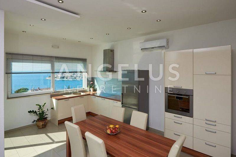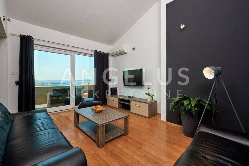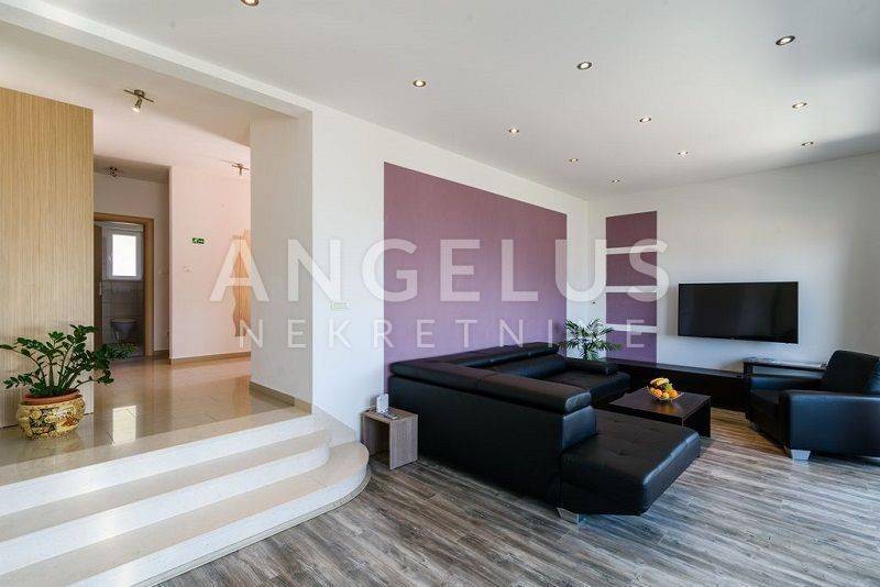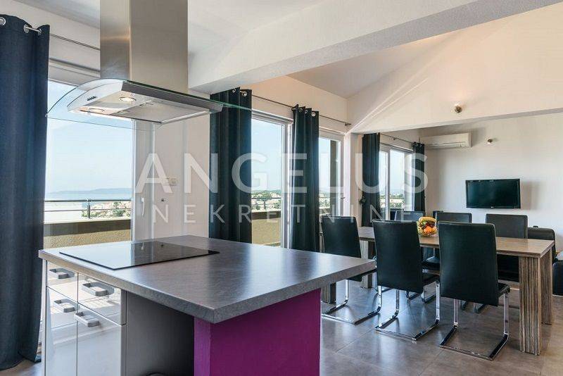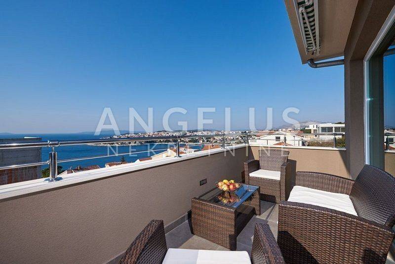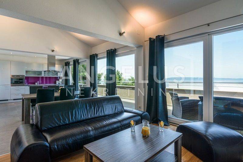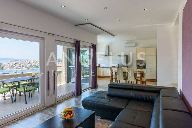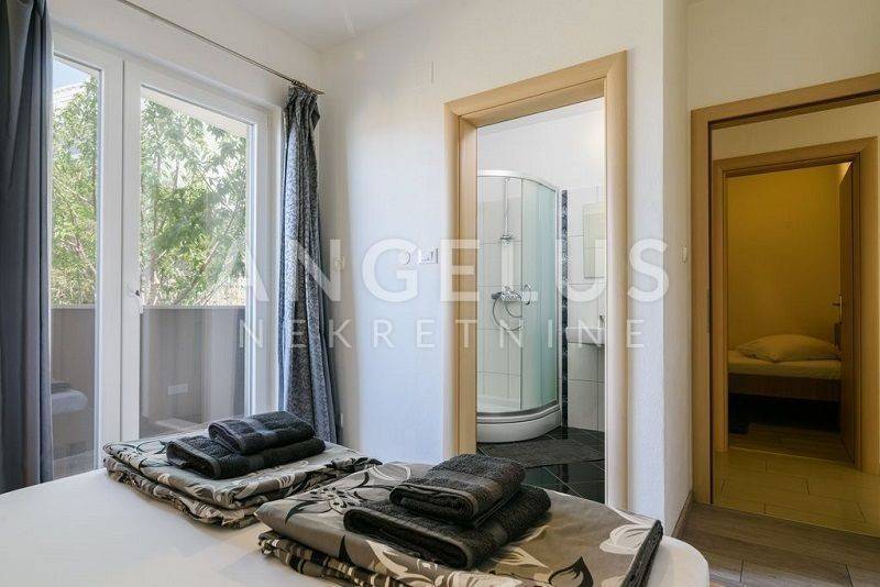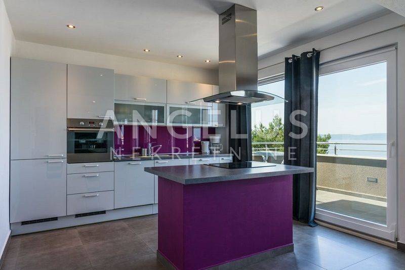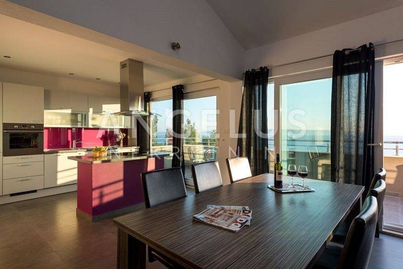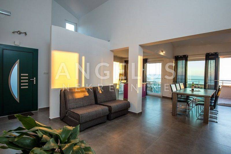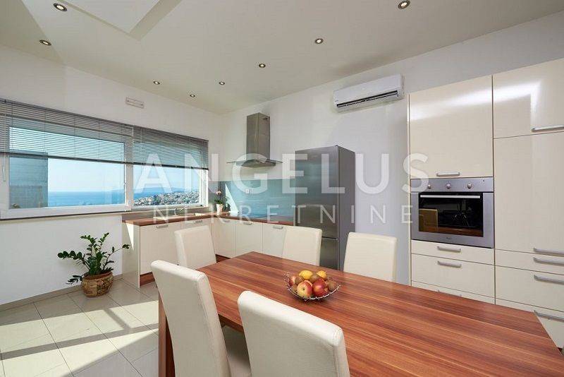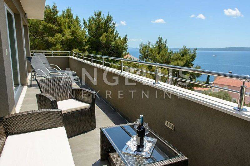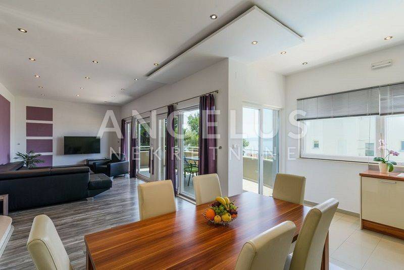 On the first floor there is a large, spacious apartment consisting of a hallway, a toilet, 2 bedrooms with a balcony overlooking which one bedroom has its own toilet and a large open space in the south with kitchen, dining and living room with exit on a large terrace. From the terrace there is a view of the sea and the islands of Drvenik and Šolta. In the living room there is a large glass wall over the entire length, so this whole area is very sunny.