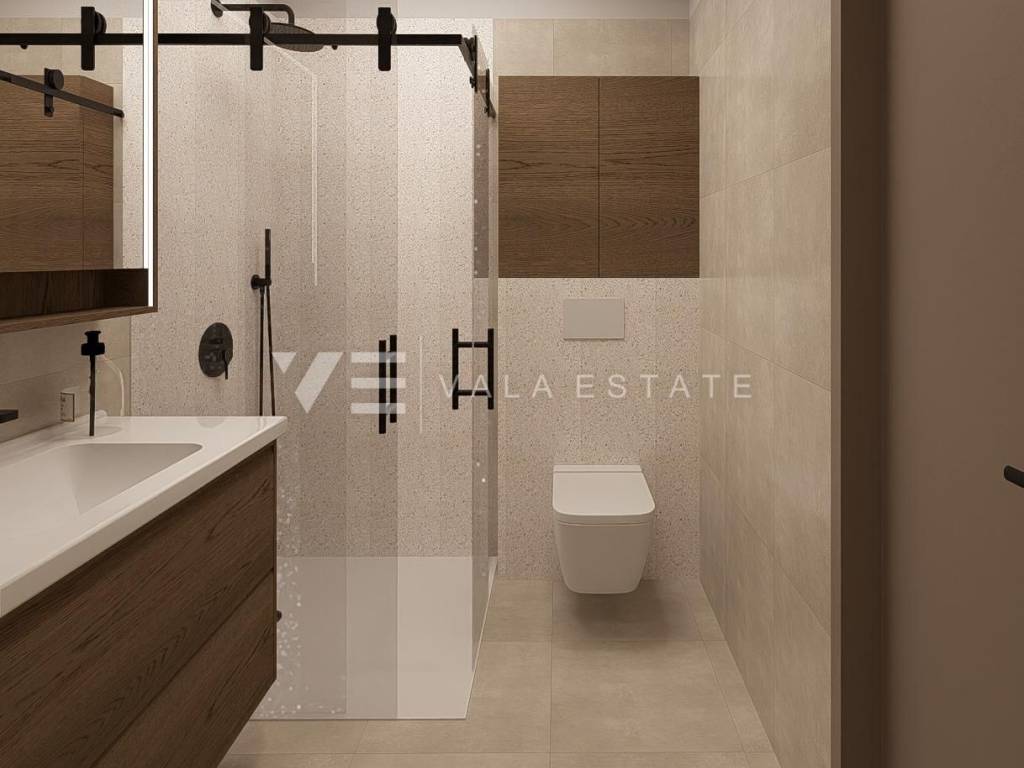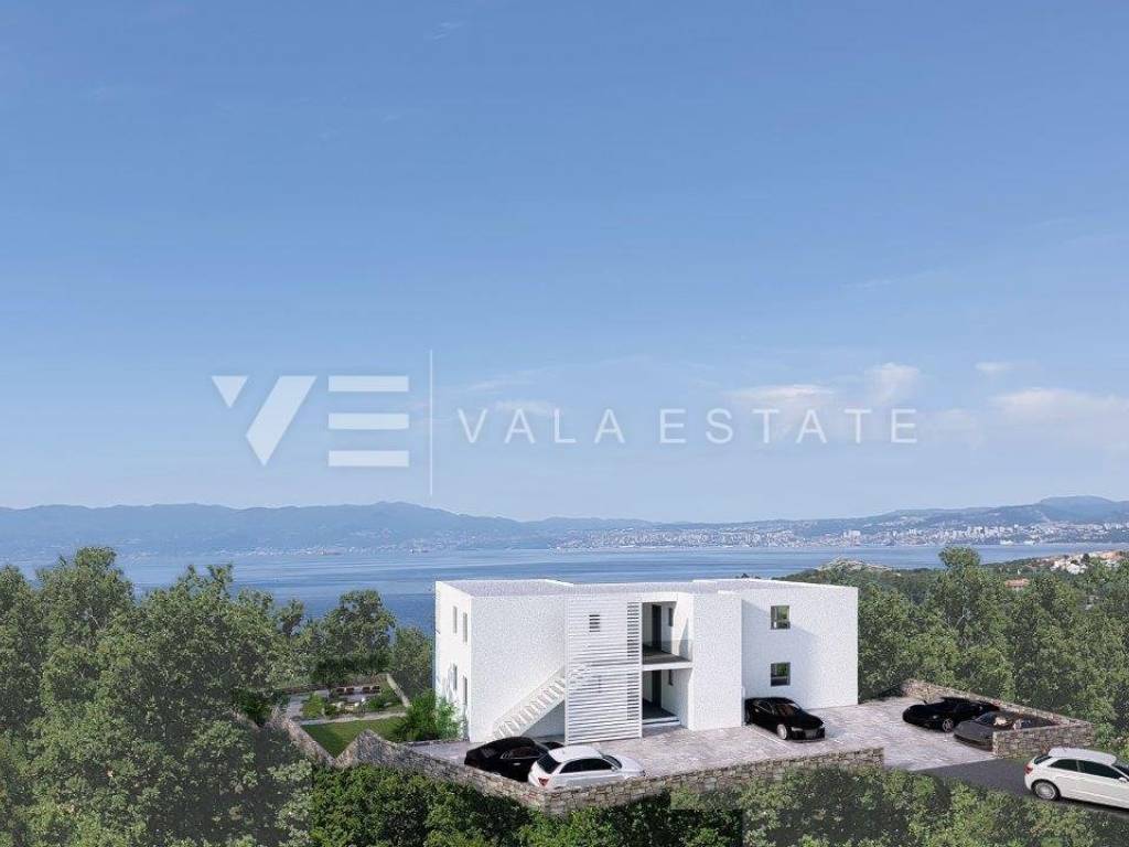 Real Estate Island of Krk, Omišalj - for sale is an apartment on the ground floor of a new building consisting of a total of six residential units. The apartment has a living area of 77 m2 and consists of an entrance area, two bedrooms, bathroom, kitchen, dining room and living room with access to a covered terrace and a garden of 70 m2. It has two parking spaces in the common courtyard of the building where chargers for charging electric vehicles will be installed. Quality materials and equipment are used for construction, including ceramic floor coverings, quality sanitary ware, underfloor heating with heat pump, air conditioning, smart home system, installed high-quality ALU joinery with ALU shutters and security doors. It is located in a prime location near the sea, beautiful beaches and the center with all necessary amenities. The property is currently under construction, and the planned completion is expected at the end of 2025.