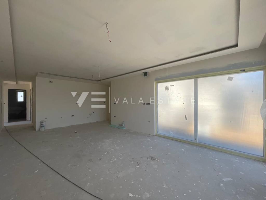 Real estate island of Krk, Njivice - modern two-storey apartment with a swimming pool for sale in a new building with four residential units in a prime location overlooking the sea. The apartment is located on the ground floor and first floor and occupies a total living area of 124,18 m2. It is arranged over an entrance hall, storage room, bedroom, bathroom, living room with kitchen and dining area on the ground floor and the first floor where there is an internal staircase, hallway, two bedrooms, bathroom and a covered balcony with a sea view. It has a garden of 70 m2 with a 20 m2 swimming pool, two parking spaces in the garage and a storage room. Quality materials and equipment were used for the construction, including ceramic floor coverings, quality sanitary ware, underfloor heating with a heat pump, Fan-coil multi split air conditioning, video surveillance, built-in high-quality ALU joinery and security doors. It is located in a prime location near the sea, beautiful beaches and the center with all necessary amenities. The property is currently under construction, with completion expected by the end of 2025.