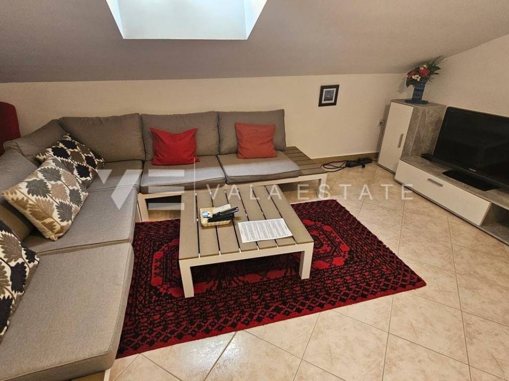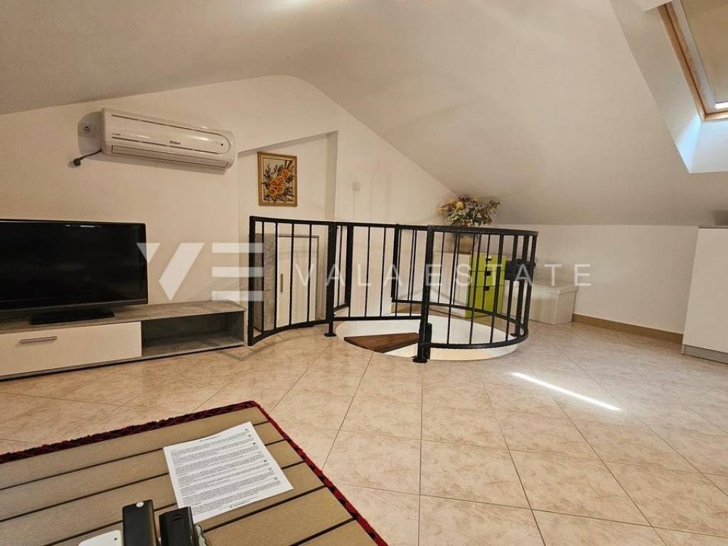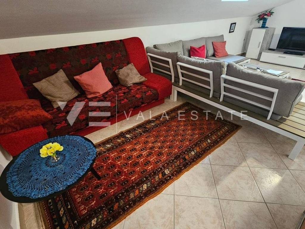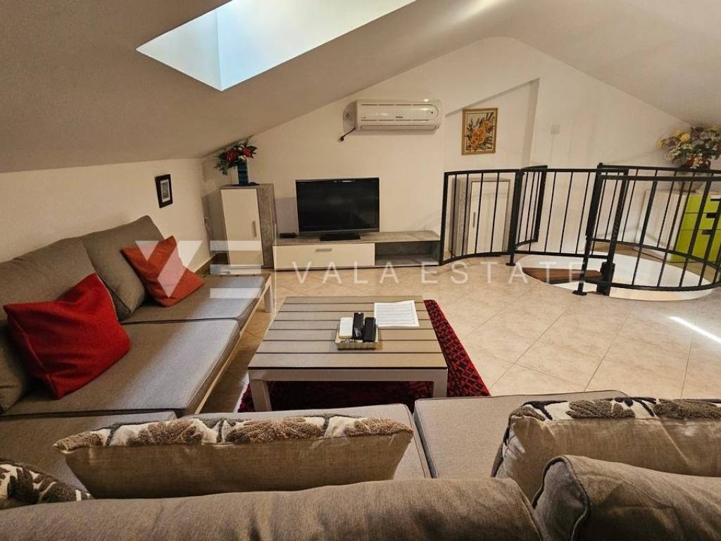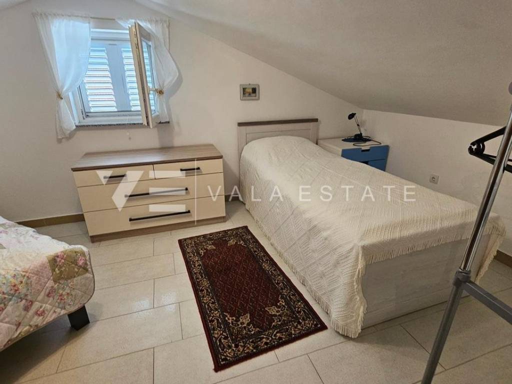 Real estate island of Krk, Soline bay - for sale is a comfortable two-storey apartment on the first floor of a multi-family house in a prime location just 120 m from the sea, beautiful beaches and near the town center. The total living area of 84 m2 is distributed on the first floor, which includes an entrance area, bathroom, two bedrooms and a kitchen with a dining area with access to a covered balcony overlooking the sea, and a high attic connected by internal stairs with a living room, bedroom and bathroom. It has one parking space in the shared courtyard of the house. The apartment is of high quality construction and equipment, is sold fully furnished, air-conditioned, has PVC joinery, neat documentation and is ready to move in. Due to its location, it is an excellent opportunity for personal use or for tourist rental.