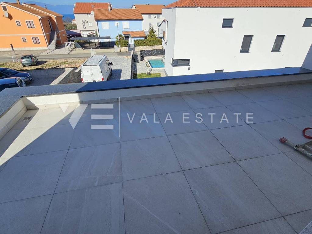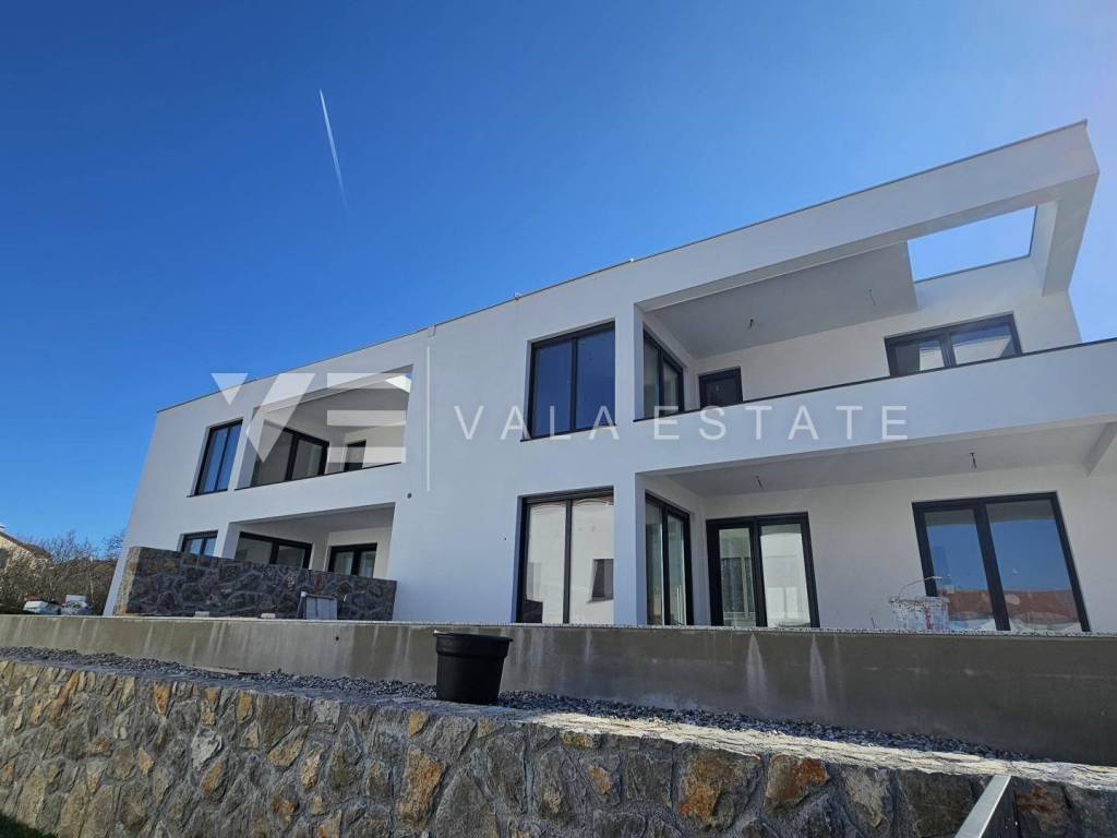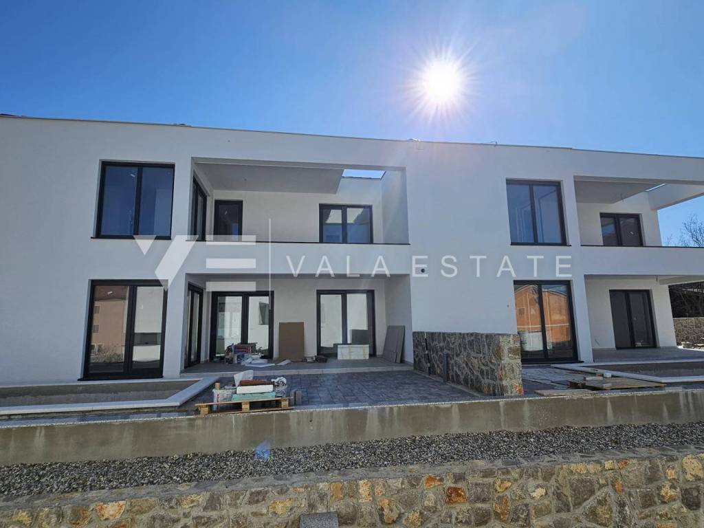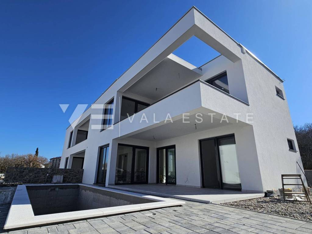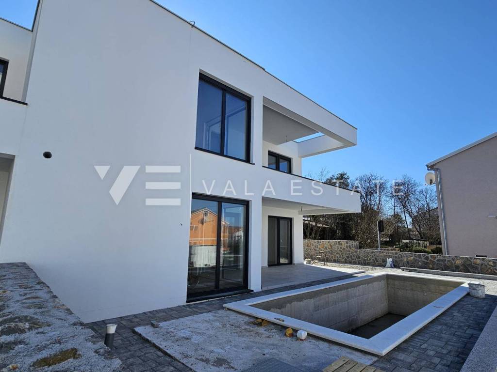 Real estate on the island of Krk, Malinska - a new semi-detached house with a swimming pool and sea view in a prime location is for sale. The house is spread over two floors, covering a total of 143 m2 of living space. The ground floor has an entrance hall, toilet, bedroom, kitchen and dining area, as well as a living room with access to a covered terrace and garden. On the first floor there are three bedrooms, each with its own bathroom and access to a terrace with a sea view. The beautifully landscaped garden has a swimming pool with a sundeck, a summer kitchen and space for two parking spaces. It is worth noting additional features - quality materials and equipment that include high-quality ceramic floor coverings, quality sanitary ware, multi-split air conditioning, underfloor heating with a heat pump, installed high-quality PVC joinery and security doors. The property is currently under construction, and the planned completion is expected in mid-2025. It is located in an attractive location near beautiful beaches and the center with all necessary amenities. This property is subject to VAT.
