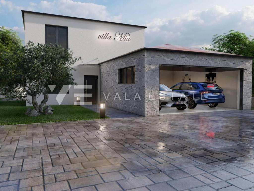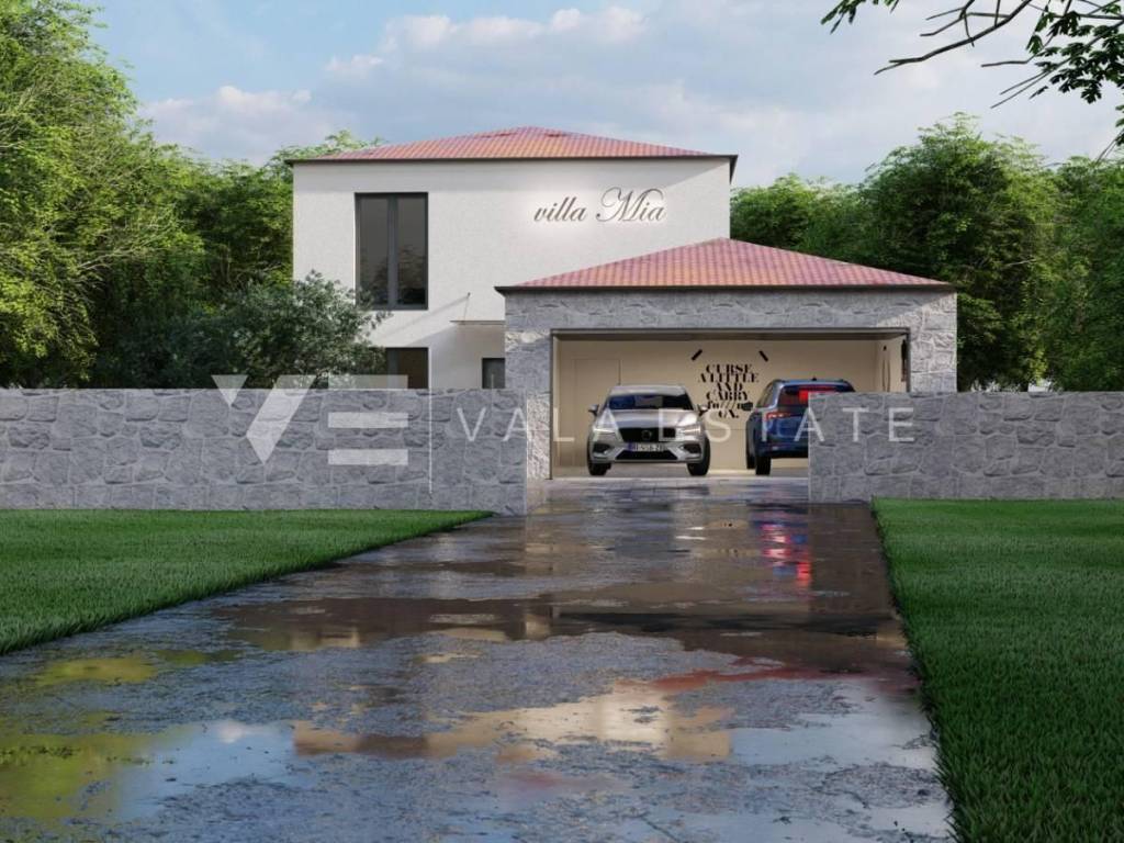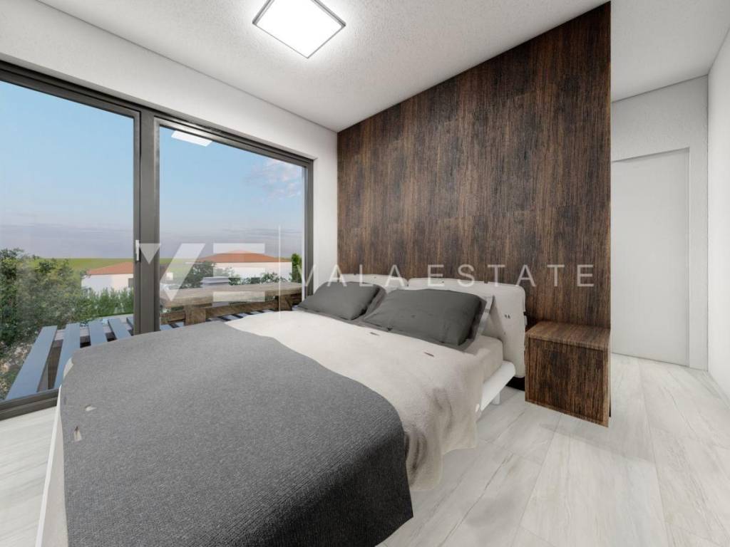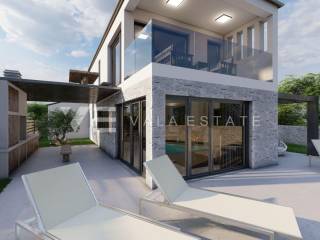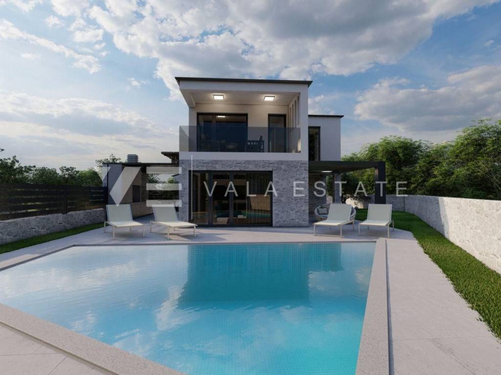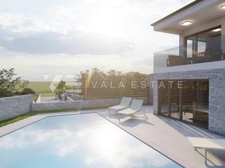 Real estate island Krk, Malinska - new detached house for sale with pool and garage in a great location. The house is located on a plot of 548 m2 and is spread over two floors with a total of 166 m2 of living space. On the ground floor there is an entrance area, a toilet, a bedroom with its own bathroom, a kitchen and a dining area, and a living room with access to a covered terrace and garden. On the first floor there is a bathroom, three bedrooms, one of which has its own dressing room and bathroom, and one with access to a common terrace with a view of the sea. There is a swimming pool with a sunbathing area, a summer kitchen and a garage with two parking spaces in the beautifully landscaped garden. It is worth noting additional features - quality materials and equipment that include floor coverings made of high-quality ceramics, quality sanitary facilities, multisplit air conditioning, underfloor heating, built-in high-quality PVC joinery and security doors. The property is currently under construction, and the planned completion is expected at the end of 2025. It is located in an attractive location only 850 m from beautiful beaches.