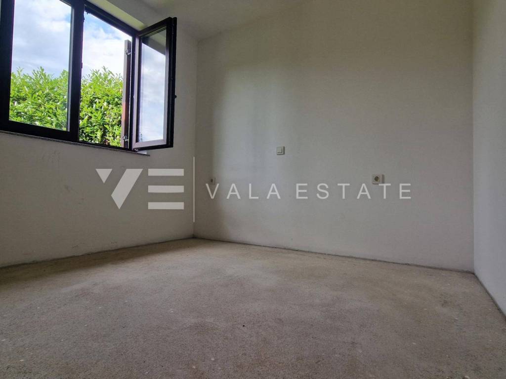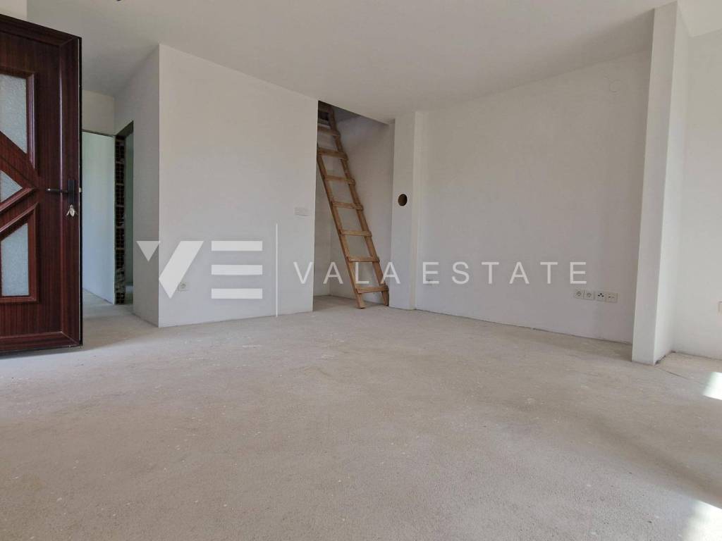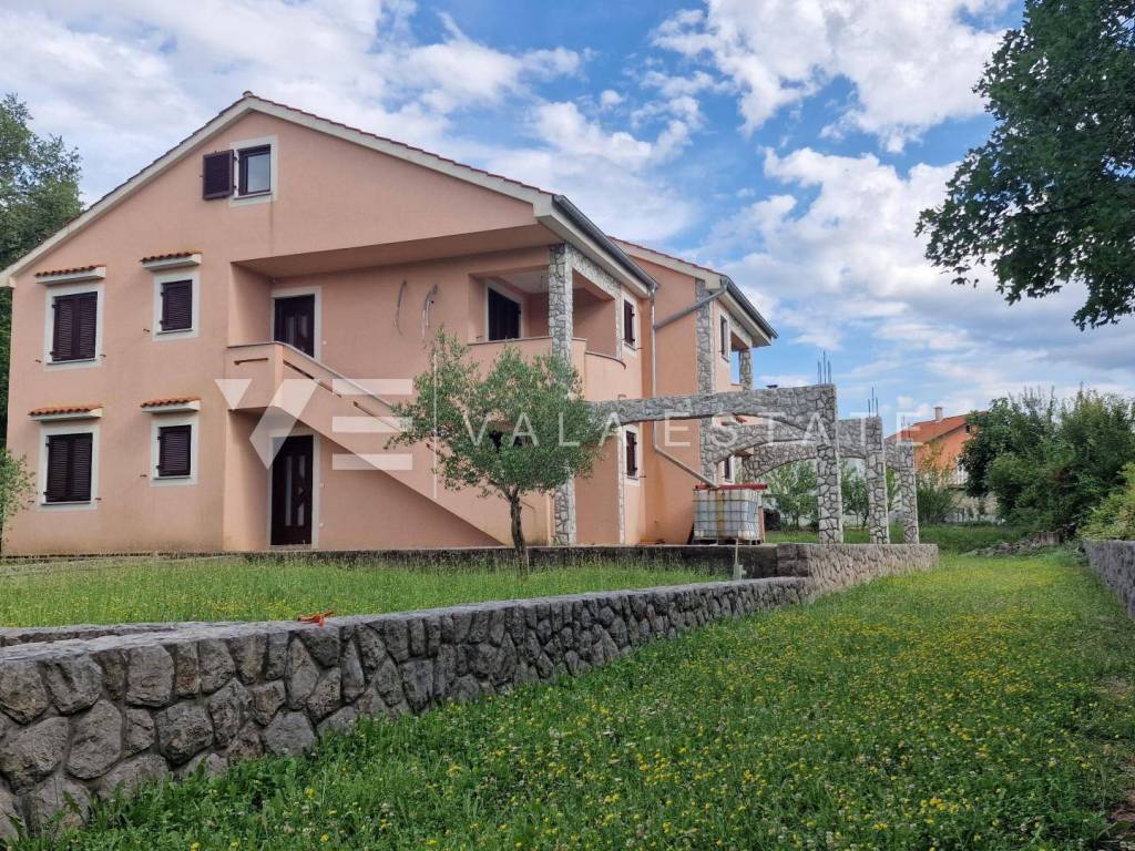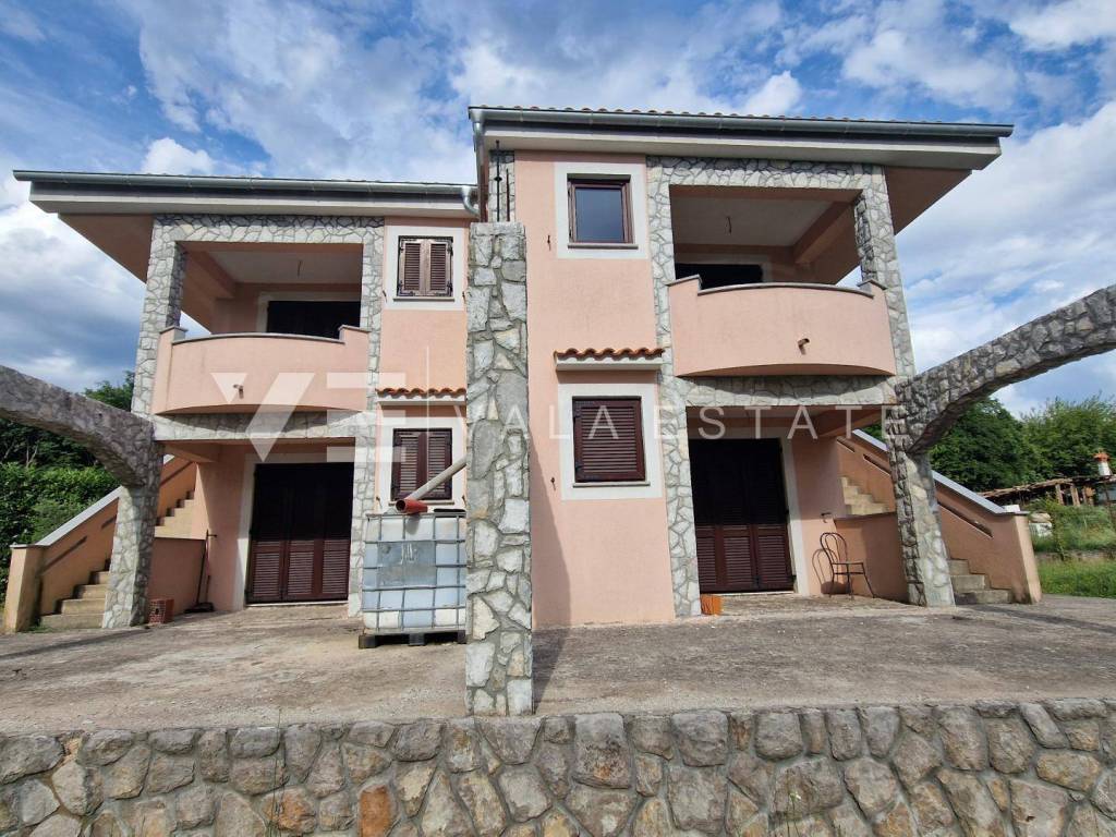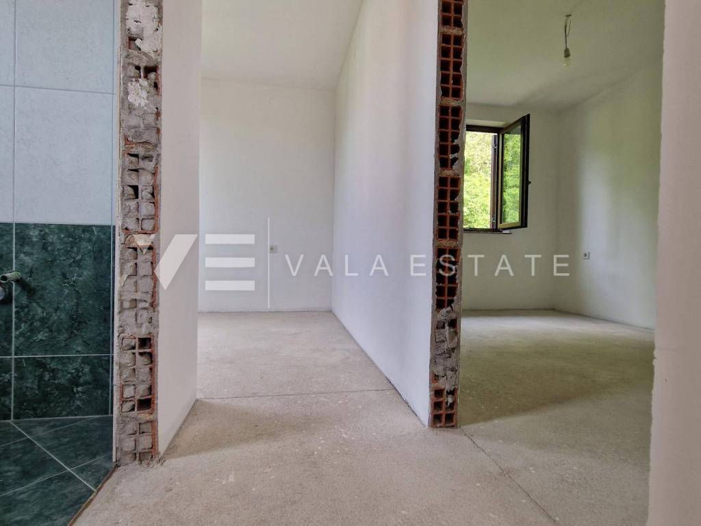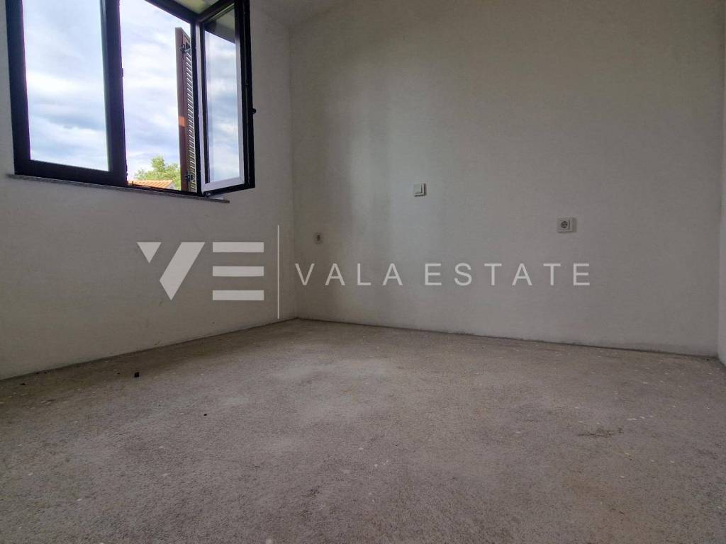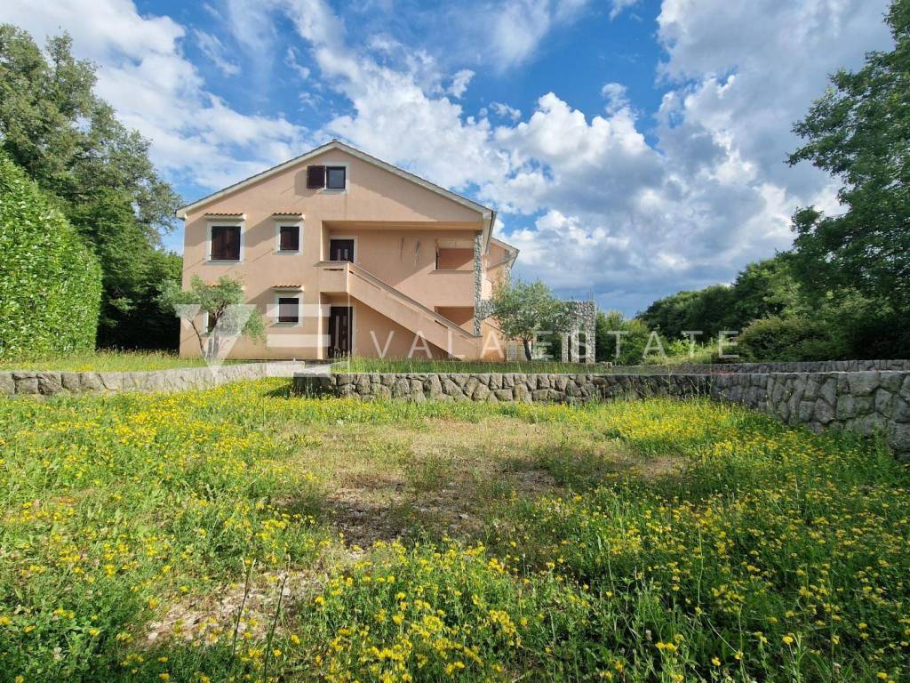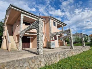 Real estate island Krk, Dobrinj surroundings - for sale is a semi-detached house with two separate residential units with a total living area of 112.98 m2. The floors are separated by entrances and meters and have a similar layout and square footage. On the ground floor there is a two-room apartment consisting of an entrance hall, a bathroom, two bedrooms, a living room, a kitchen with a dining room and a living room with access to a covered terrace and garden. An external staircase leads to the first floor, which includes an entrance hall, bathroom, two bedrooms, kitchen, dining room, living room with access to a covered balcony and space in the attic. It has a garden of 272 m2 and two parking spaces. The house was built in 2020 and needs to be completed. The location is beautiful and peaceful, surrounded by greenery and forest, 4000 m from the beaches and 700 m from the center. It is ideal for lovers of nature, peace and quiet.